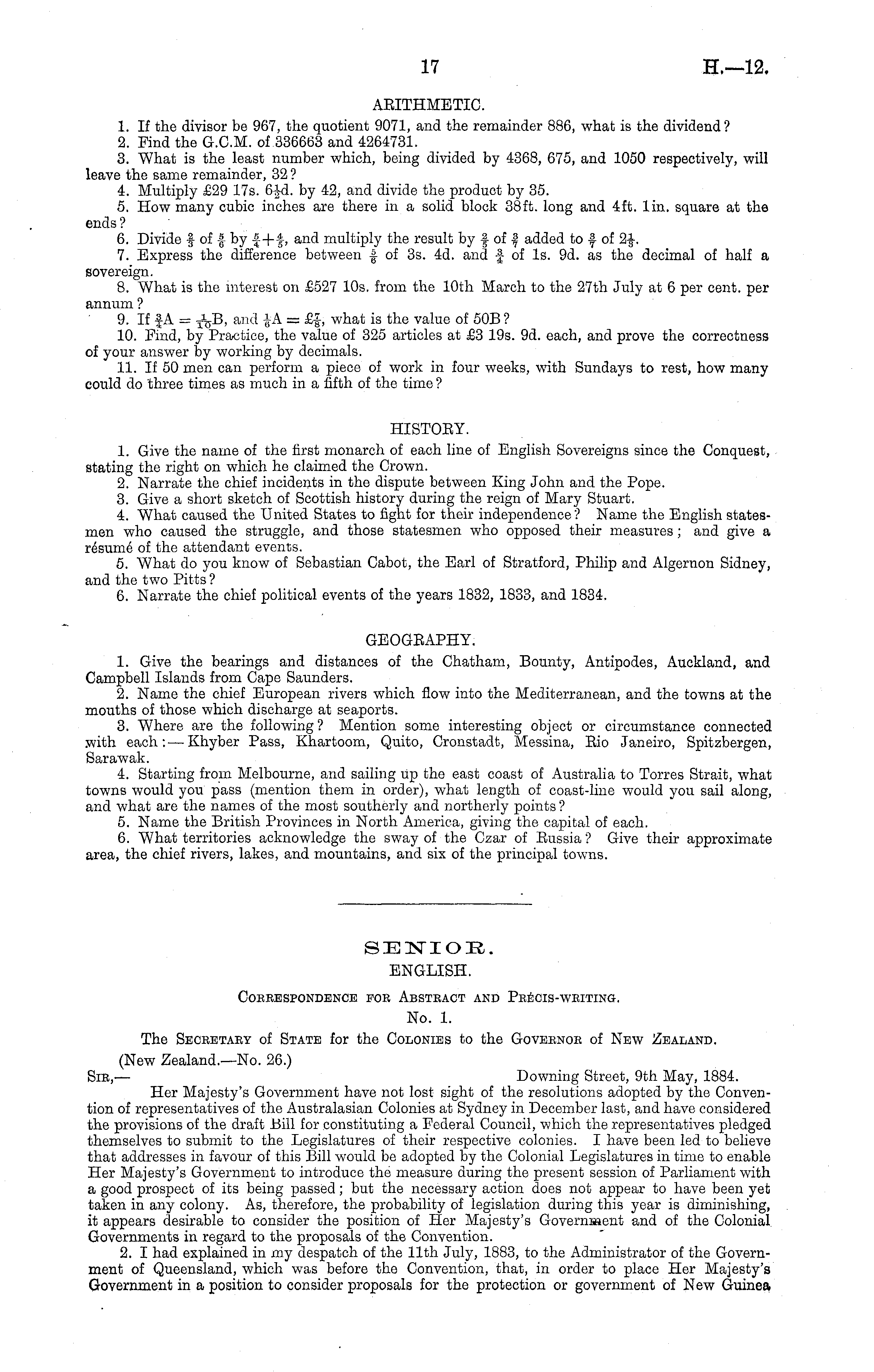 SENIOR. ENGLISH. Cobbespondence foe Absteact and Pe^cis-weiting. No. 1. The Seceetaey of State for the Colonies to the Goveenoe of New Zealand. (New Zealand.—No. 26.) Sie,— Downing Street, 9th May, 1884. Her Majesty's Government have not lost sight of the resolutions adopted by the Convention of representatives of the Australasian Colonies at Sydney in December last, and have considered the provisions of the draft Bill for constituting a Federal Council, which the representatives pledged themselves to submit to the Legislatures of their respective colonies. I have been led to believe that addresses in favour of this Bill would be adopted by the Colonial Legislatures in time to enable Her Majesty's Government to introduce the measure during the present session of Parliament with a good prospect of its being passed; but the necessary action does not appear to have been yet taken in any colony. As, therefore, the probability of legislation during this year is diminishing, it appears desirable to consider the position of Her Majesty's Government and of the Colonial Governments in regard to the proposals of the Convention. 2. I had explained in my despatch of the 11th July, 1883, to the Administrator of the Government of Queensland, which was before the Convention, that, in order to place Her Majesty's Government in a position to consider proposals for the protection or government of New Guinea