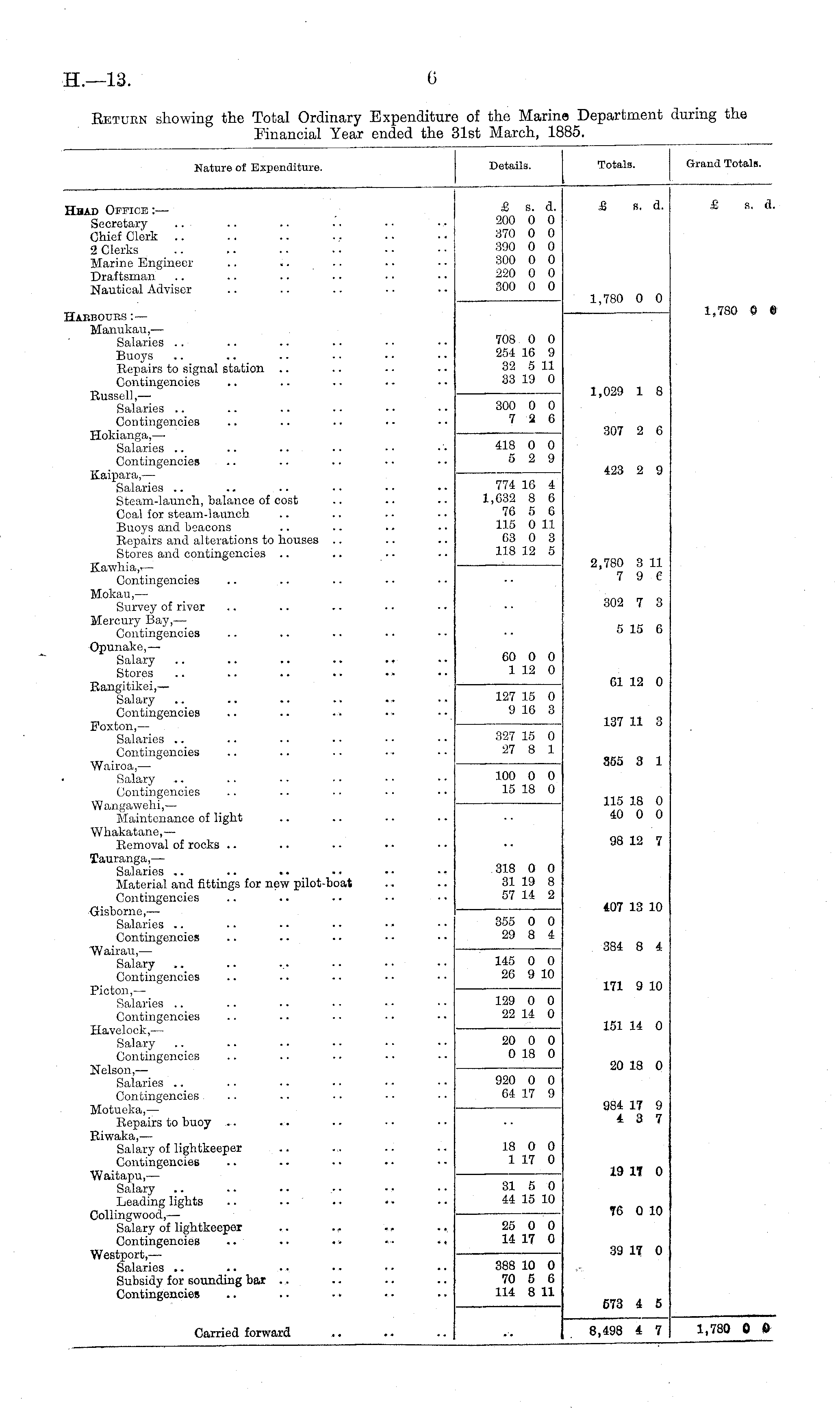 Nature of Expenditure. Details. Totals. Grand Totals. Huad Office :— Secretary Chief Clerk .. 2 Clerks Marine Engineer .. .. Draftsman Nautical Adviser £ s. d. 200 0 0 370 0 0 390 0 0 300 0 0 220 0 0 300 0 0 £ S. d. £ s. d. 1,780 0 0 1,780 0 0 Habeours :— Manukau, — Salaries Buoys Repairs to signal station Contingencies Russell, — Salaries Contingencies Hokianga,—■ Salaries Contingencies .. Kaipara,— Salaries Steam-launch, balance of cost Coal for steam-launch Buoys and beacons Repairs and alterations to houses .. Stores and contingencies .. Kawhia,*— Contingencies 418 0 0 5 2 9 708 0 0 254 16 9 32 5 11 33 19 0 300 0 0 7 2 6 1,029 1 8 307 2 6 774 16 4 1,632 8 6 76 5 6 115 0 11 63 0 3 118 12 5 423 2 9 2,780 3 11 7 9 6 Mokau, — Survey of river Mercury Bay,— Contingencies Opunake,— Salary Stores Rangitikei,— Salary Contingencies Foxton, — Salaries Contingencies Wairoa, — Salary Contingencies Wangawehi,— Maintenance of light Whakatane, — Removal of rocks .. Tauranga,— Salaries Material and fittings for new pilot-boat Contingencies ■Gisborne, — Salaries Contingencies Wairau, — Salary Contingencies 127 15 0 9 16 3 3-S27 15 0 27 8 1 100 0 0 15 18 0 60 0 0 1 12 0 1 f 302 7 3 5 15 6 61 12 0 137 11 3 355 3 1 115 18 0 40 0 0 98 12 7 318 0 0 31 19 8 57 14 2 407 13 10 355 0 0 29 8 4 384 8 4 145 0 0 26 9 10 171 9 10 Picton, — Salaries Contingencies Havelock, — Salary Contingencies Nelson, — Salaries Contingencies Motucka,— Repairs to buoy Riwaka, — Salary of lightkeeper Contingencies Waitapu,— Salary Leading lights Collingwood,— Salary of lightkeeper .. .. Contingencies Westport,— Salaries Subsidy for sounding bar Contingencies 129 0 0 22 14 0 920 0 0 64 17 9 20 0 0 0 18 0 18 0 0 1 17 0 151 14 0 20 18 0 984 17 9 4 3 7 19 IT 0 31 5 0 44 15 10 76 0 10 25 0 0 14 17 0 39 IT 0 388 10 0 70 5 6 114 8 11 573 4 5 Carried forward 8,498 4 7 1,780 0 0