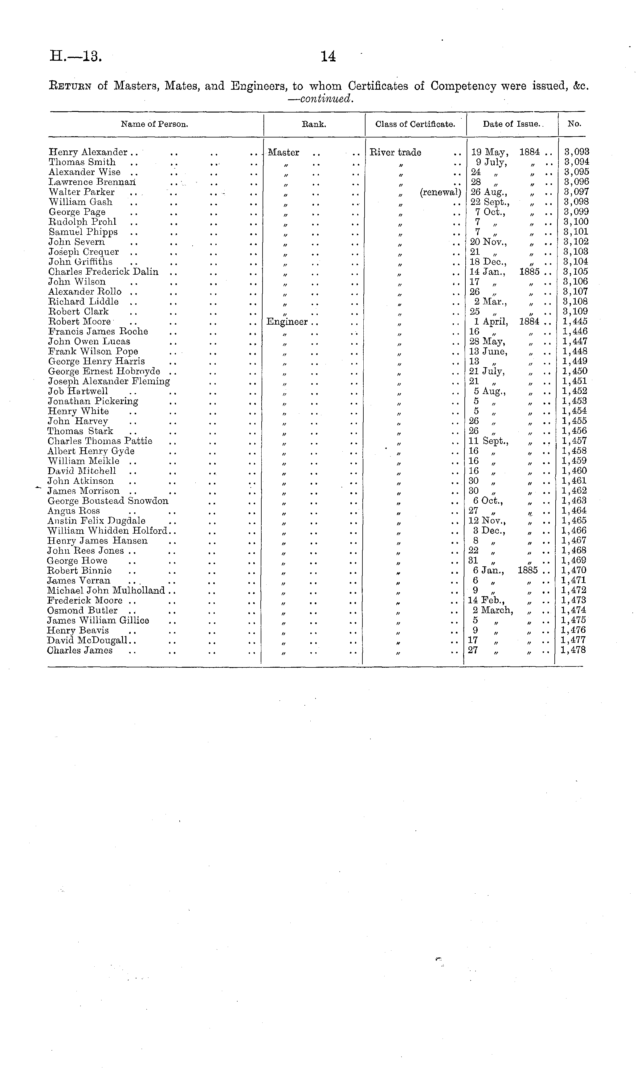 Name of Person. Rank. Class of Certificate. Date of Issue. No. Henry Alexander Thomas Smith Alexander Wise Lawrence Brennan .. \, Walter Parker William Gash George Page Eudolph Prohl Samuel Phipps John Severn Joseph Crequer John Griffiths Charles Frederick Dalin John Wilson Alexander Eollo Eichard Liddle Eobert Clark Eobert Moore Francis James Eoche John Owen Lueas Frank Wilson Pope George Henry Harris George Ernest Hobroyde .. Joseph Alexander Fleming Job Hartwell Jonathan Pickering Henry White John Harvey Thomas Stark Charles Thomas Pattie Albert Henry Gyde William Meikle David Mitchell John Atkinson James Morrison George Boustead Snowdon Angus Eoss Austin Felix Dugdale William Whidden Holford.. Henry James Hansen John Eees Jones George Howe Eobert Binnie J.ames Verran ... Michael John Mulholland .. Frederick Moore Osmond Butler James William Gillice Henry Beavis David McDougall.. Charles James Master Engineer .. Eiver trade „ (renewal) 19 May, 1884 .. 9 July, „ .. 24 „ „ .. 28 „ „ .. 26 Aug., „ .. 22 Sept., „ .. 7 Oct., „ .. 7 „ „ .. 7 „ „ .. 20 Nov., „ .. 21 „ „ .. 18 Dec, „ .. 14 Jan., 1885 .. 17 „ „ .. 26 „ „ .. 2 Mar., „ .. 25 1 April, 1884 '.'. 16 „ „ .. 28 May, „ .. 13 June, „ .. 13 „ „ A. 21 July, „ .. 21 „ „ .. 5 Aug., „ .. 5 „ „ .. 5 „ „ 26 „ „ .. 26 „ „ .. 11 Sept., „ .. 16 „ „ .. 16 „ „ .. 16 „ „ .. 30 „ „ .. 30 „ „ .. 6 Oct., „ .. 27 „ „ .. 12 Nov., „ .. 3 Dec, „ .. 8 „ „ .. 22 „ „ .. 31 „ „ .. 6 Jan., 1885 .. 6 „ „ .. 9 „ „ .. 14 Feb., „ .. 2 March, „ .. 5 „ „ .. 9 „ „ ■■ 17 „ „ .. 27 „ „ .. 3,093 3,094 3,095 3,096 3,097 3,098 3,099 3,100 3,101 3,102 3,103 3,104 3,105 3,106 3,107 3,108 3,109 1,445 1,446 1,447 1,448 1,449 1,450 1,451 1,452 1,453 1,454 1,455 1,456 1,457 1,458 1,459 1,460 1,461 1,462 1,463 1,464 1,465 1,466 1,467 1,468 1,469 1,470 1,471 1,472 1,473 1,474 1,475 1,476 1,477 1,478