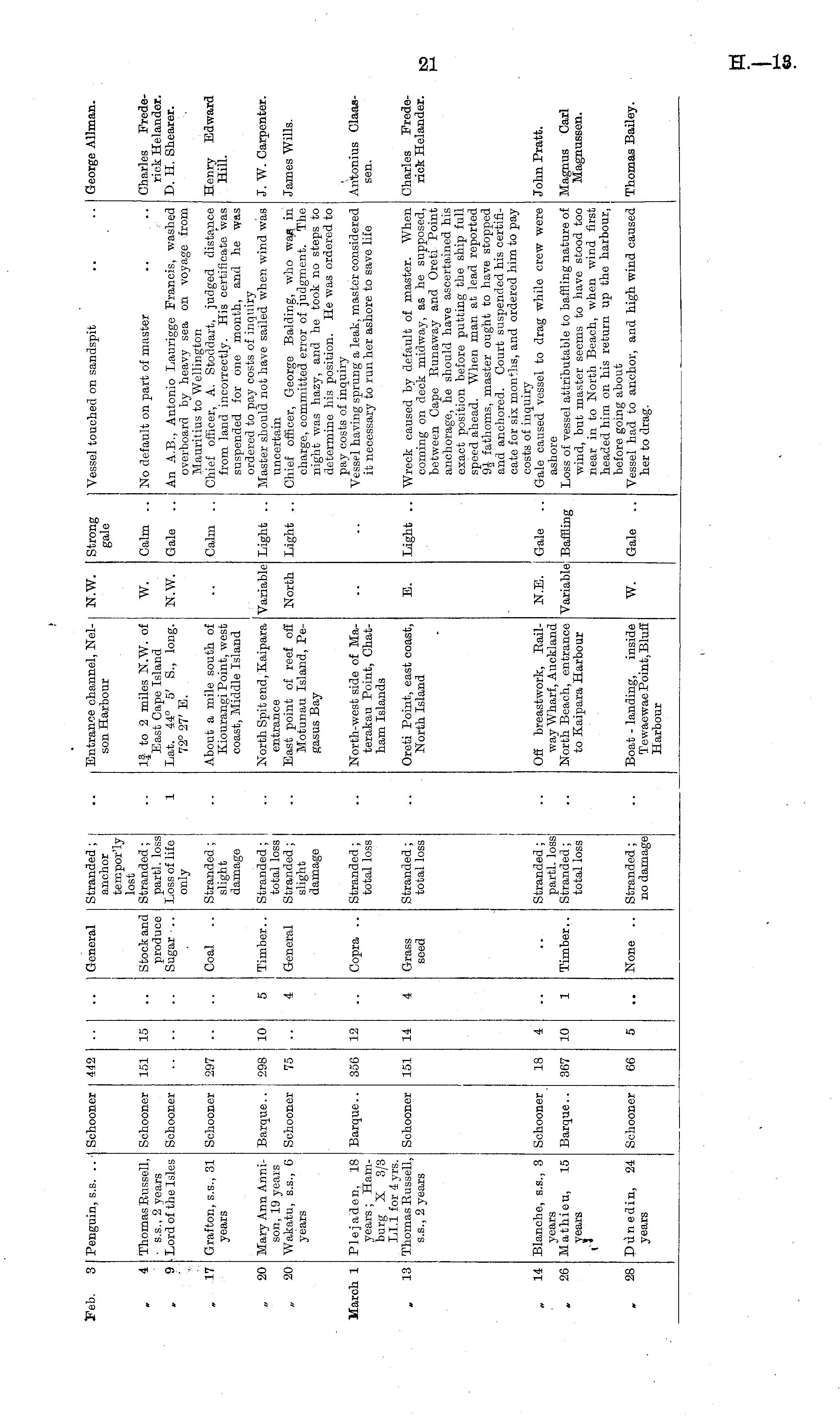 Feb. 3 Penguin, s.s. .. Schooner 442 General Stranded; | anchor tempor'ly lost Stranded ; parti, loss Loss of life only Entrance channel, Nelson Harbour N.W. Strong gale Vessel touched on sandspit George Allman. 4 Thomas Russell, s.s., 2 years Lord of the Isles Schooner Stock and produce Sugar .. If to 2 miles N.W. of East Cape Island Lat. 44° 5' S., long. 72° 27' E. W. Calm .. No default on part of master Charles Frederick Helander. D. H. Shearer. 151 15 9 Schooner 1 N.W. Gale .. An A.B., Antonio Laurigge Francis, washed overboard by heavy sea on voyage from Mauritius to Wellington Chief officer, A. Stoddart, judged distance from land incorrectly. His certificate was suspended for one month, and he was ordered to pay costs of inquiry Master should not have sailed when wind was uncertain Chief officer, George Balding, who was in charge, committed error of judgment. The night was hazy, and he took no steps to determine his position. He was ordered to pay costs of inquiry Vessel having sprung a leak, master considered it necessary to run her ashore to save life . 17 Grafton, s.s., 31 years Schooner 297 Coal .. Stranded ; slight damage About a mile south of Kiourangi Point, west coast, Middle Island Calm .. Henry Edward Hill. „ 20 Mary Ann Annison, 19 years Wakatu, s.s., 6 years Barque.. Timber.. Stranded ; j total loss Stranded ; slight damage North Spit end, Kaipara entrance East point of reef off Motunau Island, Pegasus Bay Variable Light .. J. W. Carpenter. 298 10 5 , 20 Schooner 75 4 General North Light .. James Wills. March 1 Plejaden, 18 years ; Hamburg X 3/3 LI.l for 4yrs. Thomas Russell, s.s., 2 years Barque.. 356 12 Copra .. Stranded; total loss North-west side of Materakau Point, Chatham Islands Antonius Claassen. . 13 Schooner Grass seed Stranded ; total loss Oreti Point, east coast, North Island E. Light .. Wreck caused by default of master. When coming on deck midway, as he supposed, between Cape Runaway and Oreti Point anchorage, he should have ascertained his exact position before putting the ship full speed ahead. When man at lead reported 9J fathoms, master ought to have stopped and anchored. Court suspended his certificate for six months, and ordered him to pay costs of inquiry Gale caused vessel to drag while crew were ashore Loss of vessel attributable to baffling nature of wind, but master seems to have stood too near in to North Beach, when wind first headed him on his return up the harbour, before going about Vessel had to anchor, and high wind caused her to drag. Charles Frederick Helander. 151 14 „ 14 Off breastwork, Railway Wharf, Auckland North Beach, entrance to Kaipara Harbour Blanche, s.s., 3 years Mathieu, 15 years Schooner 18 4 Stranded ; parti, loss Stranded; total loss N.E. Gale .. John Pratt. . 26 Barque.. 367 10 1 Timber.. Variable Baffling Magnus Carl Magnussen. . 28 Dunedin, 24 Schooner None .. Stranded; no damage Boat - landing, inside Tewaewae Point, Bluff Harbour Gale .. Thomas Bailey. 66 W. years