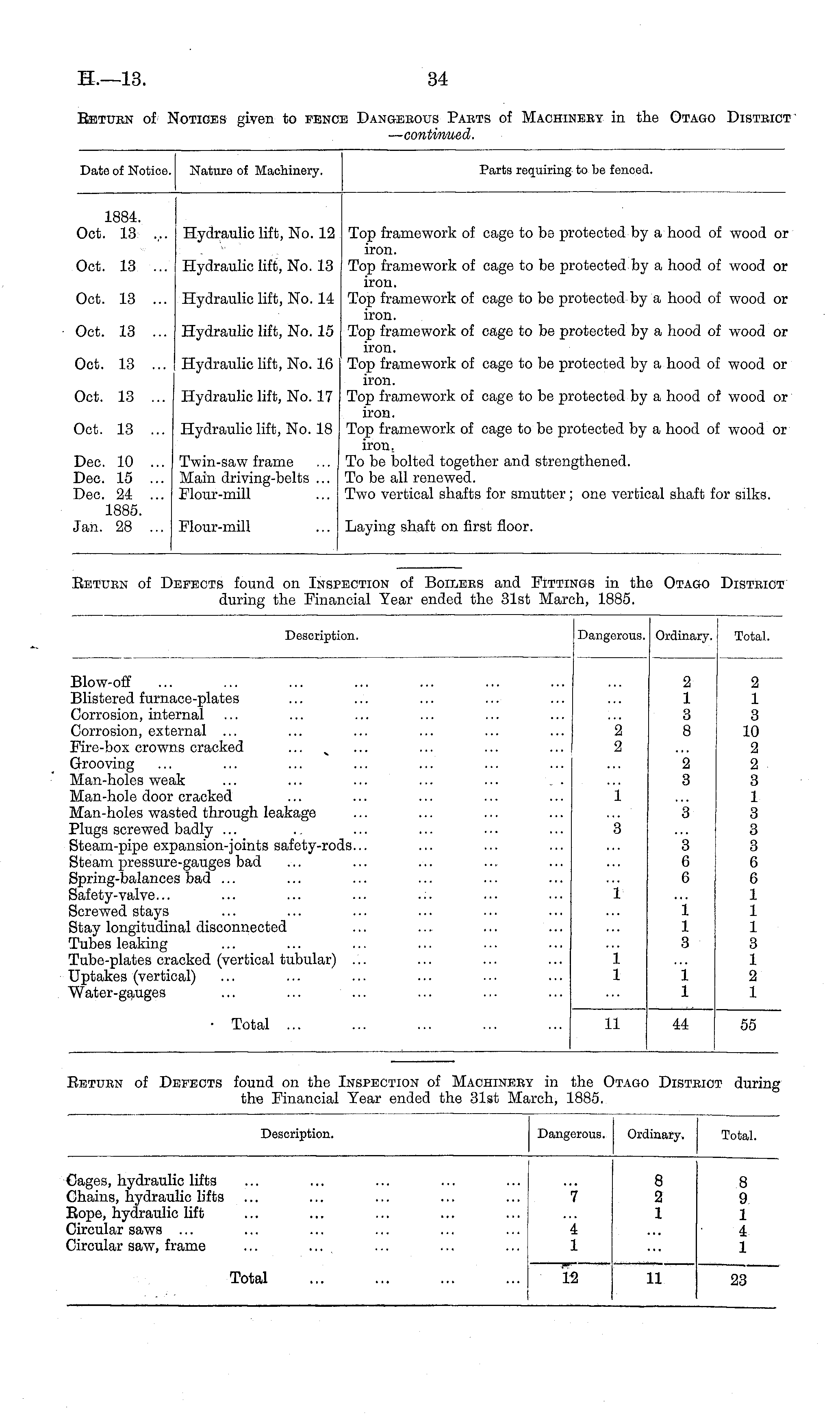 Date of Notice. Nature of Machinery. Parts requiring to be fenced. 1884. Oct. 13 ... Hydraulic lift, No. 12 Top framework of cage to be protected by a hood of wood or iron. Top framework of cage to be protected by a hood of wood or iron. Top framework of cage to be protected by a hood of wood or iron. Top framework of cage to be protected by a hood of wood or iron. Top framework of cage to be protected by a hood of wood or iron. Top framework of cage to be protected by a hood of wood or iron. Top framework of cage to be protected by a hood of wood or iron. To be bolted together and strengthened. To be all renewed. Two vertical shafts for smutter; one vertical shaft for silks. Oct. 13 ... Hydraulic lift, No. 13 Oct. 13 ... Hydraulic lift, No. 14 Oct. 13 ... Hydraulic lift, No. 15 Oct. 13 ... Hydraulic lift, No. 16 Oct. 13 ... Hydraulic lift, No. 17 Oct. 13 ... Hydraulic lift, No. 18 Dec. 10 ... Dec. 15 ... Dec. 24 ... 1885. Jan. 28 ... Twin-saw frame Main driving-belts ... Flour-mill Flour-mill Laying shaft on first floor.