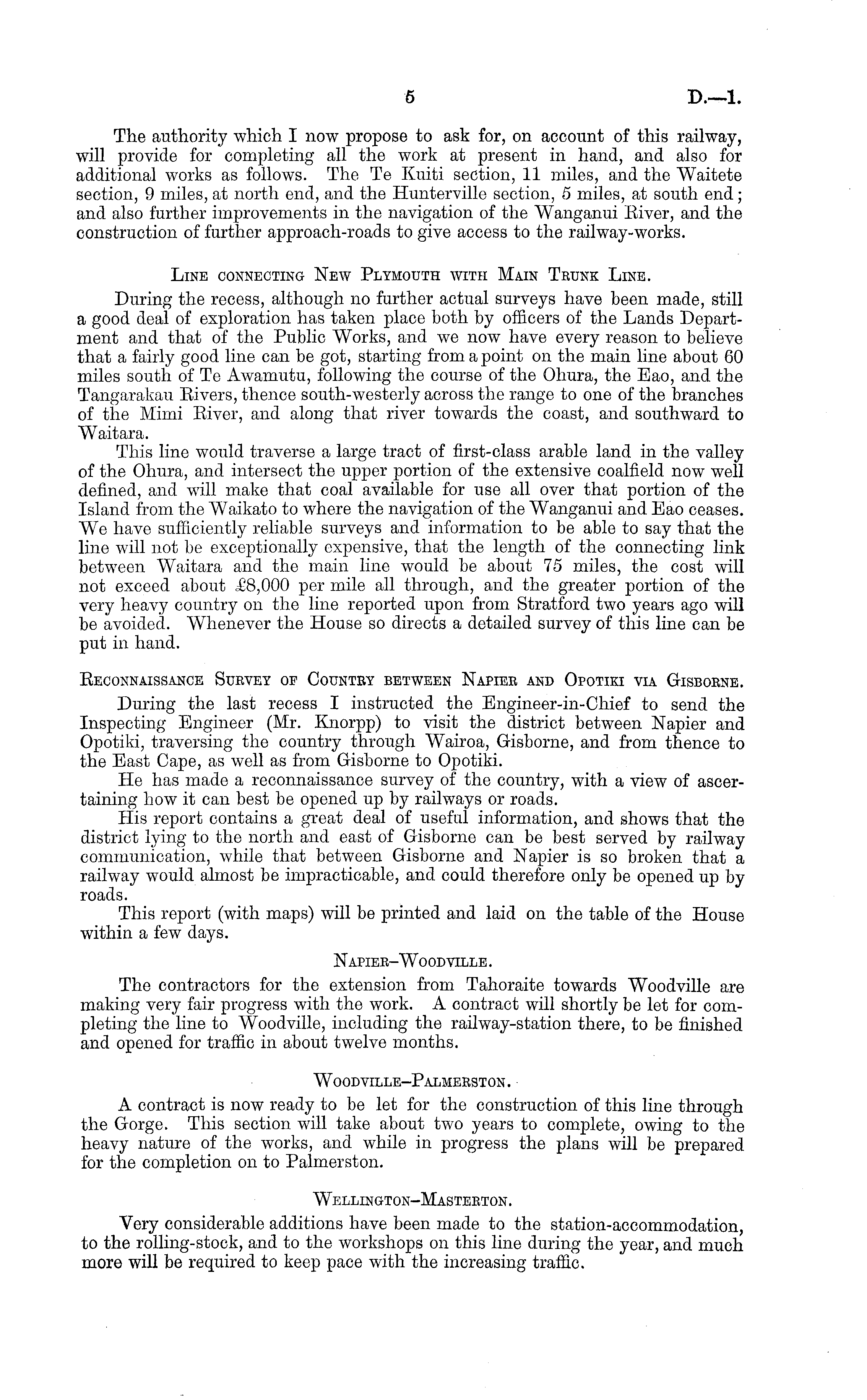The authority which I now propose to ask for, on account of this railway, will provide for completing all the work at present in hand, and also for additional works as follows. The Te Kuiti section, 11 miles, and the Waitete section, 9 miles, at north end, and the Hunterville section, 5 miles, at south end; and also further improvements in the navigation of the Wanganui Eiver, and the construction of further approach-roads to give access to the rail way-works. Line connecting New Plymouth with Main Trunk Line. During the recess, although no further actual surveys have been made, still a good deal of exploration has taken place both by officers of the Lands Department and that of the Public Works, and we now have every reason to believe that a fairly good line can be got, starting from a point on the main line about 60 miles south of Te Awamutu, following the course of the Ohura, the Eao, and the Tangarakau Rivers, thence south-westerly across the range to one of the branches of the Mimi Eiver, and along that river towards the coast, and southward to Waitara. This line would traverse a large tract of first-class arable land in the valley of the Ohura, and intersect the upper portion of the extensive coalfield now well defined, and will make that coal available for use all over that portion of the Island from the Waikato to where the navigation of the Wanganui and Eao ceases. We have sufficiently reliable surveys and information to be able to say that the line will not be exceptionally expensive, that the length of the connecting link between Waitara and the main line would be about 75 miles, the cost will not exceed about £8,000 per mile all through, and the greater portion of the very heavy country on the line reported upon from Stratford two years ago will be avoided. Whenever the House so directs a detailed survey of this line can be put in hand. Reconnaissance Survey of Country between Napier and Opotiki via Gisborne. During the last recess I instructed the Engineer-in-Chief to send the Inspecting Engineer (Mr. Knorpp) to visit the district between Napier and Opotiki, traversing the country through Wairoa, Gisborne, and from thence to the East Cape, as well as from Gisborne to Opotiki. He has made a reconnaissance survey of the country, with a view of ascertaining how it can best be opened up by railways or roads. His report contains a great deal of useful information, and shows that the district lying to the north and east of Gisborne can be best served by railway communication, while that between Gisborne and Napier is so broken that a railway would almost be impracticable, and could therefore only be opened up by roads. This report (with maps) will be printed and laid on the table of the House within a few days. Napier- Wood ville . The contractors for the extension from Tahoraite towards Woodville are making very fair progress with the work. A contract will shortly be let for completing the line to Woodville, including the railway-station there, to be finished and opened for traffic in about twelve months. Woodville-Palmerston. A contract is now ready to be let for the construction of this line through the Gorge. This section will take about two years to complete, owing to the heavy nature of the works, and while in progress the plans will be prepared for the completion on to Palmerston. Wellington-Masterton. Very considerable additions have been made to the station-accommodation, to the rolling-stock, and to the workshops on this line during the year, and much more will be required to keep pace with the increasing traffic.