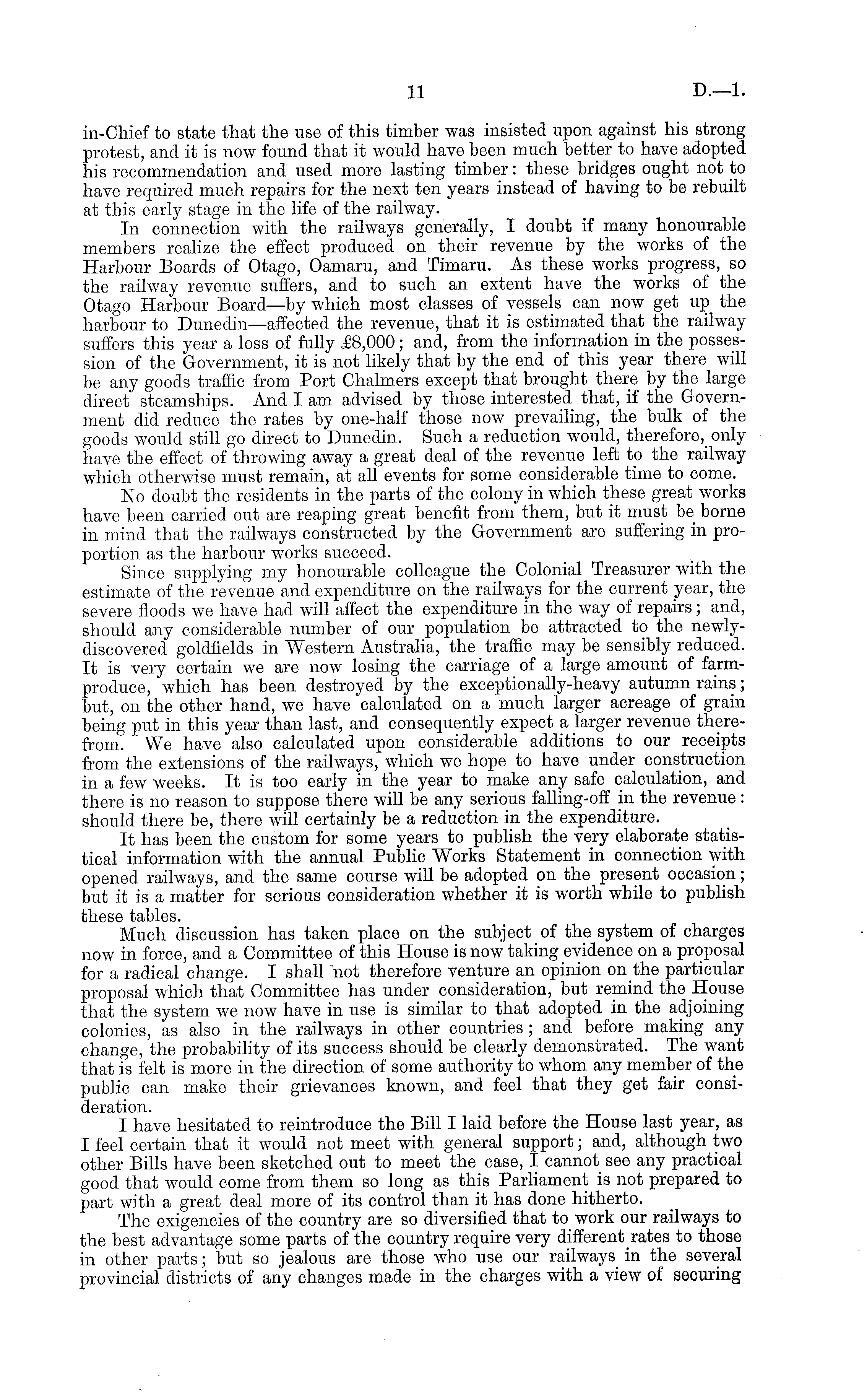 in-Chief to state that the use of this timber was insisted upon against his strong protest, and it is now found that it would have been much better to have adopted his recommendation and used more lasting timber: these bridges ought not to have required much repairs for the next ten years instead of having to be rebuilt at this early stage in the life of the railway. In connection with the railways generally, I doubt if many honourable members realize the effect produced on their revenue by the works of the Harbour Boards of Otago, Oamaru, and Timaru. As these works progress, so the railway revenue suffers, and to such an extent have the works of the Otago Harbour Board—by which most classes of vessels can now get up the harbour to Dunedin—affected the revenue, that it is estimated that the railway suffers this year a loss of fully £8,000 ; and, from the information in the possession of the Government, it is not likely that by the end of this year there will be any goods traffic from Port Chalmers except that brought there by the large direct steamships. And lam advised by those interested that, if the Government did reduce the rates by one-half those now prevailing, the bulk of the goods would still go direct to Dunedin. Such a reduction would, therefore, only have the effect of throwing away a great deal of the revenue left to the railway which otherwise must remain, at all events for some considerable time to come. No doubt the residents in the parts of the colony in which these great works have been carried out are reaping great benefit from them, but it must be borne in mind that the railways constructed by the Government are suffering in proportion as the harbour works succeed. Since supplying my honourable colleague the Colonial Treasurer with the estimate of the revenue and expenditure on the railways for the current year, the severe floods we have had will affect the expenditure in the way of repairs; and, should any considerable number of our population be attracted to the newlydiscovered goldfields in Western Australia, the traffic may be sensibly reduced. It is very certain we are now losing the carriage of a large amount of farmproduce, which has been destroyed by the exceptionally-heavy autumn rains; but, on the other hand, we have calculated on a much larger acreage of grain being put in this year than last, and consequently expect a larger revenue therefrom. We have also calculated upon considerable additions to our receipts from the extensions of the railways, which we hope to have under construction in a few weeks. It is too early in the year to make any safe calculation, and there is no reason to suppose there will be any serious falling-off in the revenue : should there be, there will certainly be a reduction in the expenditure. It has been the custom for some years to publish the very elaborate statistical information with the annual Public Works Statement in connection with opened railways, and the same course will be adopted on the present occasion; but it is a matter for serious consideration whether it is worth while to publish these tables. Much discussion has taken place on the subject of the system of charges now in force, and a Committee of this House is now taking evidence on a proposal for a radical change. I shall not therefore venture an opinion on the particular proposal which that Committee has under consideration, but remind the House that the system we now have in use is similar to that adopted^in the adjoining colonies, as also in the railways in other countries ; and before making any change, the probability of its success should be clearly demonstrated. The want that is felt is more in the direction of some authority to whom any member of the public can make their grievances known, and feel that they get fair consideration. I have hesitated to reintroduce the Bill I laid before the House last year, as I feel certain that it would not meet with general support; and, although two other Bills have been sketched out to meet the case, I cannot see any practical good that would come from them so long as this Parliament is not prepared to part with a great deal more of its control than it has done hitherto. The exigencies of the country are so diversified that to work our railways to the best advantage some parts of the country require very different rates to those in other parts; but so jealous are those who use our railways in the several provincial districts of any changes made in the charges with a view of securing