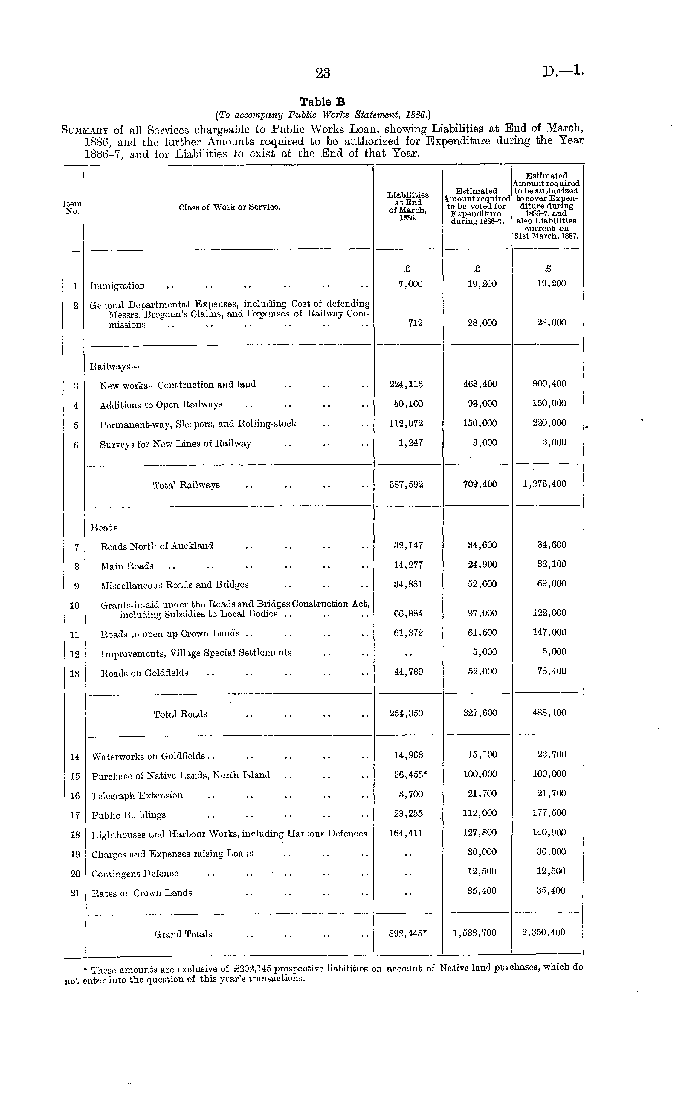 Item No. Class of Work or Service. Liabilities at End Of March, 18S6. Estimated Amount requirod to be voted for Expenditure during 1886-7. Estimated Amount required to be authorized to cover Expenditure during 1886-7, and also Liabilities current on 31st March, 1887. £ £ & 1 Immigration 7,000 19,200 19,200 2 General Departmental Expenses, including Cost of defending Messrs. Brogden's Claims, and Expenses of Railway Commissions 719 28,000 28,000 Railways— 3 New works —Construction and land 224,113 403,400 900,400 4 Additions to Open Railways 50,160 93,000 150,000 5 Permanent-way, Sleepers, and Rolling-stock 112,072 150,000 220,000 6 Surveys for New Lines of Railway 1,247 3,000 3,000 Total Railways 387,592 709,400 1,273,400 Roads— 7 Roads North of Auckland 32,147 34,600 34,600 8 Main Roads 14,277 24,900 32,100 9 Miscellaneous Roads and Bridges 34,881 52,600 69,000 10 Grants-in-aid under the Roads and Bridges Construction Act, including Subsidies to Local Bodies 66,884 97,000 122,000 11 Roads to open up Crown Lands 61,372 61,500 147,000 12 Improvements, Village Special Settlements 5,000 5,000 13 Roads on Goldfields 44,789 52,000 78,400 Total Roads 254,350 327,600 488,100 14 Waterworks on Goldfields 14,963 15,100 23,700 15 Purchase of Native Lands, North Island 36,455* 100,000 100,000 16 Telegraph Extension 3,700 21,700 21,700 17 Public Buildings 23,255 112,000 177,500 18 Lighthouses and Harbour Works, including Harbour Defences 164,411 127,800 140,900 19 Charges and Expenses raising Loans 30,000 30,000 20 Contingent Defence 12,500 12,500 •21 Bates on Crown Lands 35,400 35,400 Grand Totals 892,445* 1,538,700 2,350,400 ' These amounts are exclusive of £202,145 prospective liabilities inter into the question of this year's transactions. m account of Native land pun jlmses, which di tot