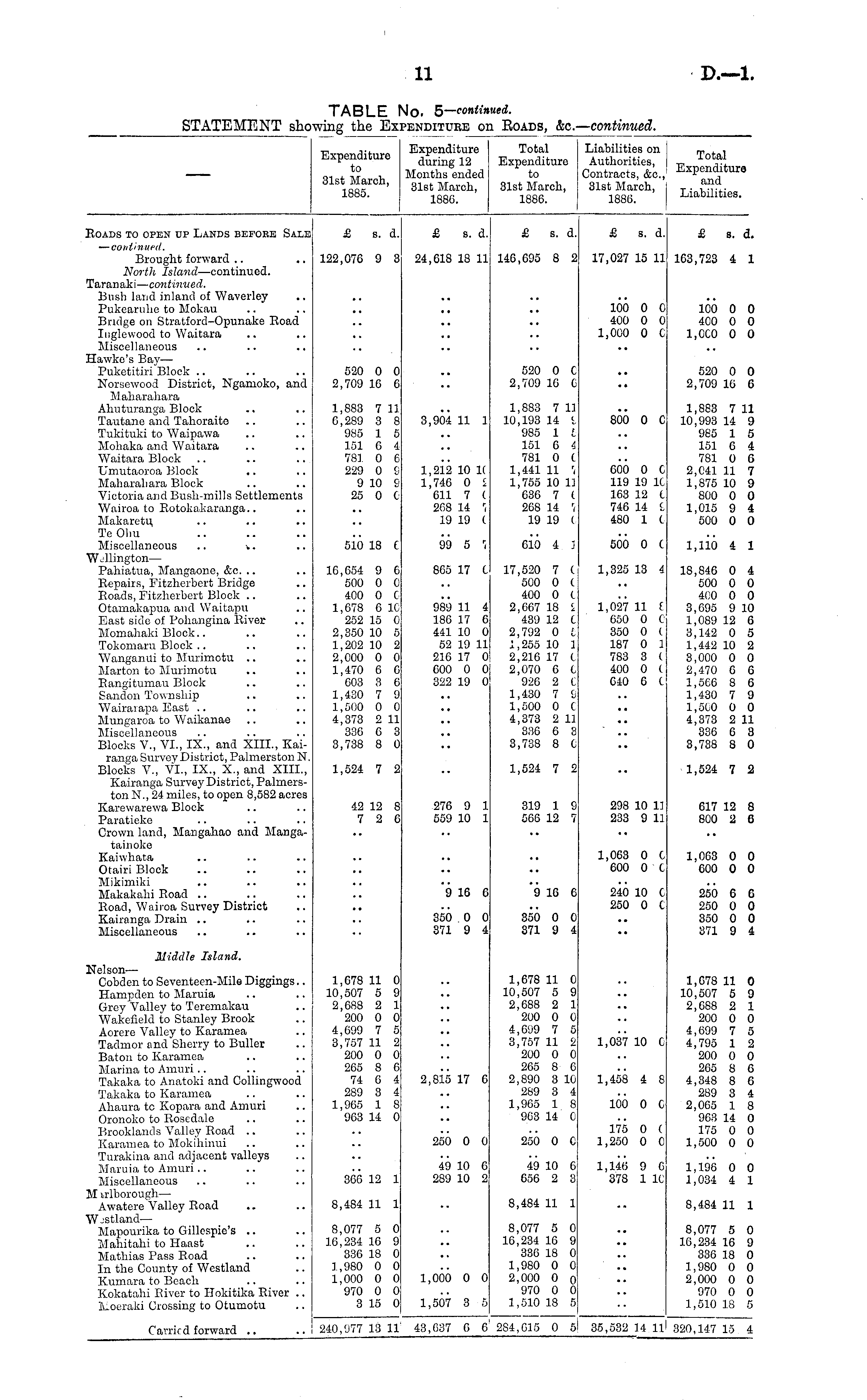 Expenditure to 31st March, 1885. Expenditure during 12 Months ended 31st March, 1886. Total Expenditure to 31st March, 1886. Liabilities on I T , , Authorities, ! „ , al. Contracts, &oj Expenditurs 31st March, I T . ? 1} a. 1886. ! LlabllltieslOADS TO OPEN UP LANDS BEFORE SALE — continued. Brought forward North Island —continued, 'aranaki— continued. Bush land inland of Waverley Pukearnho to Mokau Bridge on Stratford-Opunake Koad Inglewood to Waitara Miscellaneous lawke's Bay— Puketitiri"Block .. Norsewood District, Ngamoko, and Maharahara Ahuturanga Block Tautane and Tahoraite Tukituki to Waipawa Mohaka and Waitara Waitara Block Umutaoroa Block Maharahara Block Victoria and Bush-mills Settlements Wairoa to Eotolsaiaranga.. Makaretu, Te Olm Miscellaneous .. Vcllington— Pahiatua, Mangaone, &c. Repairs, Fitzherbert Bridge Eoads, Fitzlierbcrt Block Otamakapua avid Waitapu East side of Pohangina River Momahaki Block.. Tokomaru Block .. WanganUi to Murimotu Marton to Murimotu Eangitumau Block Eandon Township Wairarapa East .. Mungaroa to Waikanae Miscellaneous Blocks V., VI., IX., and XIII., Kairanga Survey District, Palmerston N. Blocks V., VI., IX., X., and XIII., Kairanga Survey District, Palmerston N., 24 miles, to open 8,582 acres Karewarewa Block Paratieke Crown land, Mangahao and Mangatainoke Kaiwhata Otairi Block Mikimiki Makakahi Road Road, Wairoa Survey District Kaironga Drain Miscellaneous £ s. d. £ s. d. £ s. d. £ s. d. £ s. d. 122,076 9 3 24,618 18 11 146,G95 8 2 17,027 15 11 163,723 4 1 100 0 0 400 0 0 1,000 0 0 1C0 0 0 400 0 0 1,CCO 0 0 520 0 0 2,709 1C 6 520 0 C 2,709 1G C 520 0 0 2,709 16 6 1,883 7 11 6,289 3 8 985 1 5 151 G 4 781 0 G 229 0 £ 9 10 9 25 0 C 3,904 11 1 1,883 7 11 10,193 14 '. 985 1 £ 151 G 4 781 0 t 1,441 11 ', 1,755 10 1] 636 7 ( 268 14 ', 19 19 ( 800 0 C 1,883 7 11 10,993 14 9 985 1 5 151 6 4 781 0 G 2,C41 11 7 1,875 10 9 800 0 0 1,015 9 i 500 0 0 1,212 10 1( 1,746 0 S Gil 7 ( 268 14 ', 19 19 ( 600 0 C 119 19 It 163 12 I 746 14 I 480 1 0 510 18 C 99 5 \ 610 4 ] 500 0 ( 1,110 4 1 16,054 9 6 500 0 0 400 0 C 1,678 6 10 252 15 0 2,350 10 5 1,202 10 2 2,COO 0 0 1,470 G G G03 8 6 1,430 7 9 1,500 0 0 4,373 2 11 336 6 3 3,738 8 0 865 17 C 989 11 4 186 17 6 441 10 0 52 19 11 21G 17 0J 600 0 0 322 19 0 17,520 7 t 500 0 ( 400 0 C 2,667 18 S 439 12 C 2,792 0 i 1,255 10 1 2,216 17 ( 2,070 C C 926 2 C 1,430 7 t 1,500 0 ( 4,373 2 1] 336 6 8 3,738 8 C 1,325 13 4 1,027 11 f G50 0 C 350 0 ( 187 0 1 783 3 ( 400 0 t 640 G C 18,846 0 4 500 0 0 4C0 0 0 3,695 9 10 1,089 12 6 3,142 0 5 1,442 10 2 3,000 0 0 2,470 6 G 1.5CG 8 6 1,430 7 9 1,500 0 0 4,373 2 11 336 6 3 3,738 8 0 1,524 7 2 1,524 7 2 1,524 7 2 42 12 8 7 2 6 276 9 1 559 10 1 319 1 G 566 12 7 298 10 1] 233 9 11 617 12 8 800 2 6 1,063 0 C 600 0 C 1,063 0 0 600 0 0 9 16 6 9 ig e 240 10 C 250 0 C 250 6 6 250 0 0 350 0 0 371 9 4 350 0 0 371 9 4 350 0 0 371 9 4 Middle Island. Telson — Cobden to Seventeen-Mile Diggings.. Hampden to Maruia Grey Valley to Teremakau Wakefield to Stanley Brook Aorere Valley to Karamea Tadmor and Sherry to Buller Baton to Karamea Marina to Amuri Takaka to Anatoki and Collingwood Takaka to Karamea Aliaura tc Kopara and Amuri Oronoko to Roscdale Brooklands Valley Road Karamea to Mokihinui Turakina and adjacent valleys Maruia to Amuri.. Miscellaneous 1 irlborough— Awatere Valley Road yjstland— Mapourika to Gillcspie's .. Maintain to Haast Mathias Pass Road In the County of Wcstland Kumara to Beach Kokatahi River to Holdtika River .. Moeraki dossing to Otumotu 1,G78 11 0 10,507 5 9 2,6S8 2 1 200 0 0 4,699 7 5 3,757 11 2 200 0 0 205 8 6 74 6 4 289 3 4 1,965 1 8 9G3 14 0 1,678 11 0 10,507 5 9 2,688 2 1 200 0 0 4,699 7 5 3,757 11 2 200 0 0 265 8 6 2,890 3 10 289 3 4 1,963 1 8 963 14 0 1,037 10 C 1,078 11 0 10,507 5 9 2,688 2 1 200 0 0 4,699 7 5 4,795 1 2 200 0 0 2G5 8 6 4,348 8 G 289 3 4 2,065 1 8 963 14 0 175 0 0 1,500 0 0 2,815 17 6 1,458 4 8 100 0 C 250 0 0 250 0 C 175 0 ( 1,250 0 0 366 12 1 49 10 6 289 10 2 49 10 G 650 2 3 1,146 9 6 378 1 1C 1,196 0 0 1,034 4 1 8,484 11 1 8,484 11 1 8,484 11 1 8,077 5 0 16,234 16 9 336 18 0 1,980 0 0 1,000 0 0 970 0 0 3 15 0: 8,077 5 0 16,234 16 9 336 18 0 1,980 0 0 2,000 0 o 970 0 0 1,510 18 5 8,077 5 0 16,234 16 9 336 18 0 1,980 0 0 2,000 0 0 970 0 0 1,510 18 5 1,000 0 0 1,507 3 5 Carried forward .. .. ! 240,977 13 11 43,637 G 6 284,615 0 51 35,532 14 11 320,147 15 4