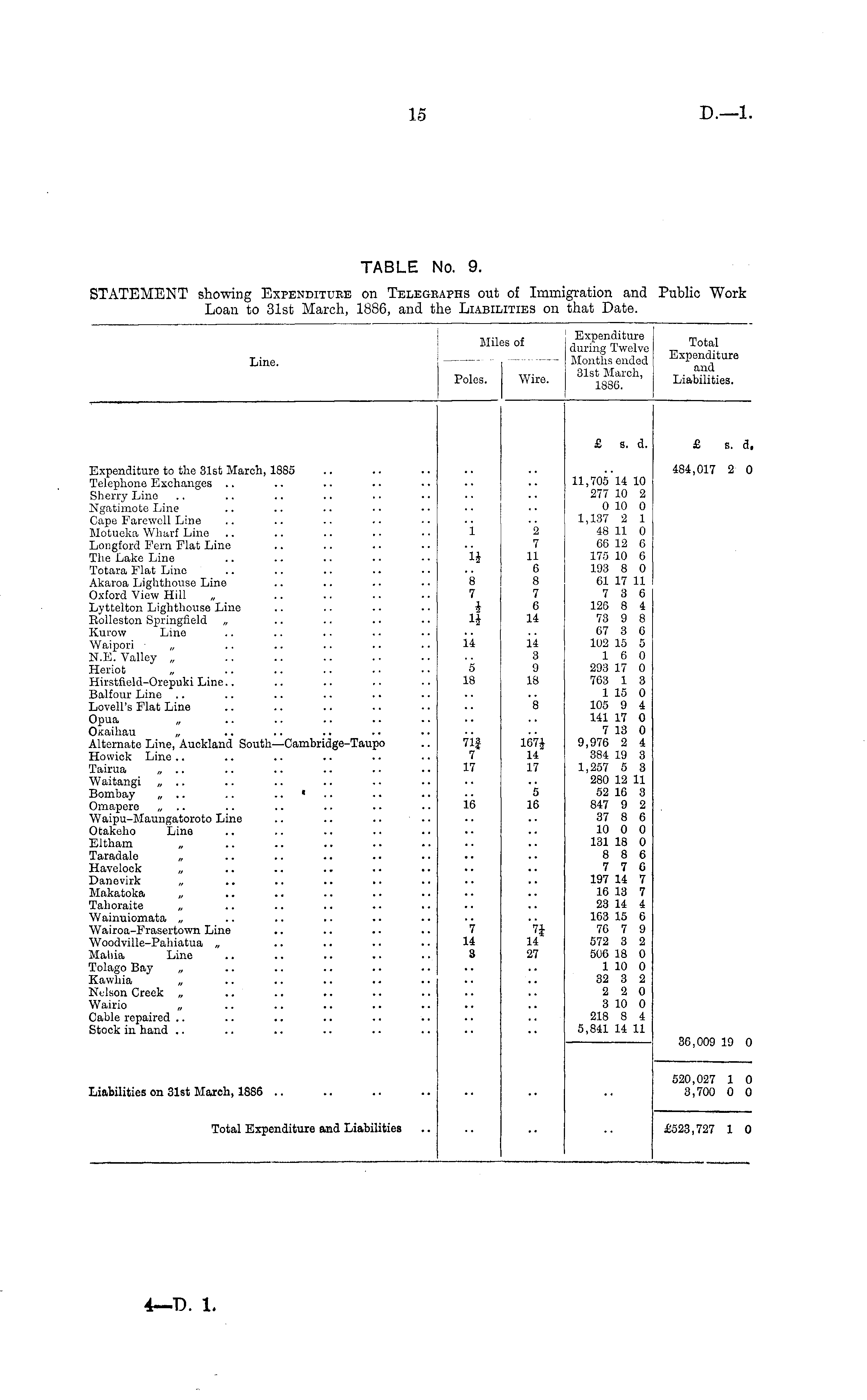 TABLE No. 9. STATEMENT showing Expenditure on Telegraphs out of Immigration and Public Work Loan to 31st March, 1886, and the Liabilities on that Date.