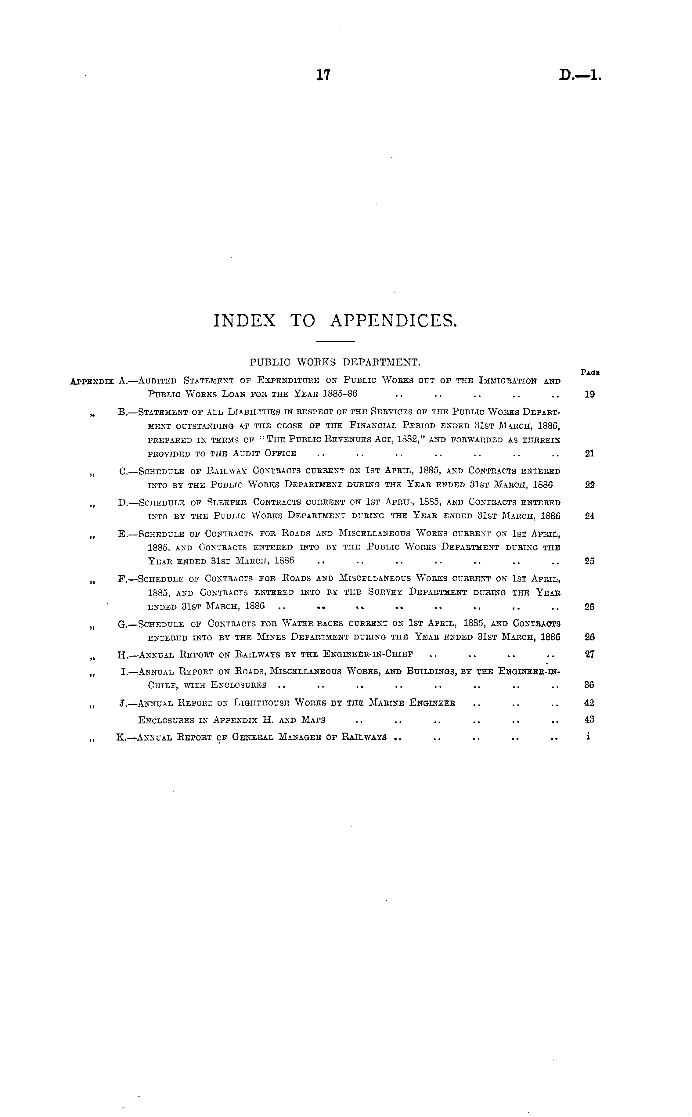 INDEX TO APPENDICES. PUBLIC WORKS DEPARTMENT. Appendix A.—Audited Statement of Expenditure on Public Works out of the Immigration and Public Wobks Loan for the Year 1885-86 .. .. .. .. .. 19 „ B.—Statement of all Liabilities in respect of the Services of the Public Wohks Department OUTSTANDING AT THE CLOSE OF THE FINANCIAL PERIOD ENDED 31ST MARCH, 1886, PREPARED IN TEEMS OF " THE PUBLIC REVENUES ACT, 1882," AND FOBWABDED AS THEREIN PROVIDED TO THE AUDIT OFFICE . . . . . . . . . . . . . . 21 C.—Schedule of Railway Contracts curbent on Ist April, 1885, and Contracts entered INTO BY THE PUBLIC WORKS DEPARTMENT DURING THE YEAR ENDED 31ST MARCH, 1886 22 D. Schedule of Sleeper Contracts current on Ist April, 1885, and Contracts entered INTO BY THE PUBLIC WORKS DEPARTMENT DURING THE YEAR ENDED 31ST MARCH, 1886 24 „ E. —Schedule of Contracts for Roads and Miscellaneous Wobks curbent on Ist Apbil, 1885, and Contracts entered into by the Public Wobks Department during the Yeab ended 31st March, 1886 .. .. .. .. .. .. .. 25 M F.—Schedule of Contracts for Roads and Miscellaneous Works curbent on Ist April, 1885, AND CONTBACTS ENTERED INTO BY THE SUBVEY DEPARTMENT DURING THE YEAE ended 31st March, 188G .. •• .. .. .. .. ~ .. 26 G, Schedule of Contracts for Wateb-baces current on Ist April, 1885, and Contracts ENTERED INTO BY THE MINES DEPARTMENT DURING THE YEAR ENDED 31ST MARCH, 1886 26 H. Annual Report on Railways by the Engineer-in-Chief .. .. .. .. 27 „ I. —Annual Report on Roads, Miscellaneous Works, and Buildings, by the Engineeb-in-Chief, with Enclosures .. .. .. ~ .. .. .. ~ 36 H 3. —Annual Report on Lighthouse Works by the Marine Engineer .. .. .. 42 Enclosures in Appendix H. and Maps .. .. .. .. .. .. 43 ~ X. —Annual Report of General Manaoer op Railways .. .. .. .. .. i