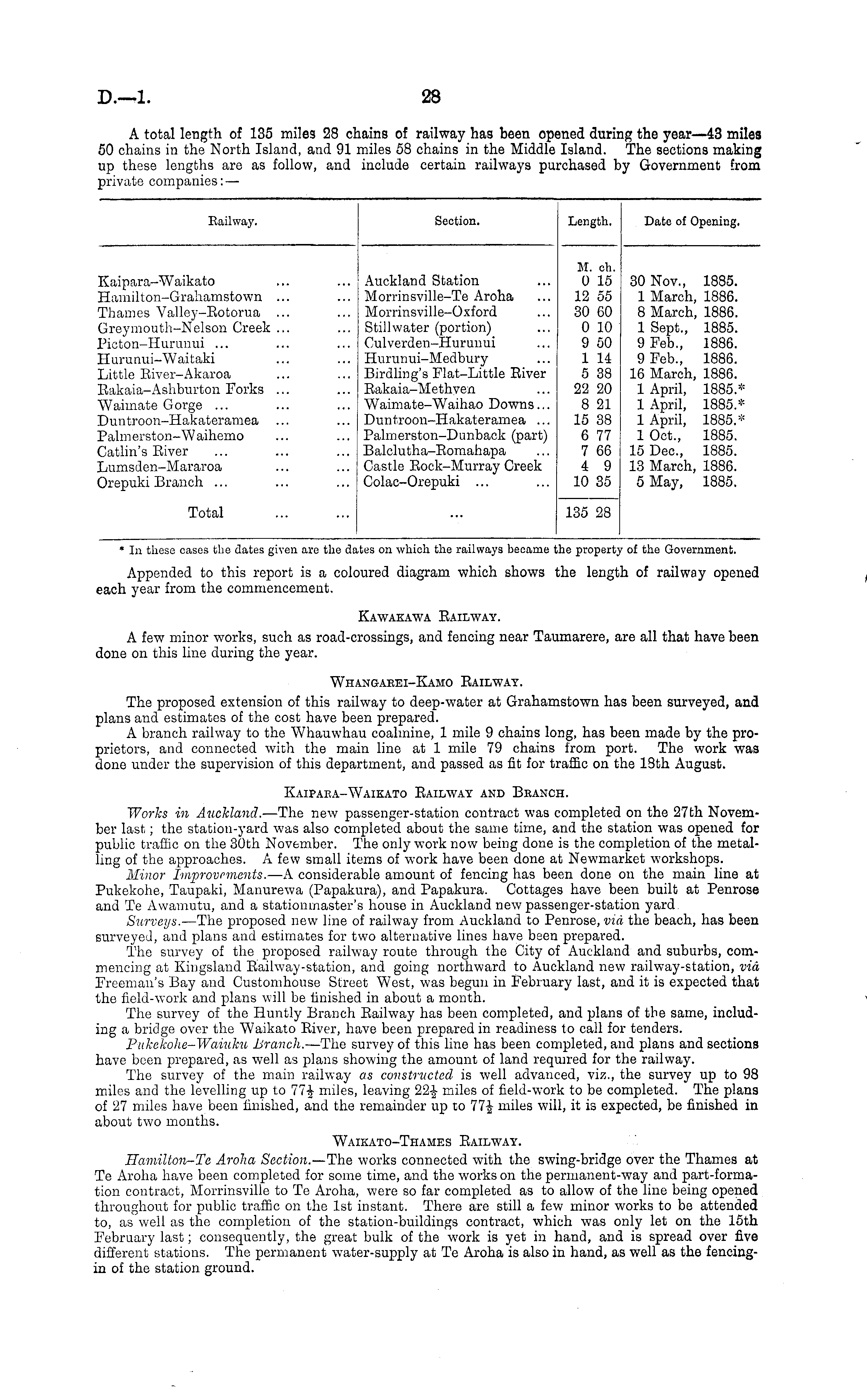 A total length of 135 miles 28 chains of railway has been opened during the year—43 miles 50 chains in the North Island, and 91 miles 58 chains in the Middle Island. The sections making up these lengths are as follow, and include certain railways purchased by Government from private companies:—