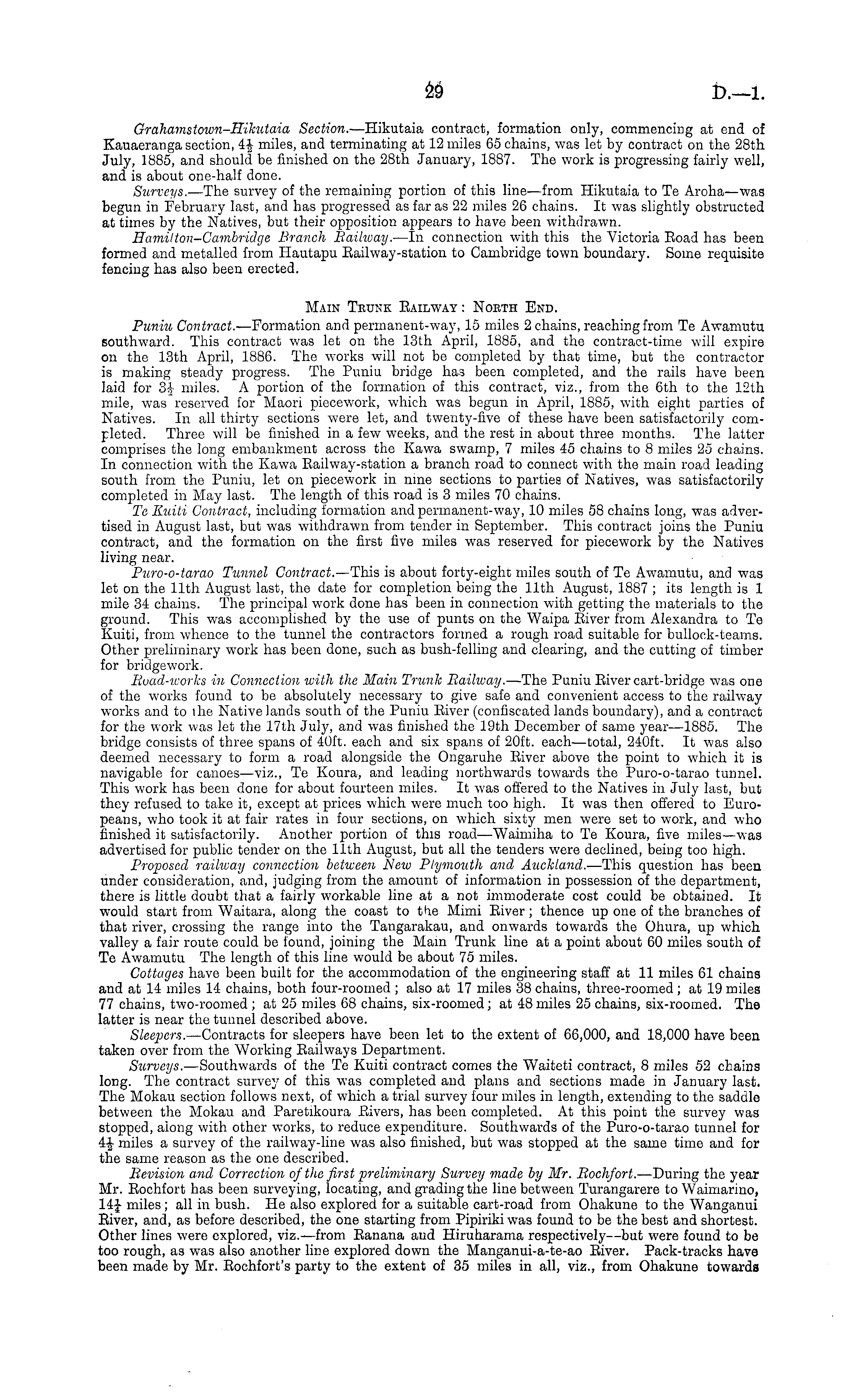 Grahamslown-Hikutaia Section. —Hikutaia contract, formation only, commencing at end of Kauaeranga section, 4£ miles, and terminating at 12 miles 65 chains, was let by contract on the 28th July, 1885, and should be finished on the 28th January, 1887. The work is progressing fairly well, and is about one-half done. Surveys. —The survey of the remaining portion of this line—from Hikutaia to Te Aroha—was begun in February last, and has progressed as far as 22 miles 26 chains. It was slightly obstructed at times by the Natives, but their opposition appears to have been withdrawn. Hamilton-Cambridge Branch Railway. —ln connection with this the Victoria Eoad has been formed and metalled from Hautapu Railway-station to Cambridge town boundary. Some requisite fencing has also been erected. Main Teukk Railway : Nokth End. Puniu Contract. —Formation and permanent-way, 15 miles 2 chains, reaching from Te Awamutu southward. This contract was let on the 13th April, 1885, and the contract-time will expire on the 13th April, 1886. The works will not be completed by that time, but the contractor is making steady progress. The Puniu bridge has been completed, and the rails have been laid for Z\ miles. A portion of the formation of this contract, viz., from the 6th to the 12th mile, was reserved for Maori piecework, which was begun in April, 1885, with eight parties of Natives. In all thirty sections were let, and twenty-five of these have been satisfactorily completed. Three will be finished in a few weeks, and the rest in about three months. The latter comprises the long embankment across the Ivawa swamp, 7 miles 45 chains to 8 miles 25 chains. In connection with the Kawa Railway-station a branch road to connect with the main road leading south from the Puniu, let on piecework in nine sections to parties of Natives, was satisfactorily completed in May last. The length of this road is 3 miles 70 chains. Te liuiti Contract, including formation and permanent-way, 10 miles 58 chains long, was advertised in August last, but was withdrawn from tender in September. This contract joins the Puniu contract, and the formation on the first five miles was reserved for piecework by the Natives living near. Puro-o-tarao Tunnel Contract. —This is about forty-eight miles south of Te Awamutu, and was let on the 11th August last, the date for completion being the 11th August, 1887 ; its length is 1 mile 34 chains. The principal work done has been in connection with getting the materials to the ground. This was accomplished by the use of punts on the Waipa River from Alexandra to Te Kuiti, from whence to the tunnel the contractors formed a rough road suitable for bullock-teams. Other preliminary work has been done, such as bush-felling and clearing, and the cutting of timber for bridgework. Euad-ivorhs in Connection with the Main Trunk Raihuay. —The Puniu River cart-bridge was one of the works found to be absolutely necessary to give safe and convenient access to the railway works and to the Native lands south of the Puniu River (confiscated lands boundary), and a contract for the work was let the 17th July, and was finished the 19th December of same year—lßßs. The bridge consists of three spans of 40ft. each and six spans of 20ft. each—total, 240 ft. It was also deemed necessary to form a road alongside the Ongaruhe River above the point to which it is navigable for canoes—viz., Te Koura, and leading northwards towards the Puro-o-tarao tunnel. This work has been done for about fourteen miles. It was offered to the Natives in July last, but they refused to take it, except at prices which were much too high. It was then offered to Europeans, who took it at fair rates in four sections, on which sixty men were set to work, and who finished it satisfactorily. Another portion of this road—Waimiha to Te Koura, five miles—was advertised for public tender on the 11th August, but all the tenders were declined, being too high. Proposed railway connection between New Plymouth and Auckland. —This question has been under consideration, and, judging from the amount of information in possession of the department, there is little doubt that a fairly workable line at a not immoderate cost could be obtained. It would start from "Waitara, along the coast to th.c Mimi River ; thence up one of the branches of that river, crossing the range into the Tangarakau, and onwards towards the Ohura, up which valley a fair route could be found, joining the Mam Trunk line at a point about 60 miles south of Te Awamutu The length of this line would be about 75 miles. Cottages have been built for the accommodation of the engineering staff at 11 miles 61 chains and at 14 miles 14 chains, both four-roomed ; also at 17 miles 38 chains, three-roomed ; at 19 miles 77 chains, two-roomed ;at 25 miles 68 chains, six-roomed; at 48 miles 25 chains, six-roomed. The latter is near the tunnel described above. Sleepers. —Contracts for sleepers have been let to the extent of 66,000, and 18,000 have been taken over from the Working Railways Department. Surveys. —Southwards of the Te Kuiti contract comes the Waiteti contract, 8 miles 52 chains long. The contract survey of this was completed and plans and sections made in January last. The Mokau section follows next, of which a trial survey four miles in length, extending to the saddle between the Mokau and Paretikoura Rivers, has been completed. At this point the survey was stopped, along with other works, to reduce expenditure. Southwards of the Puro-o-tarao tunnel for 4-| miles a survey of the railway-line was also finished, but was stopped at the same time and for the same reason as the one described. Revision and Correction of tlie first preliminary Survey made by Mr. Rochfort. —During the year Mr. Rochfort has been surveying, locating, and grading the line between Turangarere to Waimarino, 14-J- miles; all in bush. He also explored for a suitable cart-road from Ohakune to the Wanganu