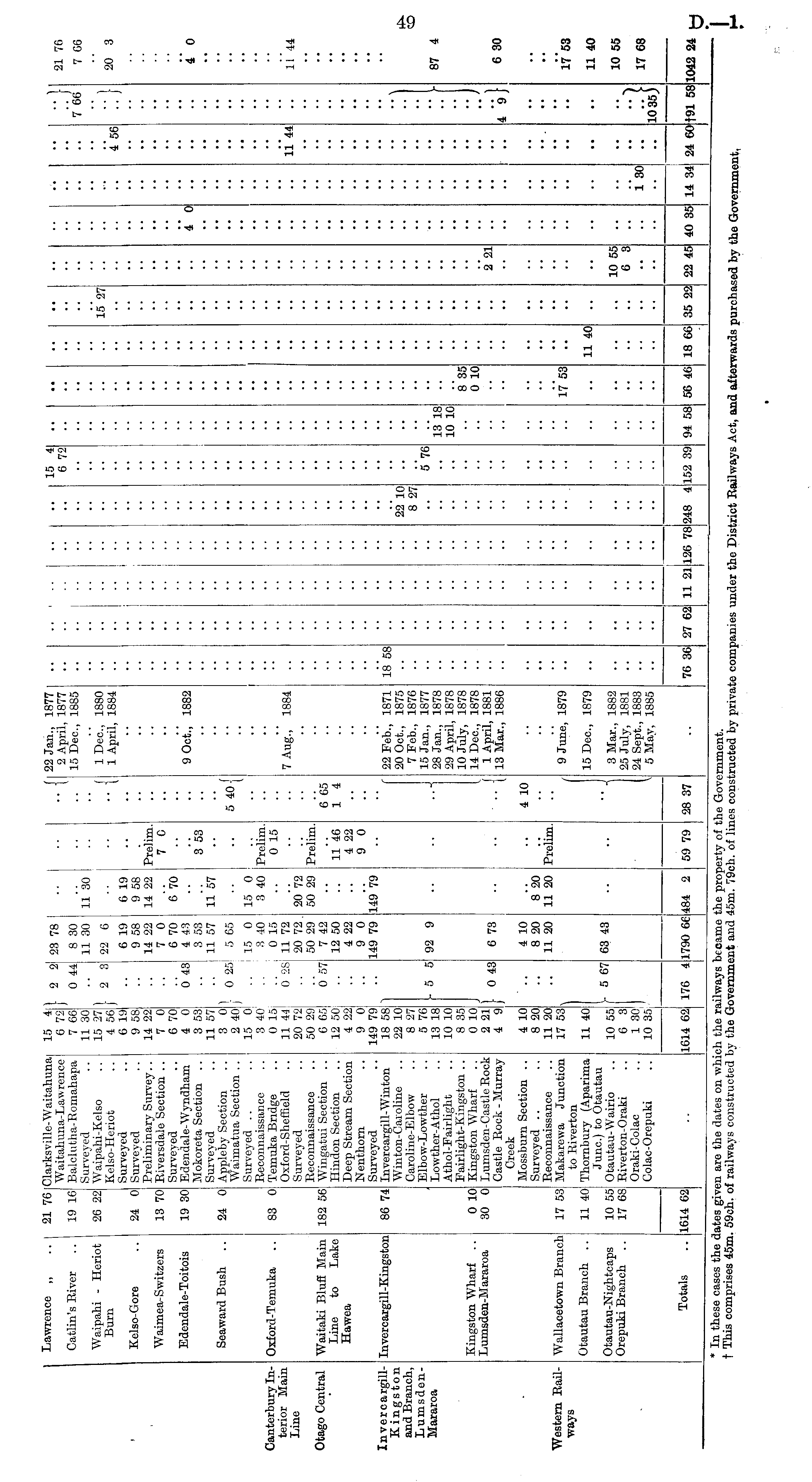 Lawrence ,, 21 76 Clarksville-Waitahuna Waitahuna-Lawrence Balclutha-Romahapa Surveyed Waipahi-Kelso Kelso-Heriot Surveyed Surveyed Preliminary Survey.. Riversdale Section .. Surveyed Edendale-Wyndham Mokoreta Section .. Surveyed Appleby Section Waimatua Section .. Surveyed Reconnaissance Temuka Bridge Oxford-Sheffield .. Surveyed Reconnaissance Wingatui Section .. Hindon Section Deep Stream Section Nenthorn Surveyed Invercargill-Winton Winton-Cai oline Caroline-Elbow Elbow-Lowther Lowther-Athol Athol-Fairlight Fairlight-Kiiigston .. Kingston Wharf Lumsden-Castle Rock Castle Rock - Murray Creek Mossburn Section .. Surveyed Reconnaissance Makarewa Junction to Riverton Thornbury (Aparima June.) to Otautau Otautau-Wairio Riverton-Oraki Oraki-Colac Colac-Orepuki 15 4 1 6 72 7 66 11 30 15 27 4 56 6 19 9 58 14 22 7 0 6 70 4 0 3 53 11 57 3 0 2 40 15 0 3 40' 0 15 11 44 20 72 50 29 C 05 12 50 4 22 9 0 149 79 38 58 22 10 8 27 5 70 13 18 10 10 8 35 0 10 2 21 4 9 I' 1 2 2 0 44 | 2 3 6'43 | 0 25: I 0 2S 6'57 - 5 5 I 0 43 1 2 2 23 78 | ■I 22 Jan., 1877 2 April, 1877 15 Dec, 1885 15 4 6 72 766 ■■ •• •' •• • • •• - " •■• •• 21 76 Catlin's River 19 16 •• 0 44; 8 30 11 30 11*30 .. , 7 G6 Waipahi - Heriot Burn 26 22 •• 15 27 ». ]• 2 3 22 6 -I 1 Dec, 1880 1 April, 1884 4*56 •• 1 20 3 j Kelso-Gore Waimea-Switzers 24 0 13 70 .. 6 19 9 58 14 22 7 0 6 70 4 43 3 53 11 57 6 19 9 58 14 22 6 70 Prelim. 7 0 • • • • - Edendale-Toitois 19 30 9 Oct.,' 1882 •• 1 0 i 0 11 57 353 Seaward Bush .. Canterbury Interior Main Line 24 0 5 65 5 40 I IS 0 3 40 0 15 11 72 20 72 50 29 7 42 12 50 4 22 9 0 149 79 15 0 3 40 " - I I •• •• •• .. .. Oxford-Temuka 83 0 Prelim. 0 15 I - ■ •• •• I - •• I 20'72 50 29 t 7 Aug.',' 1884 " 11*44 __ 1! H •• Otago Central Waitaki Blufi Main Line to Lake Hawea 182 56 Prelim. ,. 11 46 4 22 9 0 6 65 1 4 '• I i " •• .. ■• i InvercargillKings ton and Branch, LumsdenMararoa Invercargill-Kingston 86 74 149 '79 22 Feb., 1871 20 Oct., 1875 7 Feb., 1876 15 Jan., 1877 28 Jan., 1878 29 April, 1878 10 July, 1878 14 Dec, 1878 1 April, 1881 13 Mar., 1886 18 58 2210 8 27 5 #76 - - Kingston Wharf .. Lumsden-Mararoa 5 5 92 9 13*18 10 10 - - 87 4 8*35 0 10 - 0 10 30 0 2*21 0 43 6 73 I I I .. .. I I • • I I •■ .. .. I I .. i-iH 6 30 4 10 8 20 11 20 17 53 n \ 4 10 8 20 11 20 8 20 11 20 4 10 Western Railways Wallacetown Branch .. Prelim. ••J 17 53 9 June, 1879 •• 1753 17*63 Otautau Branch .. 11 40 11 40 15 Dec, 1879 11 40 11 40 Otautau-Nighteaps Orepuki Branch 10 55 17 68 10 55 6 3 1 30 10 35, V 5 67 5 67 63 43 3 Mai., 1882 25 July, 1881 24 Sept., 1883 5 May, 1885 •■ 10 55 6 3 i'3oj 1035) i 10 55 .. 17 68 ■• I • • Totals 1 I ! 1 I I 1614 62 1614 62 176 4 1790 66 484 2 59 79 28 37 76 36 27 62 11 21 Il26 78 248 4 152 39 94 58 56 46 18 66 35 22 22 45 24 60 t91 58 1042 24 176 4 40 35 14 34 - * In these cases the dates give t This comprises 45m. 59oh. oi ;n are the dates on which the railways became the property of the Government. [ railways constructed by the Government and 45m. 79ch. of lines constructed by private companies under the District Railways Act, and afterwards mrchased by the Go 1 ■ernmi ■nt. «