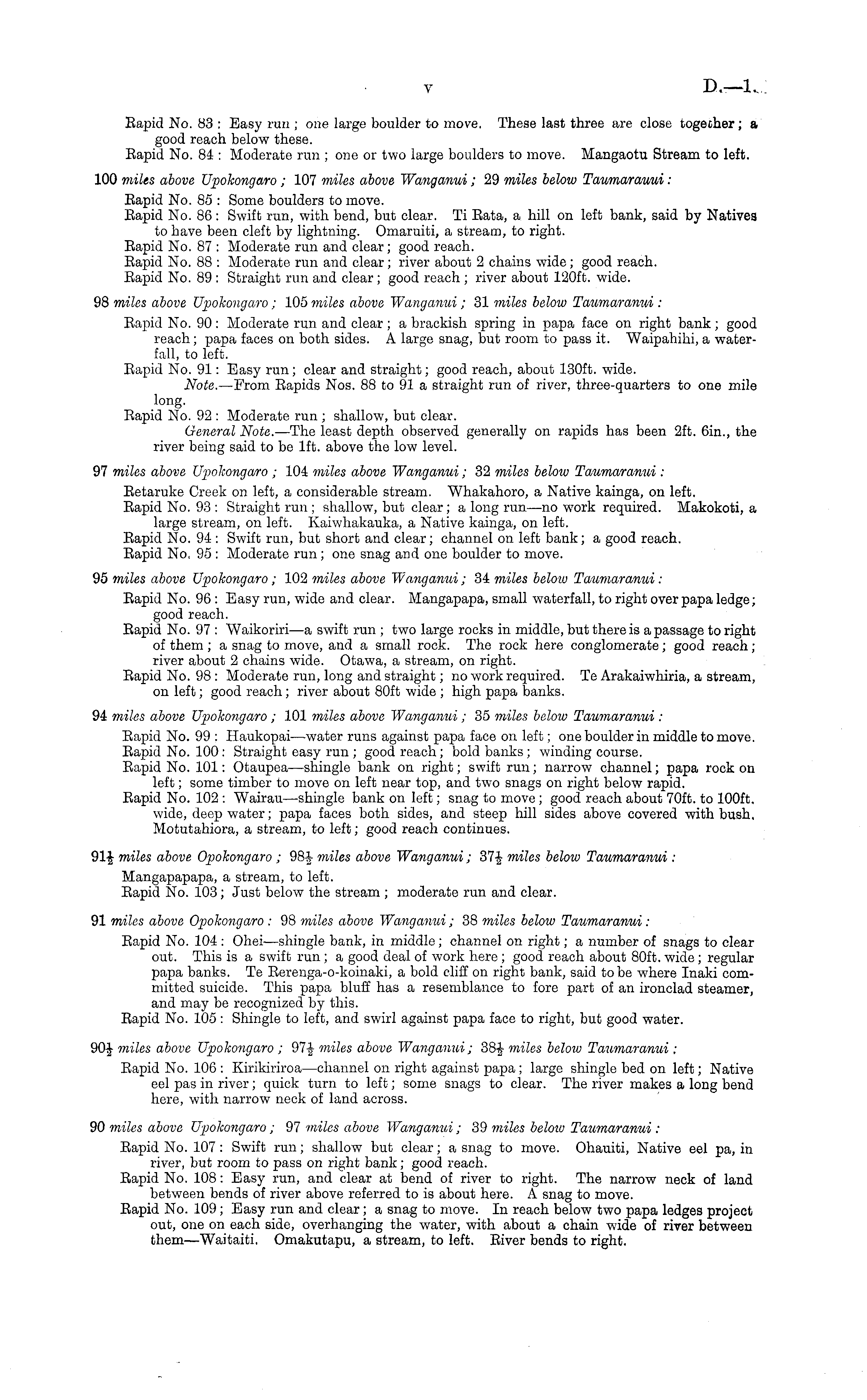 Eapid No. 83 : Easy run ; one large boulder to move. These last three are close together; a good reach below these. Eapid No. 84 : Moderate run ; one or two large boulders to move. Mangaotu Stream to left. 100 miles above Upokongaro ; 107 miles above Wanganui ; 29 miles below Taumarauui : Eapid No. 85 : Some boulders to move. Eapid No. 86 : Swift run, with bend, but clear. Ti Eata, a hill on left bank, said by Natives to have been cleft by lightning. Omaruiti, a stream, to right. Eapid No. 87 : Moderate run and clear; good reach. Eapid No. 88 : Moderate run and clear; river about 2 chains wide ; good reach. Eapid No. 89 : Straight run and clear; good reach ; river about 120 ft. wide. 98 miles above Upokongaro; 105 miles above Wanganui; 31 miles below Taumaranui : Eapid No. 90: Moderate run and clear; a brackish spring in papa face on right bank; good reach; papa faces on both sides. A large snag, but room to pass it. Waipahihi, a waterfall, to left. Eapid No. 91: Easy run; clear and straight; good reach, about 130 ft. wide. Note. —From Eapids Nos. 88 to 91 a straight run of river, three-quarters to one mile long. Eapid No. 92 : Moderate run ; shallow, but clear. General Note. —The least depth observed generally on rapids has been 2ft. 6in., the river being said to be lft. above the low level. 97 miles above Upokongaro ; 104 miles above Wanganui; 32 miles beloiv Taumaranni : Eetaruke Creek on left, a considerable stream. Whakahoro, a Native kainga, on left. Eapid No. 93 : Straight run ; shallow, but clear; a long run—no work required. Makokoti, a large stream, on left. Kaiwhakauka, a Native kainga, on left. Eapid No. 94 : Swift run, but short and clear; channel on left bank; a good reach. Eapid No. 95 : Moderate run; one snag and one boulder to move. 95 miles above Upokongaro; 102 miles above Wangatiui; 34 miles beloiv Taumaranui : Eapid No. 96 : Easy run, wide and clear. Mangapapa, small waterfall, to right over papa ledge; good reach. Eapid No. 97 : Waikoriri—a swift run ; two large rocks in middle, but there is a passage to right of them ; a snag to move, and a small rock. The rock here conglomerate; good reach; river about 2 chains wide. Otawa, a stream, on right. Eapid No. 98 : Moderate run, long and straight; no work required. Te Arakaiwhiria, a stream, on left; good reach; river about 80ft wide ; high papa banks. 94 miles above Upokongaro; 101 miles above Wanganui; 35 miles beloiv Taumaranui : Eapid No. 99 : Haukopai—water runs against papa face on left; one boulder in middle to move. Eapid No. 100 : Straight easy run ; good reach ; bold banks ; winding course. Eapid No. 101: Otaupea—shingle bank on right; swift run; narrow channel; papa rock on left; some timber to move on left near top, and two snags on right below rapid. Eapid No. 102 : Wairau—shingle bank on left; snag to move ; good reach about 70ft. to 100 ft. wide, deep water; papa faces both sides, and steep hill sides above covered with bush, Motutahiora, a stream, to left; good reach continues. 91 £ miles above Opokongaro ; 98f miles above Wanganui; 37|- miles below Taumaranui: Mangapapapa, a stream, to left. Eapid No. 103; Just below the stream ; moderate run and clear. 91 miles above Opokongaro : 98 miles above Wanganui ; 38 miles below Taumaranui: Eapid No. 104 : Ohei—shingle bank, in middle; channel on right; a number of snags to clear out. This is a swift run ; a good deal of work here ; good reach about 80ft. wide ; regular papa banks. Te Eerenga-o-koinaki, a bold cliff on right bank, said to be where Inaki committed suicide. This papa bluff has a resemblance to fore part of an ironclad steamer, and may be recognized by this. Eapid No. 105 : Shingle to left, and swirl against papa face to right, but good water. 90-J miles above Upokongaro ; 97-J miles above Wanganui; 38-J miles beloiv Taumaranui : Eapid No. 106 : Kirikiriroa—channel on right against papa ; large shingle bed on left; Native eel pas in river; quick turn to left; some snags to clear. The river makes a long bend here, with narrow neck of land across. 90 miles above Upokongaro ; 97 miles above Wanganui; 39 miles beloiv Taumaranui : Eapid No. 107 : Swift run; shallow but clear; a snag to move. Ohauiti, Native eel pa, in river, but room to pass on right bank; good reach. Eapid No. 108: Easy run, and clear at bend of river to right. The narrow neck of land between bends of river above referred to is about here. A snag to move. Eapid No. 109 ; Easy run and clear; a snag to move. In reach below two papa ledges project out, one on each side, overhanging the water, with about a chain wide of river between them—Waitaiti. Omakutapu, a stream, to left. Eiver bends to right.