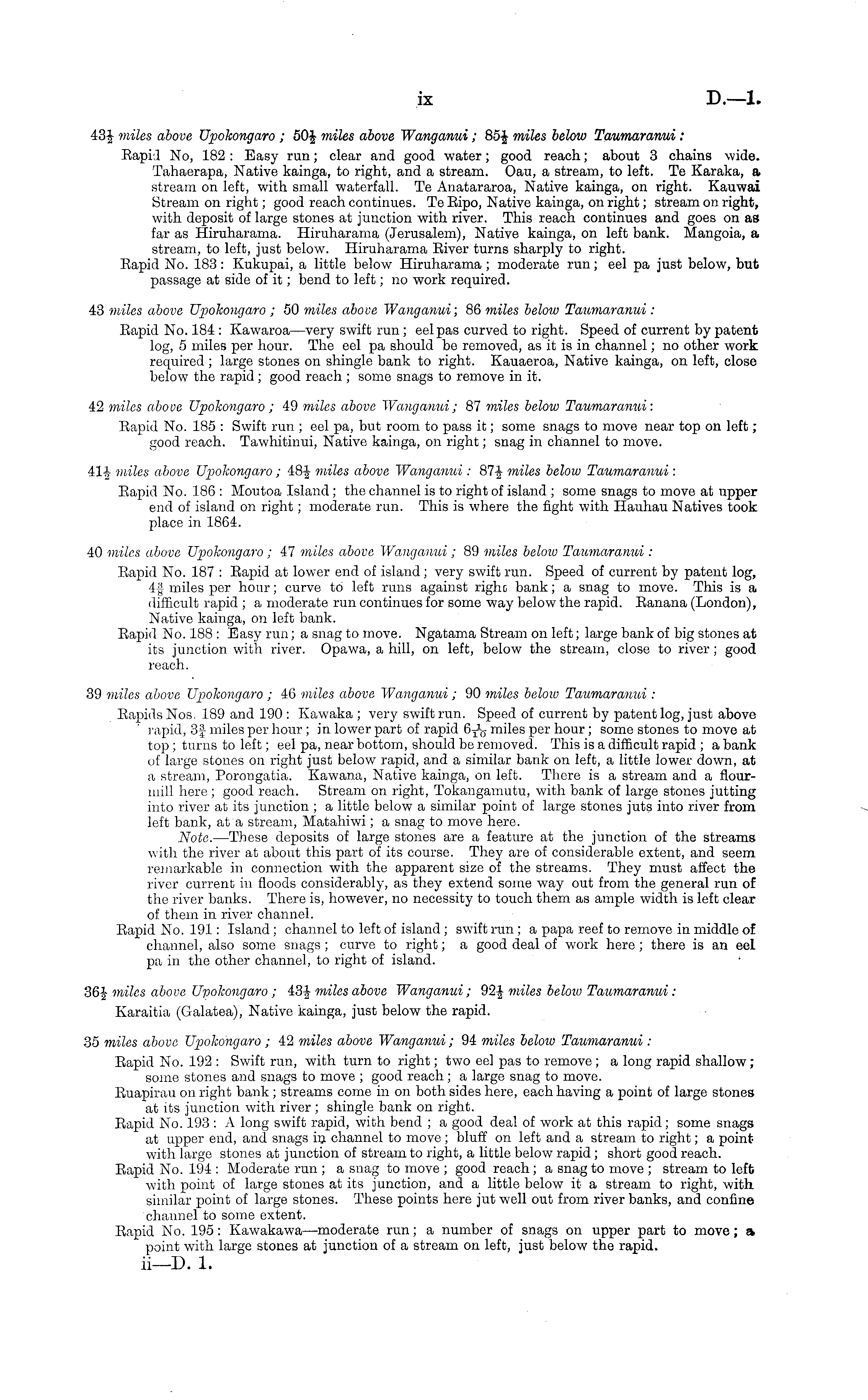 43-J- miles above Upokongaro ; 50J miles above Wanganui ; 85-J miles below Taumaranui : Bapid No, 182 : Easy run; clear and good water; good reach; about 3 chains wide. Tahaerapa, Native kainga, to right, and a stream. Oau, a stream, to left. Te Karaka, a stream on left, with small waterfall. Te Anatararoa, Native kainga, on right. Kauwai Stream on right; good reach continues. Te Eipo, Native kainga, on right; stream on right, with deposit of large stones at junction with river. This reach continues and goes on as far as Hiruharama. Hiruharama (Jerusalem), Native kainga, on left bank. Mangoia, a stream, to left, just below. Hiruharama Eiver turns sharply to right. Eapid No. 183 : Kukupai, a little below Hiruharama ; moderate run; eel pa just below, but passage at side of it; bend to left; no work required. 43 miles above Upokongaro ; 50 miles above Wanganui; 86 miles below Taumaranui : Eapid No. 184 : Kawaroa —very swift run ; eel pas curved to right. Speed of current by patent log, 5 miles per hour. The eel pa should be removed, as it is in channel; no other work required ; large stones on shinglo bank to right. Kauaeroa, Native kainga, on left, close below the rapid; good reach ; some snags to remove in it. 42 miles above Upokongaro ; 49 miles above Wanganui; 87 miles below Taumaranui: Eapid No. 185 : Swift run ; eel pa, but room to pass it; some snags to move near top on left ; good reach. Tawhitinui, Native kainga, on right; snag in channel to move. 41-J- miles above Upokongaro; 48-J miles above Wanganui: 87J miles below Taumaranui : Eapid No. 186 : Moutoa Island; the channel is to right of island ; some snags to move at upper end of island on right; moderate run. This is where the fight with Hauhau Natives took place in 1864. 40 miles above Upokongaro ; 47 miles above Wanganui; 89 miles below Taumaranui : Eapid No. 187 : Eapid at lower end of island ; very swift run. Speed of current by patent log, 4f miles per hour; curve to left runs against righo bank; a snag to move. This is a difficult rapid ; a moderate run continues for some way below the rapid. Eanana (London), Native kainga, on left bank. Eapid No. 188 : Easy run; a snag to move. Ngatama Stream on left; large bank of big stones at its junction with river. Opawa, a hill, on left, below the stream, close to river ; good reach. 39 miles above Upokongaro ; 46 miles above Wanganui ; 90 miles below Taumaranui : Eapids Nos. 189 and 190 : Kawaka ; very swift run. Speed of current by patent log, just above rapid, 3f miles per hour ; in lower part of rapid 6-fo miles per hour ; some stones to move at top ; turns to left; eel pa, near bottom, should be removed. This is a difficult rapid ; a bank of large stones on right just below rapid, and a similar bank on left, a little lower down, at a stream, Porongatia. Kawana, Native kainga, on left. There is a stream and a flourmill here; good roach. Stream on right, Tokanganmtu, with bank of large stones jutting into river at its junction ; a little below a similar point of large stones juts into river from left bank, at a stream, Matahiwi; a snag to move here. Note. —These deposits of large stones are a feature at the junction of the streams with the river at about this part of its course. They are of considerable extent, and seem remarkable in connection with the apparent size of the streams. They must affect the river current in floods considerably, as they extend some way out from the general run of the river banks. There is, however, no necessity to touch them as ample width is left clear of them in river channel. Eapid No. 191: Island ; channel to left of island ; swift run ; a papa reef to remove in middle of channel, also some snags ; curve to right; a good deal of work here ; there is an eel pa in the other channel, to right of island. 36J miles above Upokongaro ; 43J miles above Wanganui; 92J miles beloio Taumaranui : Karaitia (Galatea), Native kainga, just below the rapid. 35 miles above Upokongaro ; 42 miles above Wanganui; 94 miles below Taumaranui : Eapid No. 192 : Swift run, with turn to right; two eel pas to remove ; a long rapid shallow; some stones and snags to move ; good reach; a large snag to move. Euapirau on right bank ; streams come in on both sides here, each having a point of large stones at its junction with river ; shingle bank on right. Eapid No. 193: A long swift rapid, with bend ; a good deal of work at this rapid; some snags at upper end, and snags in channel to move ; bluff on left and a stream to right; a point with large stones at junction of stream to right, a little below rapid ; short good reach. Eapid No. 194 : Moderate run ; a snag to move ; good reach ; a snag to move ; stream to left with point of large stones at its junction, and a little below it a stream to right, with similar point of large stones. These points here jut well out from river banks, and confine channel to some extent. Eapid No. 195: Kawakawa —moderate run; a number of snags on upper part to move; a point with large stones at junction of a stream on left, just below the rapid. ii—D. 1.