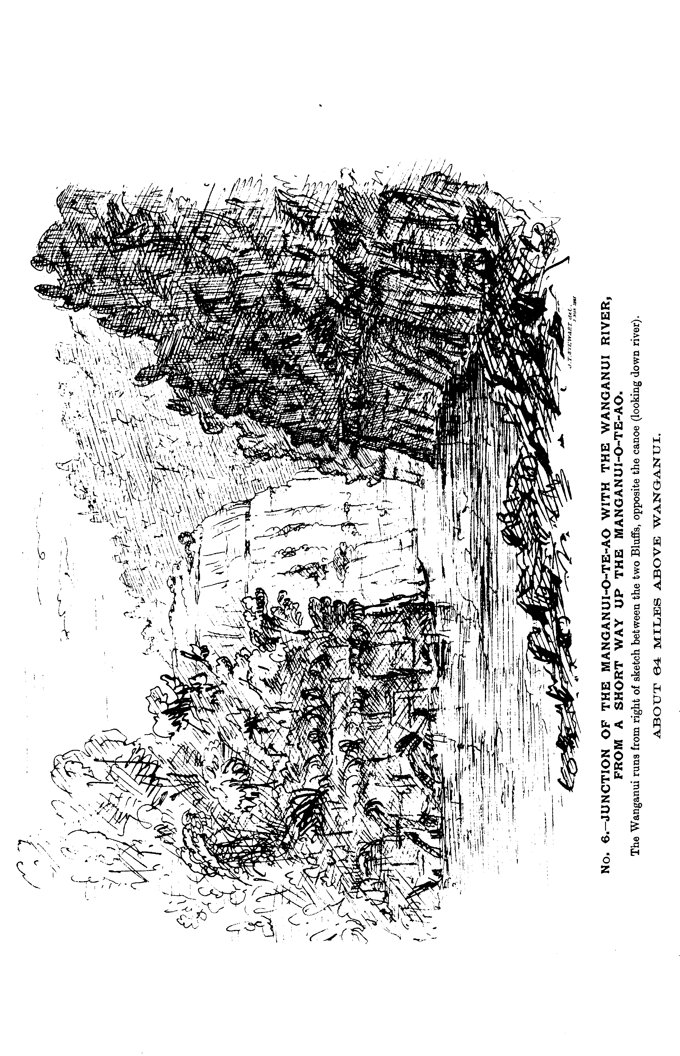No. 6.-JUNCTION OF THE MANGANUI-O-TE-AO WITH THE WANGANUI RIVER, FROM A SHORT WAY UP THE MANGANUI-O-TE-AO. The Wanganui runs from right of sketch between the two Bluffs, opposite the canoe (looking down river). ABOUT 64 MILES ABOVE WANGANUI.