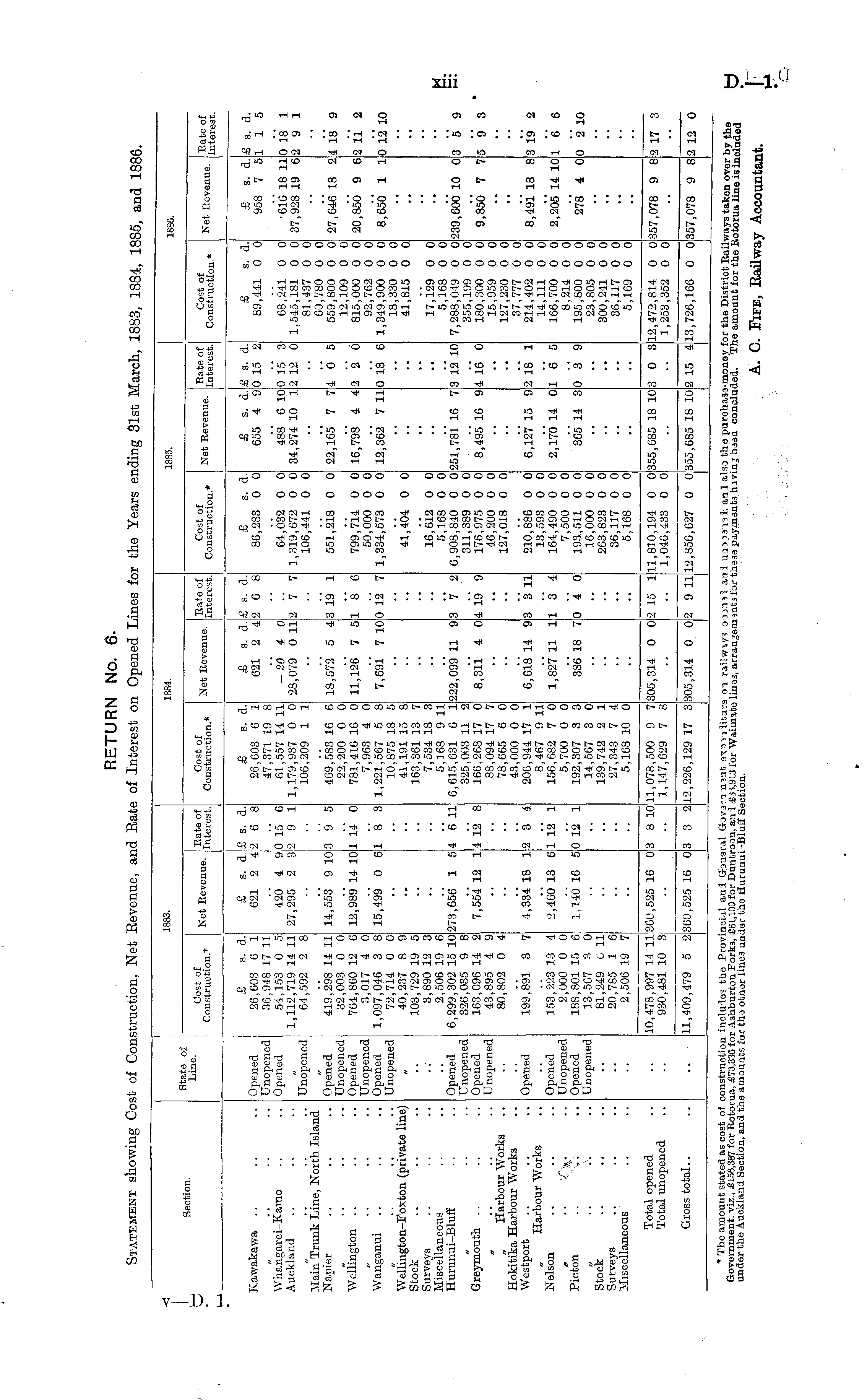 RETURN No. 6. Statement showing Cost of Construction, Net Revenue, and Rate of Interest on Opened Lines for the Years ending 3lst March, 1883, 1884, 1885, and 1886.
