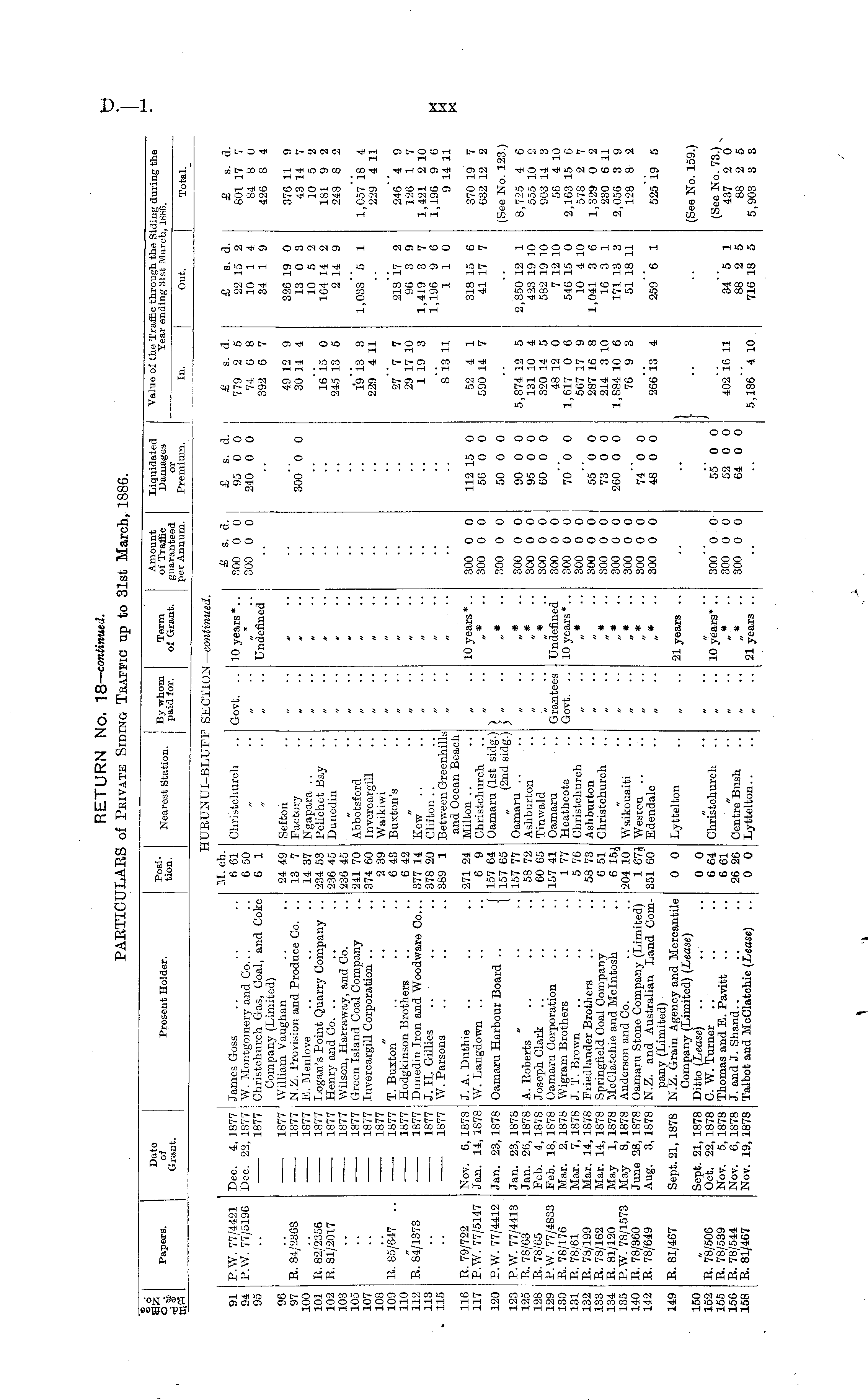 B1« Papers. Dato of Grant. Present Holder. Position. Nearest Station. Term of Grant. Amount of Traffic guaranteed per Annum. Liquidated Damages or Premium. Value of the Traffic through the Siding during the Year ending 31st March, 1886. In. Out. Total. In. Out. Total. :URTJNUI-BLUPF SECTION — continued. 91 94 95 P.W. 77/4421 P.W. 77/5196 Dec. 4, 1877 Dec. 22, 1877 1877 James Goss W. Montgomery and Co... Christchurch Gas, Coal, and Coke Company (Limited) William Vaughan N.Z. Provision and Produce Co. .. E. Menlove Logan's Point Quarry Company .. Henry and Co. Wilson, Harraway, and Co. Green Island Coal Company Invercargill Corporation .. M. ch. 6 61 6 50 6 1 Christclrurch Govt. .. I 10 years *.. Undefined £ s. d. 300 0 0 300 0 0 £ s. d. 95 0 0 240 0 0 £ s. d. 779 2 5 74 6 8 392 6 7 £ s. d. 22 15 2 10 1 4 34 1 9 £ s. d. 801 17 7 84 8 0 426 8 4 96 97 100 101 102 103 105 107 108 109 110 112 113 115 R. 84/2368 R. 82/2356 B. 81/2017 1877 1877 1877 1877 1877 1877 1877 1877 1877 1877 1877 1877 1877 1877 24 49 13 7 14 37 234 53 236 45 236 45 241 70 374 60 2 39 0 43 6 42 377 14 378 20 389 1 Sefton Factory Ngapara Pclichet Bav Dunedin Abbotsford Invercargill Waikiwi Buxton's 300 0 0 49 12 9 30 14 4 16 15 0 245 13 5 A 13 3 229 4 11 326 19 0 13 0 3 10 5 2 164 14 2 2 14 9 1,038 5 1 376 11 9 43 14 7 10 5 2 181 9 2 248 8 2 1,057 18 4 229 4 11 E. 85/647 .. T. Buxton" .. .. .. Hodgkinson Brothers Dunedin Iron and Woodware Co... J. H. Gillies W. Parsons 27 7 7 29 17 10 1 19 3 218 17 2 96 3 9 1,419 3 7 1,196 9 6 110 246 4 9 126 1 7 1,421 2 10 1,196 9 6 9 14 11 R. 84/1373 Kew Clifton Between Greenhills and Ocean Beacli Milton Christchurch Oamaru (1st sidg.) (2nd sidg.) Oamaru Ashburton Tinwald Oamaru Heath cote Christchurch Ashburton Christchurch 8 13 11 116 117 R. 79/722 P.W. 77/5147 Nov. 6, 1878 Jan. 14, 1878 J. A. Duthie W. Langdown Oamaru Harbour Board .. J 271 24 6 9 157 64 157 65 157 77 58 72 60 65 157 41 1 77 5 76 58 73 6 51 6 15J 204 10 1 67J 351 60' 10 years * .. 300 0 0 300 0 0 112 15 0 56 0 0 52 4 1 590 14 7 318 15 6 41 17 7 370 19 7 632 12 2 . .. 120 P.W. 77/4412 Jan. 23, 1878 1 • 300 0 0 50 0 0 (See No. 123.; 123 125 12S 129 130 131 132 133 134 135 140 142 P.W. 77/4413 R. 78/63 B. 78/G5 P.W. 77/4833 R. 78/176 R. 78/61 R. 78/199 R. 78/162 R. 81/120 P.W. 78/1573 B. 78/360 R. 78/649 Jan. 23, 1878 Jan. 26, 1878 Feb. 4, 1878 Feb. 18, 1878 Mar. 2, 1878 Mar. 7, 1878 Mar. 14, 1878 Mar. 14, 187S May 1, 1878 May 8, 1878 June 28, 1878 Aug. 3, 1878 A. Roberts Joseph Clark Oamaru Corporation Wigram Brothers J. T. Brown Friedlander Brothers Springfield Coal Company McClatchie and Mclntoali Anderson and Co. Oamaru Stone Company (Limited) N.Z. and Australian Land Company (Limited) N.Z. Grain Agency and Mercantile Company (Limited) (Lease) Ditto (Lease) .. ..' C. W. Turner Thomas and E. Pavitt J. and J. Shand.. Talbot and McClatchie (Lease) Grantees Govt. .. Undefined 10 years *.. # 300 0 0 300 0 0 300 0 0 300 0 0 800 0 0 300 0 0 300 0 0 300 0 0 300 0 0 300 0 0 300 0 0 300 0 0 90 0 0 95 0 0 60 0 0 70 0 0 55 0 0 73 0 0 260 0 0 5,874 12 5 131 10 4 320 14 5 48 12 0 1,617 0 6 567 17 9 287 16 8 214 3 10 1,884 10 6 76 9 3 2,850 12 1 423 19 10 582 19 10 7 12 10 546 15 0 10 4 10 1,041 3 C 16 3 1 171 13 3 51 18 11 8,7:25 4 6 555 10 2 903 14 3 50 4 10 2,103 15 6 578 2 7 1,329 0 2 230 6 11 2,056 3 9 128 8 2 Waikouaiti Weston Edendale " * " * • 74 0 0 48 0 0 266 13 4 259 G 1 525 19 5 149 R. 81/467 Sept. 21, 1878 0 0 Lyttelton 21 years .. } (See No. 159.) 150 152 155 156 158 R. 78/506 R. 78/539 R. 78/544 R. 81/467 Sept. 21, 1878 Oct. 22, 1878 Nov. 5, 1878 Nov. 0, 1878 Nov. 19, 1878 0 0 6 64 6 61 26 26 0 0 Christchurch 10 years* .. 300 0 0 300 0 0 300 0 0 55 0 0 52 0 0 64 0 0 402 16 11 34 5 1 88 2 5 716 18 5 (See No. 73.) 437 2 0 88 2 5 5,903 3 3 Centre Bush Lyttelton.. 21 yeara .. 5,186 4 10 . „ ..