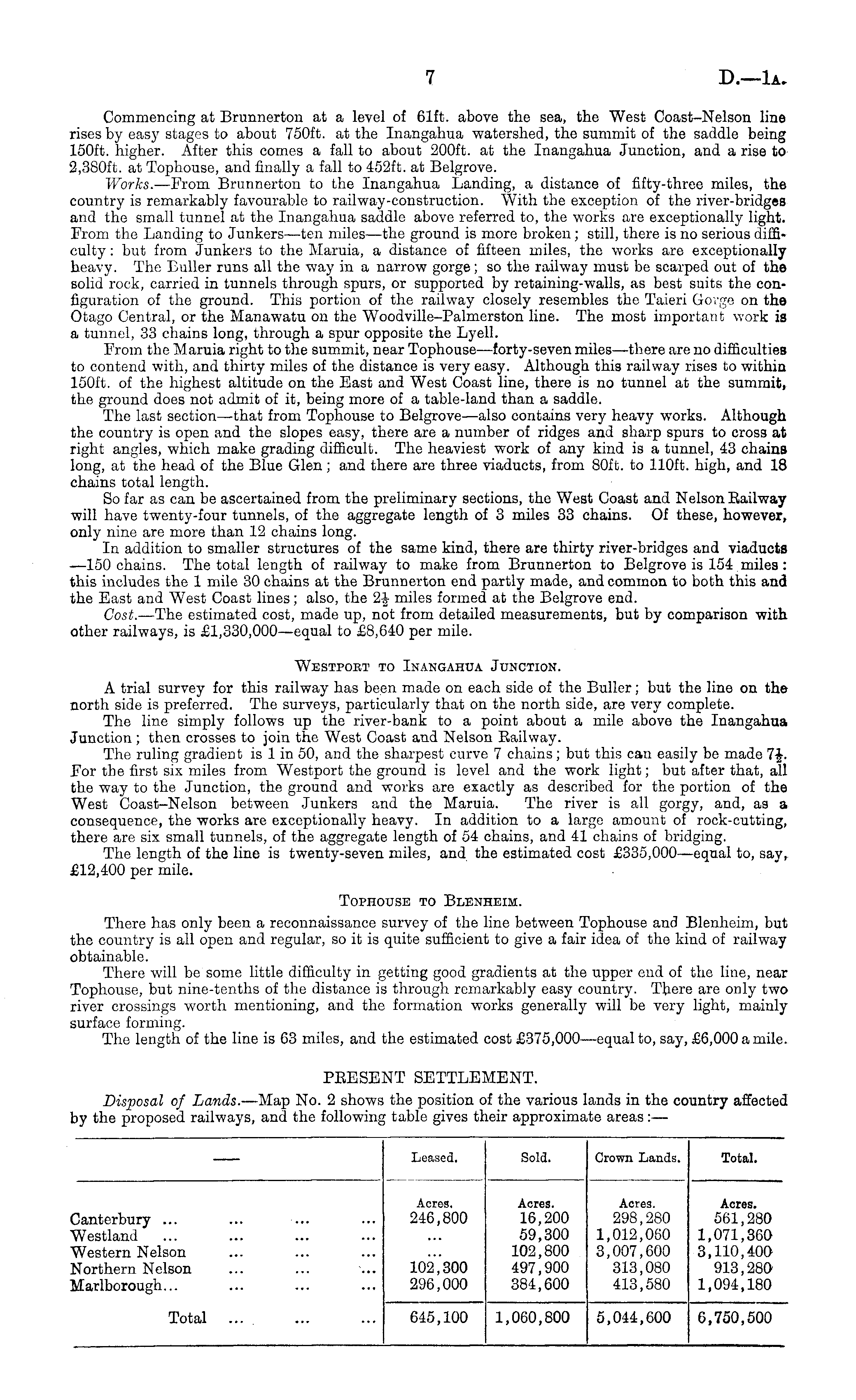 Commencing at Brunnerton at a level of 61ft. above the sea, the West Coast-Nelson line rises by easy stages to about 750 ft. at the Inangah.ua watershed, the summit of the saddle being 150 ft. higher. After this comes a fall to about 200 ft. at the Inangahua Junction, and a rise to 2,380 ft. at Tophouse, and finally a fall to 452 ft. at Belgrove. Works. —From Brunnerton to the Inangahua Landing, a distance of fifty-three miles, the country is remarkably favourable to railway-construction. With the exception of the river-bridges and the small tunnel at the Inangahua saddle above referred to, the works are exceptionally light. From the Landing to Junkers—ten miles—the ground is more broken ; still, there is no serious difficulty : but from Junkers to the Maruia, a distance of fifteen miles, the works are exceptionally heavy. The Buller runs all the way in a narrow gorge ;so the railway must be scarped out of the solid rock, carried in tunnels through spurs, or supported by retaining-walls, as best suits the configuration of the ground. This portion of the railway closely resembles the, Taieri Gorge on the Otago Central, or the Manawatu on the Woodville-Palmerston line. The most important work is a tunnel, 33 chains long, through a spur opposite the Lyell. From the Maruia right to the summit, near Tophouse—forty-seven miles—there are no difficulties to contend with, and thirty miles of the distance is very easy. Although this railway rises to within 150 ft. of the highest altitude on the East and West Coast line, there is no tunnel at the summit, the ground does not admit of it, being more of a table-land than a saddle. The last section—that from Tophouse to Belgrove—also contains very heavy works. Although the country is open and the slopes easy, there are a number of ridges and sharp spurs to cross at right angles, which make grading difficult. The heaviest work of any kind is a tunnel, 43 chains long, at the head of the Blue Glen; and there are three viaducts, from 80ft. to 110 ft. high, and 18 chains total length. So far as can be ascertained from the preliminary sections, the West Coast and Nelson Railway will have twenty-four tunnels, of the aggregate length of 3 miles 33 chains. Of these, however, only nine are more than 12 chains long. In addition to smaller structures of the same kind, there are thirty river-bridges and viaducts —150 chains. The total length of railway to make from Brunnerton to Belgrove is 154 miles: this includes the 1 mile 30 chains at the Brunnerton end partly made, and common to both this and the East and West Coast lines; also, the 2J miles formed at the Belgrove end. Cost. —The estimated cost, made up, not from detailed measurements, but by comparison with other railways, is £1,330,000 —equal to £8,640 per mile. Westpoet to Inangahua Junction. A trial survey for this railway has been made on each side of the Buller; but the line on the north side is preferred. The surveys, particularly that on the north side, are very complete. The line simply follows up the river-bank to a point about a mile above the Inangahua Junction; then crosses to join the West Coast and Nelson Bailway. The ruling gradient is lin 50, and the sharpest curve 7 chains; but this can easily be made 7A. For the first six miles from Westport the ground is level and the work light; but after that, all the way to the Junction, the ground and works are exactly as described for the portion of the West Coast-Nelson between Junkers and the Maruia. The river is all gorgy, and, as a consequence, the works are exceptionally heavy. In addition to a large amount of rock-cutting, there are six small tunnels, of the aggregate length of 54 chains, and 41 chains of bridging. The length of the line is twenty-seven miles, and the estimated cost £335,000—equal to, say, £12,400 per mile. Tophouse to Blenheim. There has only been a reconnaissance survey of the line between Tophouse and Blenheim, but the country is all open and regular, so it is quite sufficient to give a fair idea of the kind of railway obtainable. There will be some little difficulty in getting good gradients at the upper end of the line, near Tophouse, but nine-tenths of the distance is through remarkably easy country. There are only two river crossings worth mentioning, and the formation works generally will be very light, mainly surface forming. The length of the line is 63 miles, and the estimated cost £375,000—equal to, say, £6,000 a mile.