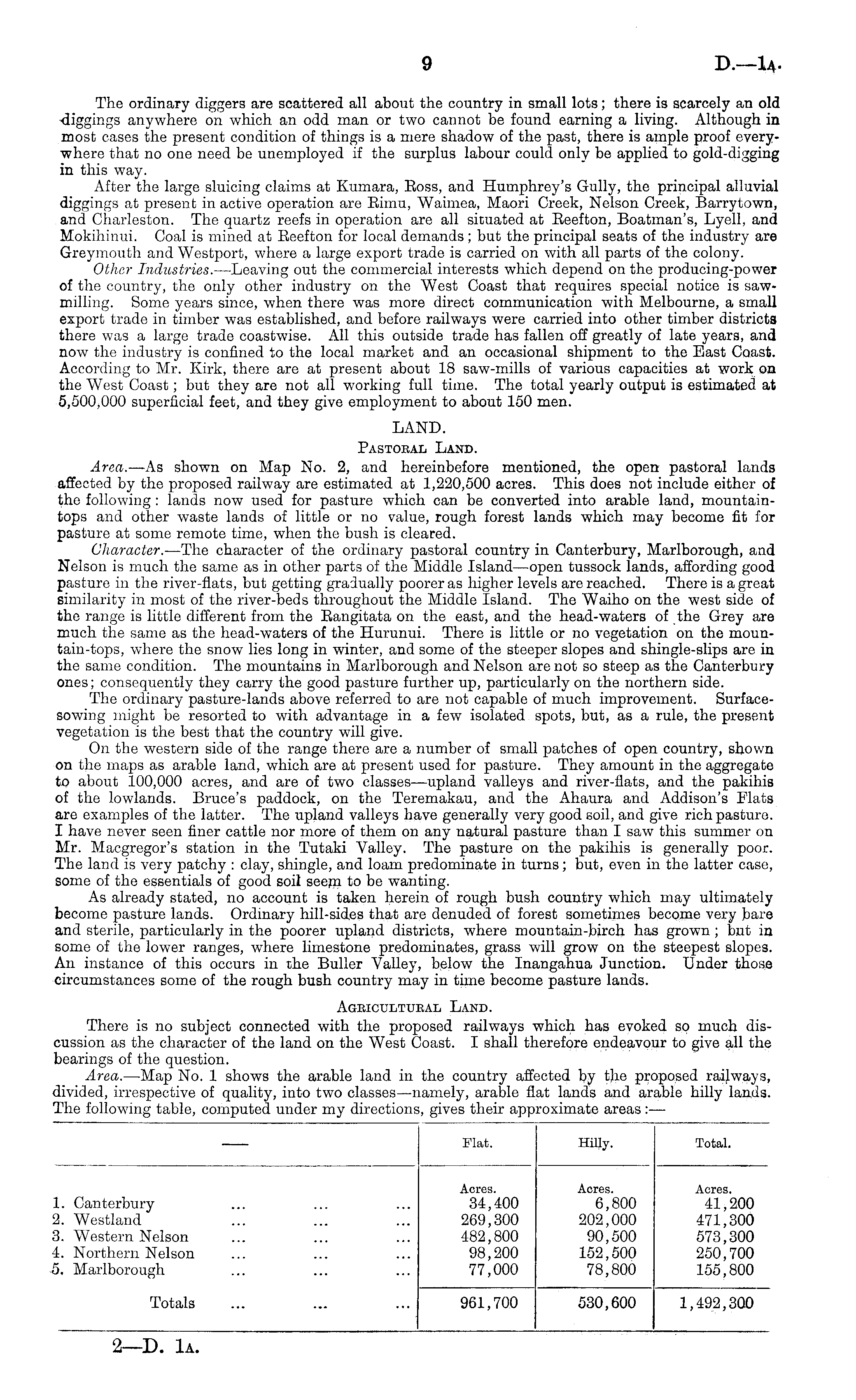 Plat. Hilly. Total. 1. Canterbury 2. Westland 3. Western Nelson 4. Northern Nelson 5. Marlborough Acres. 34,400 269,300 482,800 98,200 77,000 Acres. 6,800 202,000 90,500 152,500 78,800 Acres. 41,200 471,300 573,300 250,700 155,800 Totals 961,700 530,600 1,492,300
