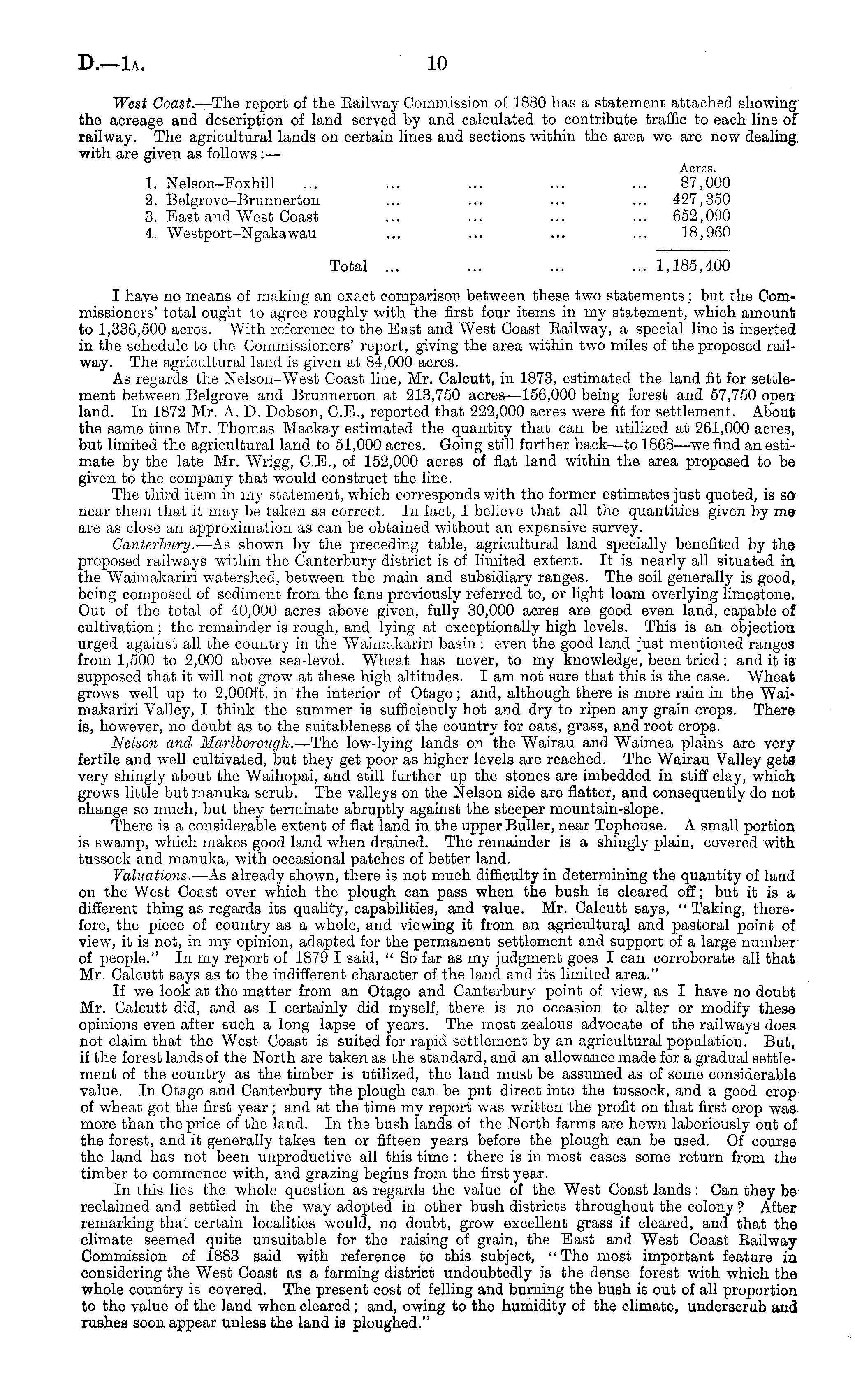 West Coast. —Tho report of the Bailway Commission of 1880 has a statement attached showing the acreage and description of land served by and calculated to contribute traffic to each line of railway. The agricultural lands on certain lines and sections within the area we are now dealing, with are given as follows : — 1. Nelson-Foxhill ... ... ... ... ... 87,000 2. Belgrove-Brunnerton ... ... ... ... 427,350 3. Bast and West Coast ... ... ... ... 652,090 4. Westport-Ngakawau ... ... ... ... 18,960 Total ... ... ... ... 1,185,400 I have no means of making an exact comparison between these two statements ; but tho Commissioners' total ought to agree roughly with the first four items in my statement, which amount to 1,336,500 acres. With reference to the Bast and West Coast Eailway, a special line is inserted , in the schedule to the Commissioners' report, giving the area within two miles of the proposed railway. The agricultural land is given at 84,000 acres. As regards the Nelson-West Coast line, Mr. Calcutt, in 1873, estimated the land fit for settlement between Belgrove and Brunnerton at 213,750 acres—ls6,ooo being forest and 57,750 open land. In 1872 Mr. A. D. Dobson, C.E., reported that 222,000 acres were fit for settlement. About the same time Mr. Thomas Mackay estimated the quantity that can be utilized at 261,000 acres, but limited the agricultural land to 51,000 acres. Going still further back—to 1868—we find an estimate by the late Mr. Wrigg, C.8., of 152,000 acres of flat land within the area proposed to be given to the company that would construct the line. The third item in my statement, which corresponds with the former estimates just quoted, is so near them that it may be taken as correct. In fact, I believe that all the quantities given by me are as close an approximation as can be obtained without an expensive survey. Canterbury. —As shown by the preceding table, agricultural land specially benefited by the proposed railways within the Canterbury district is of limited extent. It is nearly all situated in the Wahnakariri watershed, between the main and subsidiary ranges. The soil generally is good, being composed of sediment from the fans previously referred to, or light loam overlying limestone. Out of the total of 40,000 acres above given, fully 30,000 acres are good even land, capable of cultivation ; the remainder is rough, and lying at exceptionally high levels. This is an objection urged against all tho country in the Waimakariri basin : even the good land just mentioned range 3 from 1,500 to 2,000 above sea-level. Wheat has never, to my knowledge, been tried; and it is supposed that it will not grow at these high altitudes. lam not sure that this is the case. Wheat grows well up to 2,000 ft. in the interior of Otago; and, although there is more rain in the Waimakariri Valley, I think the summer is sufficiently hot and dry to ripen any grain crops. There is, however, no doubt as to the suitableness of the country for oats, grass, and root crops. Nelson and Marlborough. —The low-lying lands on the Wairau and Waimea plains are very fertile and well cultivated, but they get poor as higher levels are reached. The Wairau Valley gets very shingly about the Waihopai, and still further up the stones are imbedded in stiff clay, which grows little but manuka scrub. The valleys on the Nelson side are flatter, and consequently do not change so much, but they terminate abruptly against the steeper mountain-slope. There is a considerable extent of flat land in the upper Buller, near Tophouse. A small portion is swamp, which makes good land when drained. The remainder is a shingly plain, covered with tussock and manuka, with occasional patches of better land. Valuations. —As already shown, there is not much difficulty in determining the quantity of land on the West Coast over which the plough can pass when the bush is cleared off; but it is a different thing as regards its quality, capabilities, and value. Mr. Calcutt says, "Taking, therefore, the piece of country as a whole, and viewing it from an agricultural and pastoral point of view, it is not, in my opinion, adapted for the permanent settlement and support of a large number of people." In my report of 1879 I said, "So far as my judgment goes I can corroborate all that Mr. Calcutt says as to the indifferent character of the land and its limited area." If we look at the matter from an Otago and Canterbury point of view, as I have no doubt Mr. Calcutt did, and as I certainly did myself, there is no occasion to alter or modify these opinions even after such a long lapse of years. The most zealous advocate of the railways does not claim that the West Coast is suited for rapid settlement by an agricultural population. But, if the forest lands of the North are taken as the standard, and an allowance made for a gradual settlement of the country as the timber is utilized, the land must be assumed as of some considerable value. In Otago and Canterbury the plough can be put direct into the tussock, and a good crop of wheat got the first year; and at the time my report was written the profit on that first crop was more than the price of the land. In the bush lands of the North farms are hewn laboriously out of the forest, and it generally takes ten or fifteen years before the plough can be used. Of course the land has not been unproductive all this time : there is in most cases some return from the timber to commence with, and grazing begins from the first year. In this lies the whole question as regards the value of the West Coast lands: Can they be reclaimed and settled in the way adopted in other bush districts throughout the colony ? After remarking that certain localities would, no doubt, grow excellent grass if cleared, and that the climate seemed quite unsuitable for the raising of grain, the East and West Coast Eailway Commission of 1883 said with reference to this subject, " The most important feature in considerin