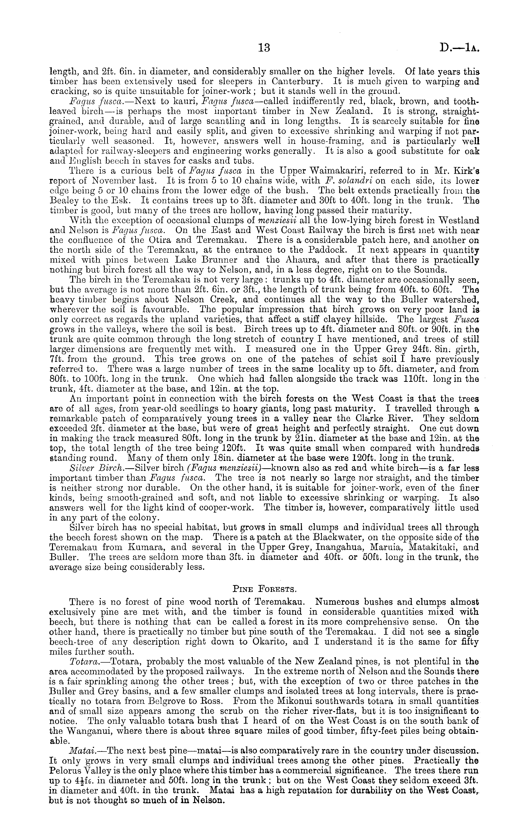 length, and 2ft. 6in. in diameter, and considerably smaller on the higher levels. Of late years this timber has been extensively used for, sleepers in Canterbury. It is much given to warping and cracking, so is quite unsuitable for joiner-work; but it stands well in the ground. Fagus fusca. —Next to kauri, Fagus fusea —called indifferently red, black, brown, and toothleaved birch —is perhaps the most important timber in New Zealand. It is strong, straightgrained, and durable, and of large scantling and in long lengths. It is scarcely suitable for fine joiner-work, being hard and easily split, and given to excessive shrinking and warping if not particularly well seasoned. It, however, answers well in house-framing, and is particularly well adapted for railway-sleepers and engineering works generally. It is also a good substitute for oak and English beech in staves for casks and tubs. There is a curious belt of Fagus fusca in the Upper Waimakariri, referred to in Mr. Kirk's report of November last. It is from sto 10 chains wide, with F. solandri on each side, its lower edge being sor 10 chains from the lower edge of the bush. The belt extends practically from the Bealey to the Esk. It contains trees up to 3ft. diameter and 30ft to 40ft. long in the trunk. The timber is good, but many of the trees are hollow, having long passed their maturity. With the exception of occasional clumps of menziesii all the low-lying birch forest in Westland and Nelson is Fagus fusca. On the East and West Coast Eailway the birch is first met with near the confluence of the Otira and Teremakau. There is a considerable patch here, and another on the north side of the Teremakau, at the entrance to the Paddock. It next appears in quantitymixed with pines between Lake Brunnor and the Ahaura, and after that there is practically nothing but birch forest all the way to Nelson, and, in a less degree, right on to the Sounds. The birch in the Teremakau is not very large : trunks up to 4ft. diameter are occasionally seen, but the average is not more than 2ft. 6in. or 3ft., the length of trunk being from 40ft. to 60ft. The heavy timber begins about Nelson Creek, and continues all the way to the Buller watershed, wherever the soil is favourable. The popular impression that birch grows on very poor land is only correct as regards the upland varieties, that affect a stiff clayey hillside. The largest Fusca grows in the valleys, where the soil is best. Birch trees up to 4ft. diameter and 80ft. or 90ft. in the trunk are quite common through the long stretch of country I have mentioned, and trees of still larger dimensions are frequently met with. I measured one in the Upper Grey 24ft. Bin. girth, 7ft. from the ground. This tree grows on one of the patches of schist soil I have previously referred to. There was a large number of trees in the same locality up to sft. diameter, and from 80ft. to 100 ft. long in the trunk. One which had fallen alongside the track was 110 ft. long in the trunk, 4ft. diameter at the base, and 12in. at the top. An important point in connection with the birch forests on the West Coast is that the trees are of all ages, from year-old seedlings to hoary giants, long past maturity. I travelled through a remarkable patch of comparatively young trees in a valley near the Clarke Eiver. They seldom exceeded 2ft. diameter at the base, but were of great height and perfectly straight. One cut down in making the track measured 80ft. long in the trunk by 21in. diameter at the base and 12in. at the top, the total length of the tree being 120 ft. It was quite small when compared with hundreds standing round. Many of them only 18in. diameter at the base were 120 ft. long in the trunk. Silver Birch. —Silver birch (Fagus menziesii) —known also as red and white birch—is a far less important timber than Fagus fusca. The tree is not nearly so large nor straight, and the timber is neither strong nor durable. On the other hand, it is suitable for joiner-work, even of the finer kinds, being smooth-grained and soft, and not liable to excessive shrinking or warping. It also answers well for the light kind of cooper-work. The timber is, however, comparatively little used in any part of the colony. Silver birch has no special habitat, but grows in small clumps and individual trees all through the beech forest shown on the map. There is a patch at the Blackwater, on the opposite side of the Teremakau from Kumara, and several in the Upper Grey, Inangahua, Maruia, Matakitaki, and Buller. The crees are seldom more than 3ft. in diameter and 40ft. or 50ft. long in the trunk, the average size being considerably less. Pine Forests. There is no forest of pine wood north of Teremakau. Numerous bushes and clumps almost exclusively pine are met with, and the timber is found in considerable quantities mixed with beech, but there is nothing that can be called a forest in its more comprehensive sense. On the other hand, there is practically no timber but pine south of the Teremakau. I did not see a single beech-tree of any description right down to Okarito, and I understand it is the same for fifty miles further south. Totara. —Totara, probably the most valuable of the New Zealand pines, is not plentiful in the area accommodated by the proposed railways. In the extreme north of Nelson and the Sounds there is a fair sprinkling among the other trees ; but, with the exception of two or three patches in the Buller and Grey basins, and a few smaller clumps and isolated trees at long intervals, there is practically no totara from Belgrove to Eoss. From the Mikonui southwards totara in small quantities and of small size appears among the scrub on the richer river-flats, but it is too insignificant to notice. The only valuable totara bush that I heard of on the West Coast is on the south bank of the Wanganui, where there is about three square miles of good timber, fifty-feet piles being obtainable. Matai. —The next best pine—matai—i