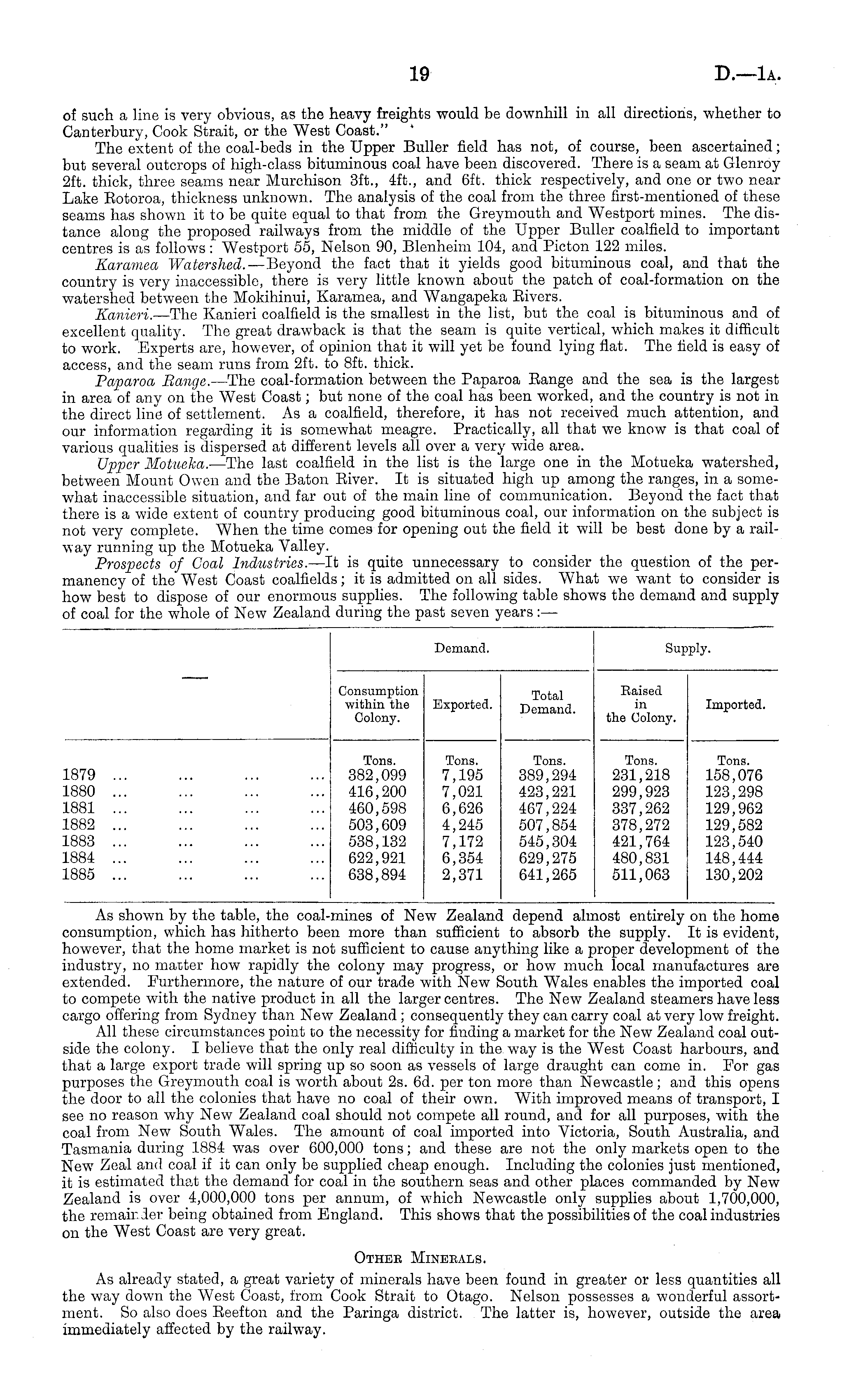 of such a line is very obvious, as the heavy freights would be downhill in all directions, whether to Canterbury, Cook Strait, or the "West Coast." The extent of the coal-beds in the Upper Buller field has not, of course, been ascertained; but several outcrops of high-class bituminous coal have been discovered. There is a seam at Glenroy 2ft. thick, three seams near Murchison 3ft., 4ft., and 6ft. thick respectively, and one or two near Lake Eotoroa, thickness unknown. The analysis of the coal from the three first-mentioned of these seams has shown it to be quite equal to that from the Greymouth and Westport mines. The distance along the proposed railways from the middle of the Upper Buller coalfield to important centres is as follows: Westport 55, Nelson 90, Blenheim 104, and Picton 122 miles. Karamea Watershed. —Beyond the fact that it yields good bituminous coal, and that the country is very inaccessible, there is very little known about the patch of coal-formation on the watershed between the Mokihinui, Karamea, and Wangapeka Eivers. Kanieri. —The Kanieri coalfield is the smallest in the list, but the coal is bituminous and of excellent quality. The great drawback is that the seam is quite vertical, which makes it difficult to work. Experts are, however, of opinion that it will yet be found lying flat. The field is easy of access, and the seam runs from 2ft. to Bft. thick. Paparoa Range. —The coal-formation between the Paparoa Range and the sea is the largest in area of any on the West Coast; but none of the coal has been worked, and the country is not in the direct line of settlement. As a coalfield, therefore, it has not received much attention, and our information regarding it is somewhat meagre. Practically, all that we know is that coal of various qualities is dispersed at different levels all over a very wide area. Upper Motueka. —The last coalfield in the list is the large one in the Motueka watershed, between Mount Owen and the Baton River. It is situated high up among the ranges, in a somewhat inaccessible situation, and far out of the main line of communication. Beyond the fact that there is a wide extent of country producing good bituminous coal, our information on the subject is not very complete. When the time comes for opening out the field it will be best done by a railway running up the Motueka Valley. Prospects of Goal Industries. —lt is quite unnecessary to consider the question of the permanency of the West Coast coalfields; it is admitted on all sides. What we want to consider is how best to dispose of our enormous supplies. The following table shows the demand and supply of coal for the whole of New Zealand during the past seven years:—