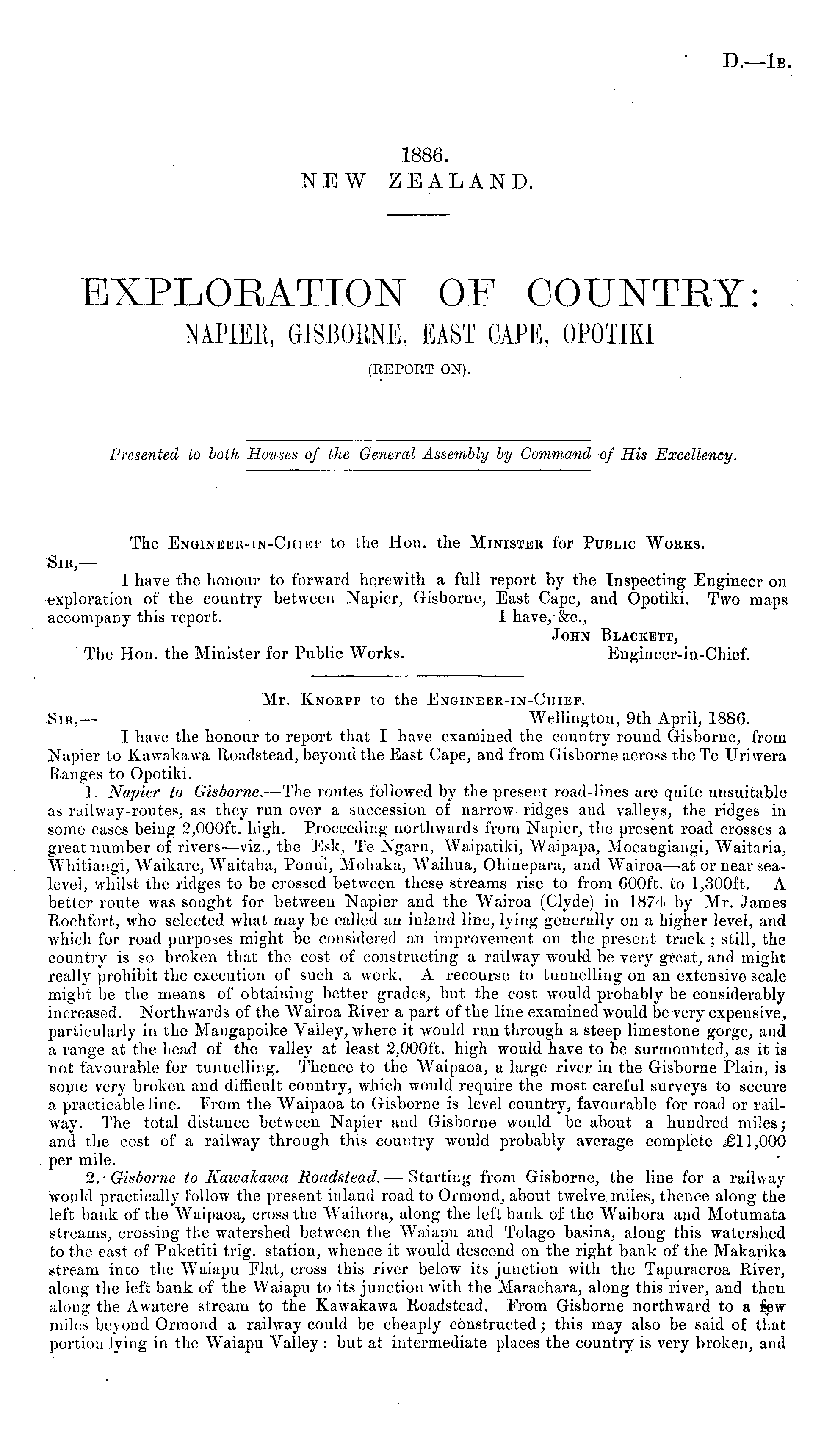 The Engineek-in-Chiei , to the Hon. the Minister for Public Works. Sir,— I have the honour to forward herewith a full report by the Inspecting Engineer on exploration of the country between Napier, Gisbornc, East Cape, and Opotiki. Two maps accompany this report. I have, &c, John Blackett, The Hon. the Minister for Public Works. Engineer-in-Chief.