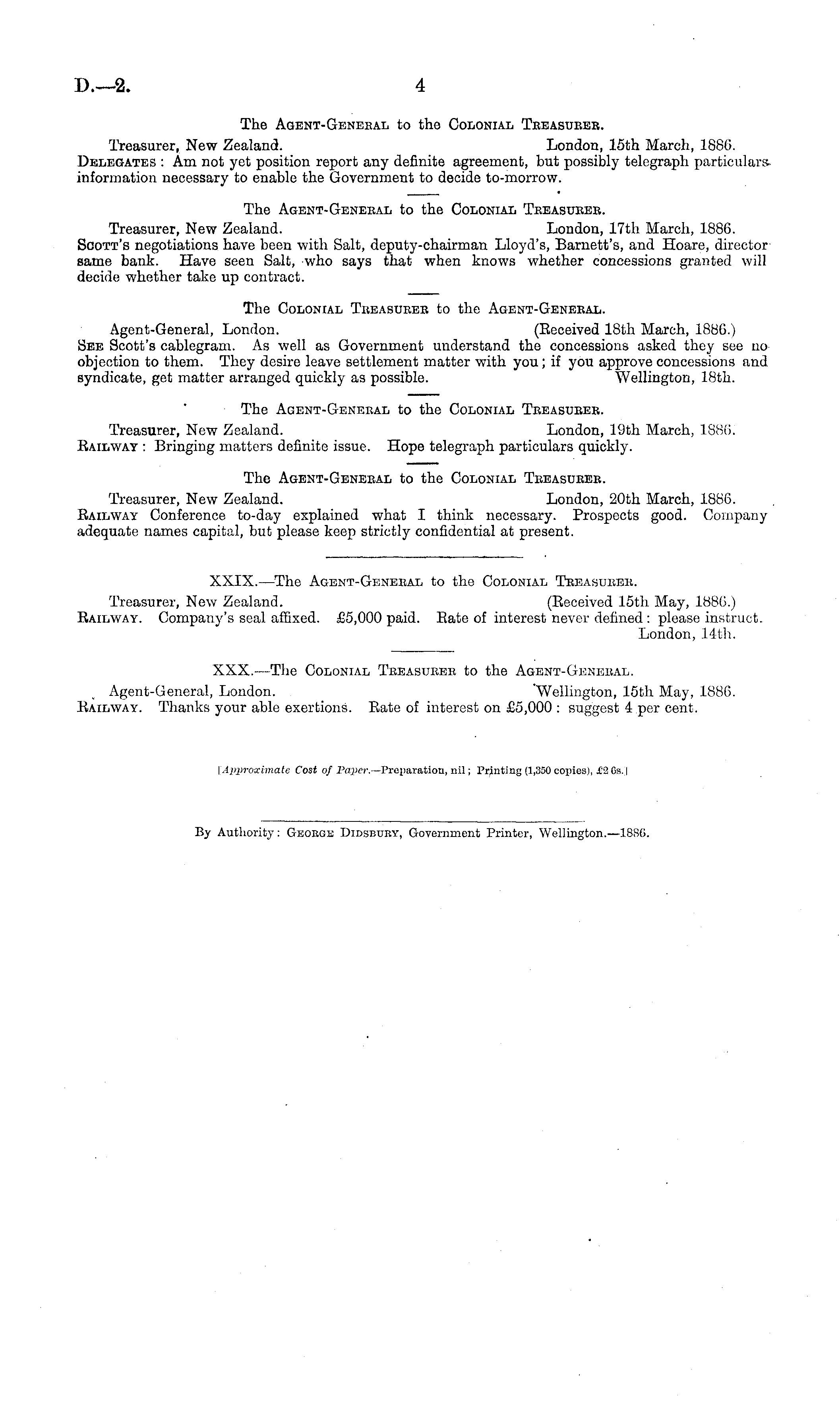 XXX.—The Colonial Tbeasurer to the Agent-General. Agent-General, London. Wellington, 15th May, 1886 Eailway. Thanks your able exertions. Eate of interest on £5,000 : suggest 4 per cent. I Approximate Cost of Paper. —Preparation, nil; Printing (1,350 copies), £2 6s.]
