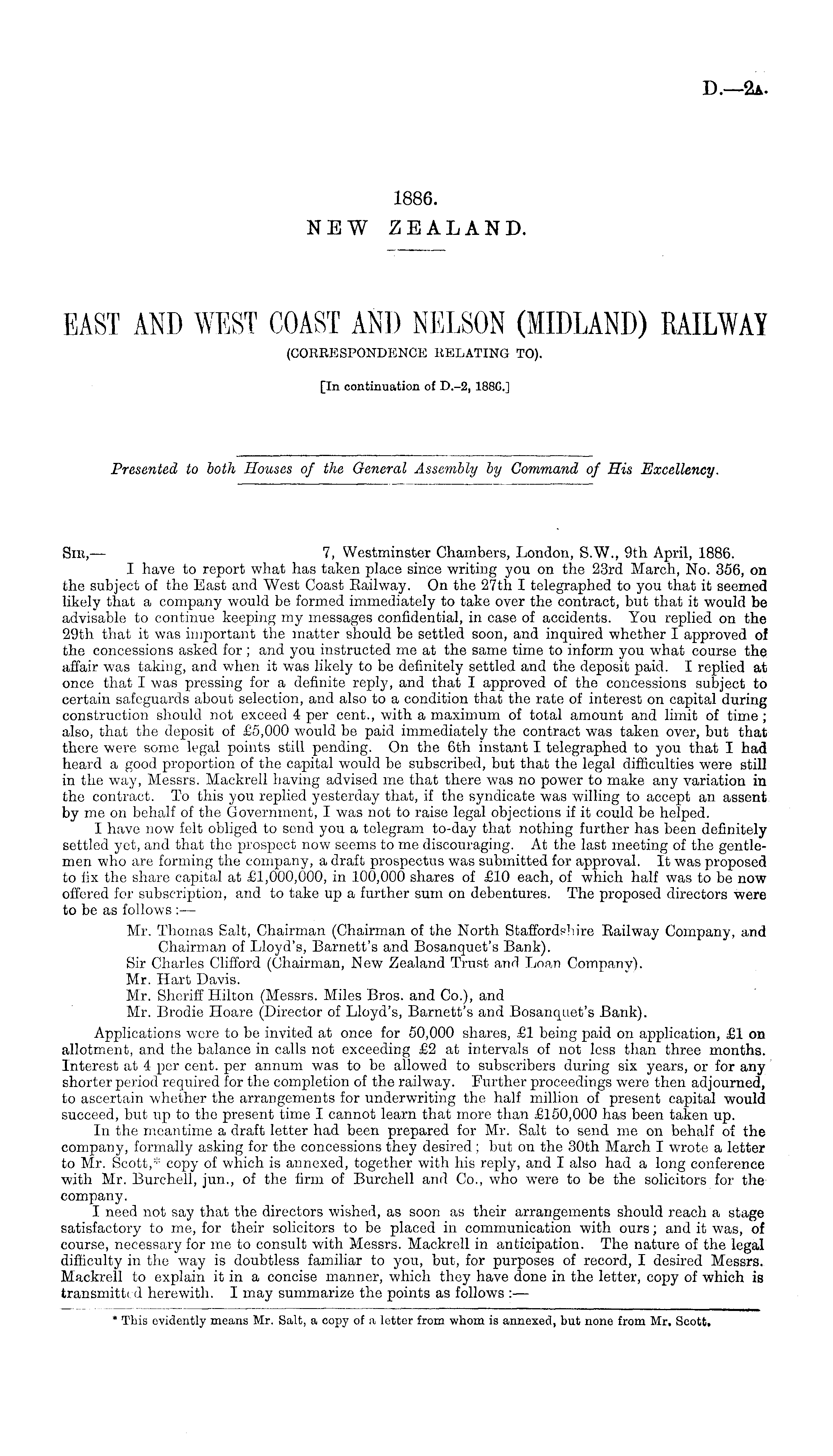 EAST AND WEST COAST AND NELSON (MIDLAND) RAILWAY (CORRESPONDENCE RELATING TO). [In continuation of D.-2, 1886.]