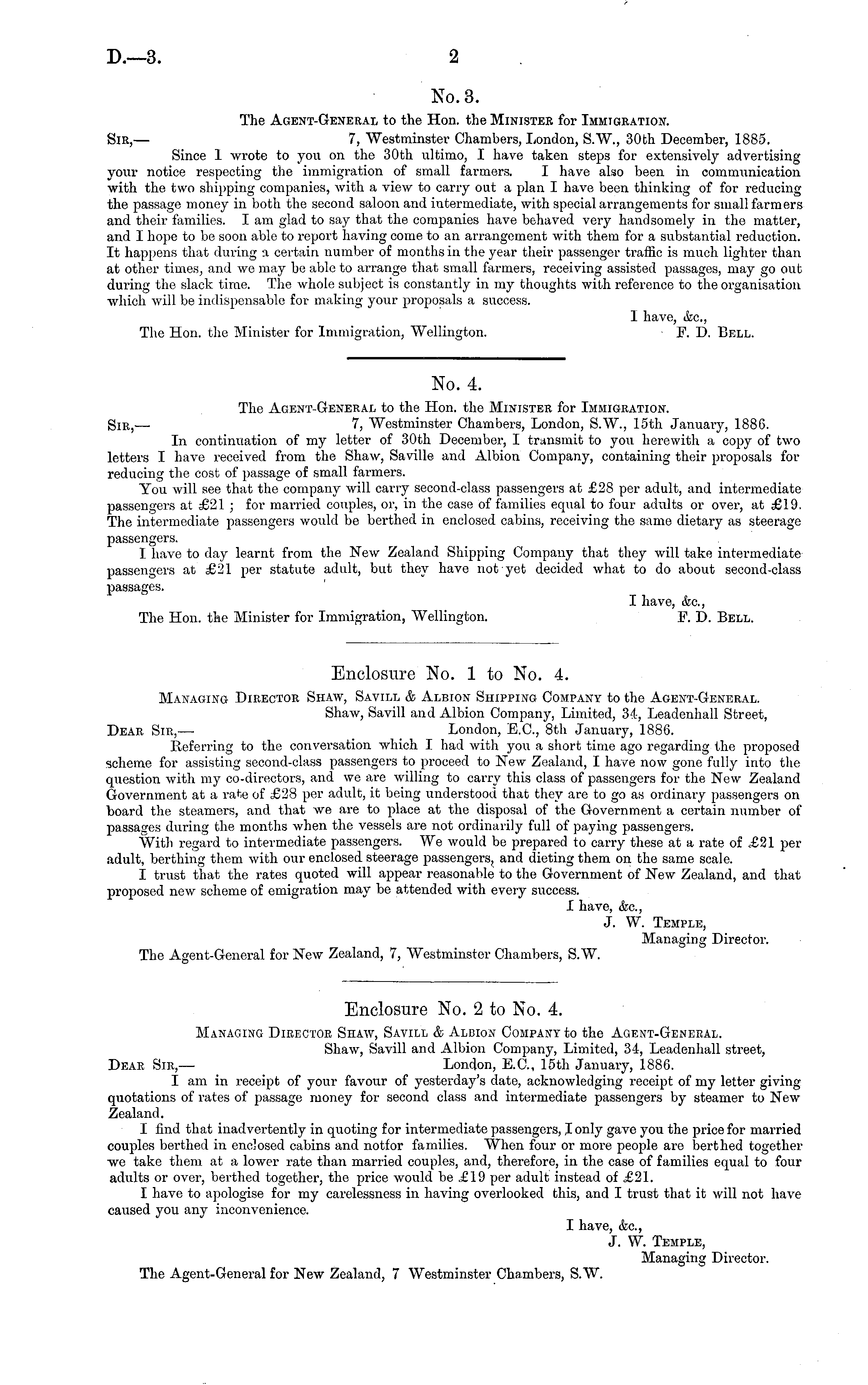 Enclosure No. 2 to No. 4. Managing Dieectoe Shaw, Savill & Albion Company to the Agext-Geneeal. Shaw, Savill and Albion Company, Limited, 34, Leadenhall street, Deae Sie, — London, E.C., 15th January, 1886. I am in receipt of your favour of yesterday's date, acknowledging receipt of my letter giving quotations of rates of passage money for second class and intermediate passengers by steamer to New Zealand. I find that inadvertently in quoting for intermediate passengers, I only gave you the price for married couples berthed in enclosed cabins and notfor families. When four or more people are berthed together we take them at a lower rate than married couples, and, therefore, in the case of families equal to four adults or over, berthed together, the price would be £19 per adult instead of .£2l. I have to apologise for my carelessness in having overlooked this, and I trust that it will not have caused you any inconvenience. I have, &c, J. W. Temple, Managing Director. The Agent-General for New Zealand, 7 Westminster Chambers, S.W.
