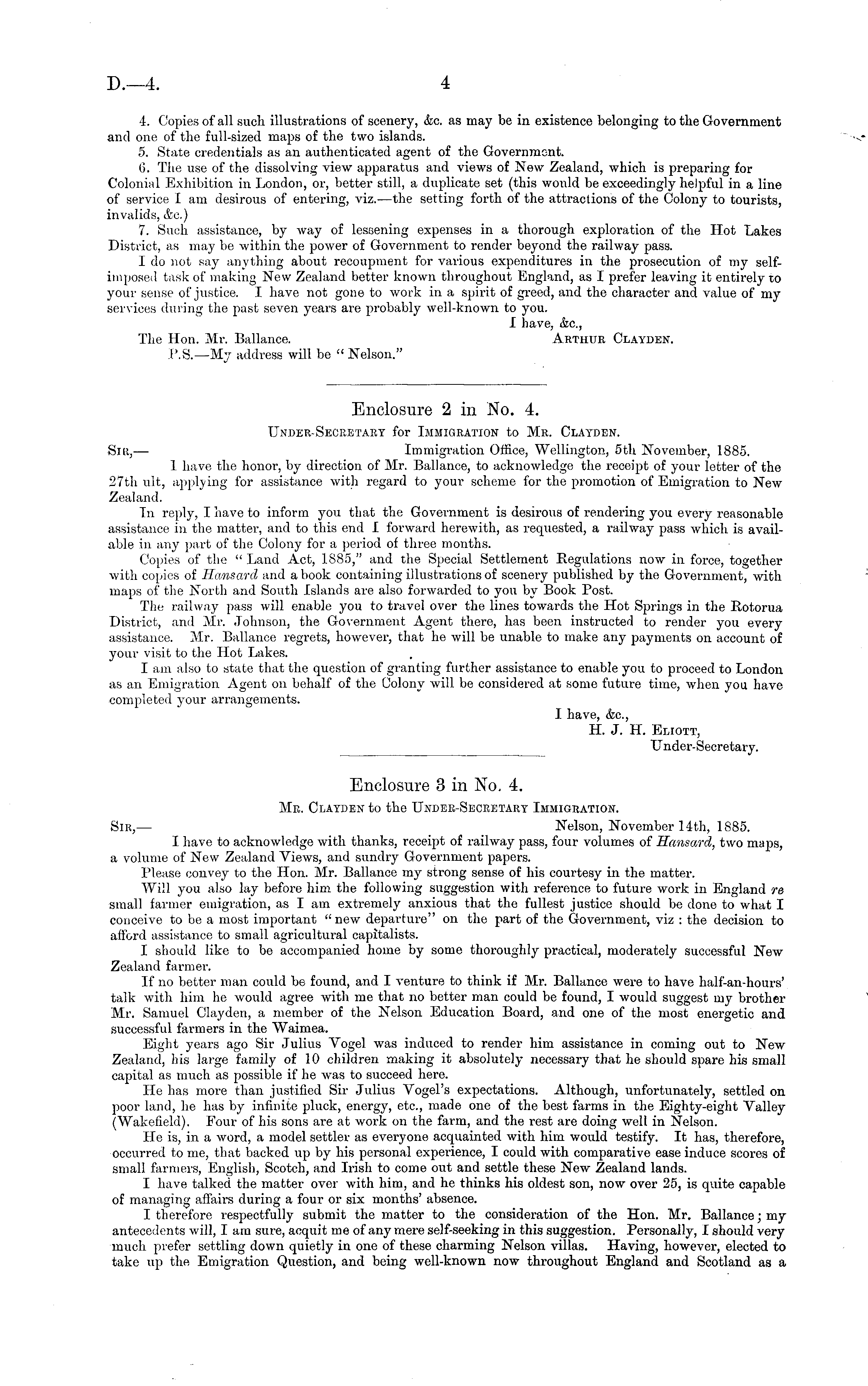 Enclosure 3 in No. 4. Me. Clayden to the Undee-Seobetary Immigration. Sir, — Nelson, November 14th, 1885. I have to acknowledge with thanks, receipt of railway pass, four volumes of Hansard, two maps, a volume of New Zealand Views, and sundry Government papers. Please convey to the Hon. Mr. Ballance my strong sense of his courtesy in the matter. Will you also lay before him the following suggestion with reference to future work in England re small farmer emigration, as I am extremely anxious that the fullest justice should be done to what I conceive to be a most important "new departure" on the part of the Government, viz : the decision to afford assistance to small agricultural capitalists. I should like to be accompanied home by some thoroughly practical, moderately successful New Zealand farmer. If no better man could be found, and I venture to think if Mr. Ballance were to have half-an-hours' talk with him he would agree with me that no better man could be found, I would suggest my brother Mr. Samuel Clayden, a member of the Nelson Education Board, and one of the most energetic and successful farmers in the Waimea. Eight years ago Sir Julius Vogel was induced to render him assistance in coming out to New Zealand, his large family of 10 children making it absolutely necessary that he should spare his small capital as much as possible if he was to succeed here. He has more than justified Sir Julius Vogel's expectations. Although, unfortunately, settled on poor land, he has by infinite pluck, energy, etc., made one of the best farms in the Eighty-eight Valley (Wakefield). Four of his sons are at work on the farm, and the rest are doing well in Nelson. He is, in a word, a model settler as everyone acquainted with him would testify. It has, therefore, occurred to me, that backed up by his personal experience, I could with comparative ease induce scores of small farmers, English, Scotch, and Irish to come out and settle these New Zealand lands. I have talked the matter over with him, and he thinks his oldest son, now over 25, is quite capable of managing affairs during a four or six months' absence. I therefore respectfully submit the matter to the consideration of the Hon. Mr. Ballance; my antecedents will, I am sure, acquit me of any mere self-seeking in this suggestion. Personally, I should very much prefer settling down quietly in one of these charming Nelson villas. Having, however, elected to take up the Emigration Question, and being well-known now throughout England and Scotland as a