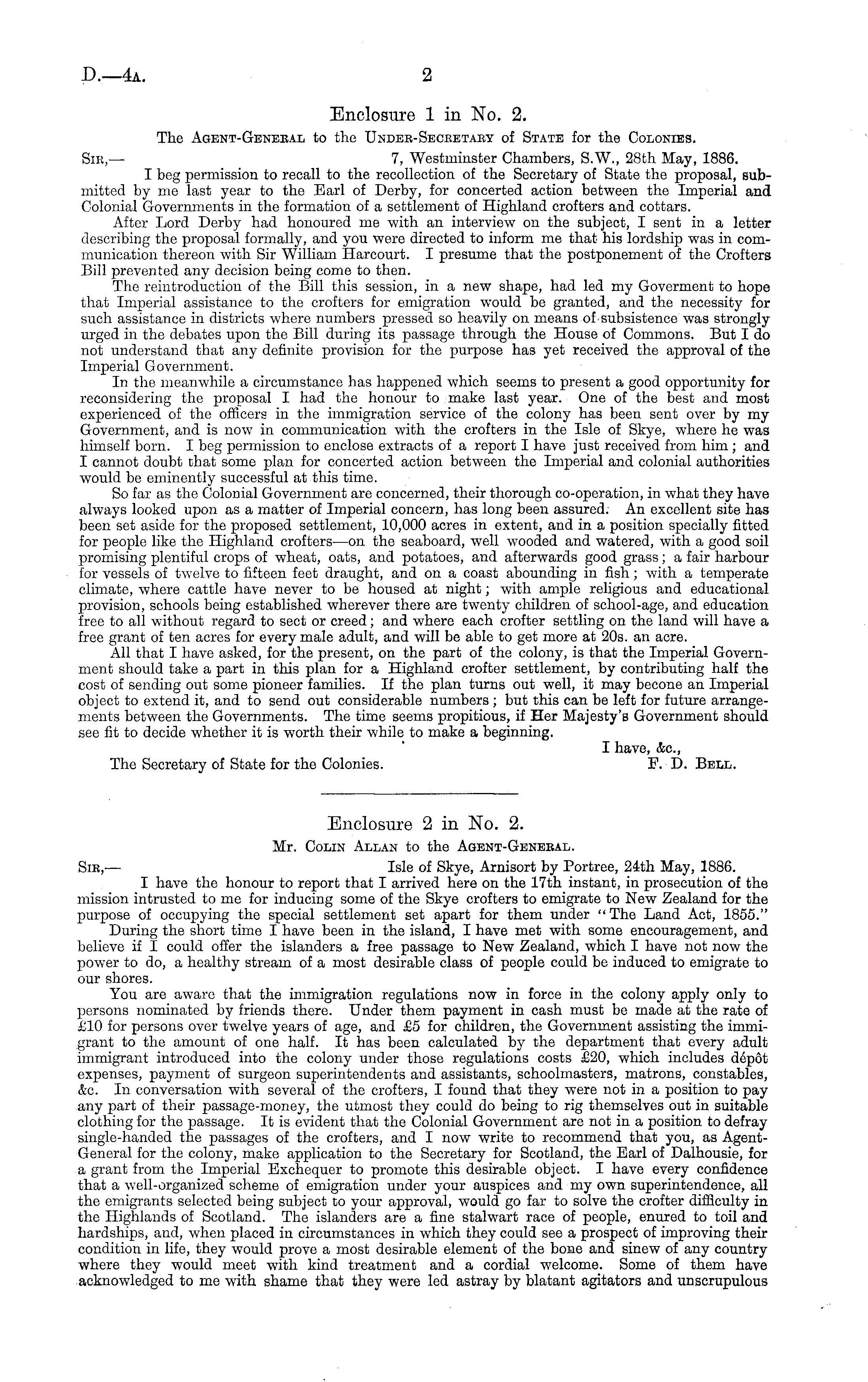 Enclosure 1 in No. 2. The Agent-Genebal to the Undee-Secbetaey of State for the Colonies. Sib,— 7, Westminster Chambers, S.W., 28th May, 1886. I beg permission to recall to the recollection of the Secretary of State the proposal, submitted by me last year to the Earl of Derby, for concerted action between the Imperial and Colonial Governments in the formation of a settlement of Highland crofters and cottars. After Lord Derby had honoured me with an interview on the subject, I sent in a letter describing the proposal formally, and you were directed to inform me that his lordship was in communication thereon with Sir William Harcourt. I presume that the postponement of the Crofters Bill prevented any decision being come to then. The reintroduction of the Bill this session, in a new shape, had led my Goverment to hope that Imperial assistance to the crofters for emigration would be granted, and the necessity for such assistance in districts where numbers pressed so heavily on means of subsistence was strongly urged in the debates upon the Bill during its passage through the House of Commons. But Ido not understand that any definite provision for the purpose has yet received the approval of the Imperial Government. In the meanwhile a circumstance has happened which seems to present a good opportunity for reconsidering the proposal I had the honour to make last year. One of the best and most experienced of the officers in the immigration service of the colony has been sent over by my Government, and is now in communication with the crofters in the Isle of Skye, where he was himself born. I beg permission to enclose extracts of a report I have just received from him ; and I cannot doubt chat some plan for concerted action between the Imperial and colonial authorities would be eminently successful at this time. So far as the Colonial Government are concerned, their thorough co-operation, in what they have always looked upon as a matter of Imperial concern, has long been assured. An excellent site has been set aside for the proposed settlement, 10,000 acres in extent, and in a position specially fitted for people like the Highland crofters—on the seaboard, well wooded and watered, with a good soil promising plentiful crops of wheat, oats, and potatoes, and afterwards good grass; a fair harbour for vessels of twelve to fifteen feet draught, and on a coast abounding in fish; with a temperate climate, where cattle have never to be housed at night; with ample religious and educational provision, schools being established wherever there are twenty children of school-age, and education free to all without regard to sect or creed; and where each crofter settling on the land will have a free grant of ten acres for every male adult, and will be able to get more at 20s. an acre. All that I have asked, for the present, on the part of the colony, is that the Imperial Government should take a part in this plan for a Highland crofter settlement, by contributing half the cost of sending out some pioneer families. If the plan turns out well, it may becone an Imperial object to extend it, and to send out considerable numbers ; but this can be left for future arrangements between the Governments. The time seems propitious, if Her Majesty's Government should see fit to decide whether it is worth their while to make a beginning. I have, &c, The Secretary of State for the Colonies. P. D. Bell.