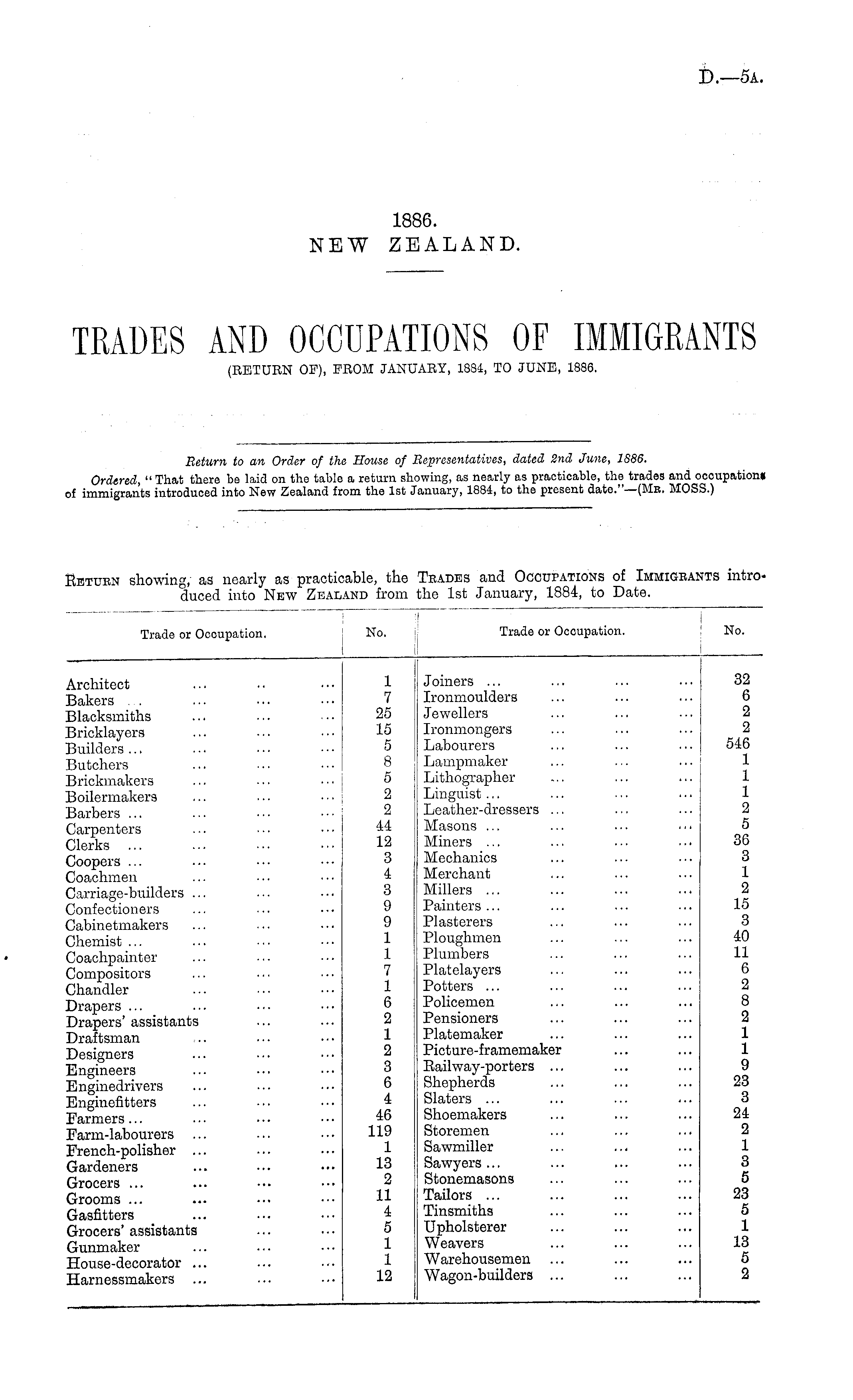 Return to an Order of the House of Representatives, dated 2nd June, ISB6. Ordered, " That there be laid on the table a return showing, as nearly as practicable, the trades and occupation* of immigrants introduced into New Zealand from the Ist January, 1884, to the present date."—(Me. MOSS.)