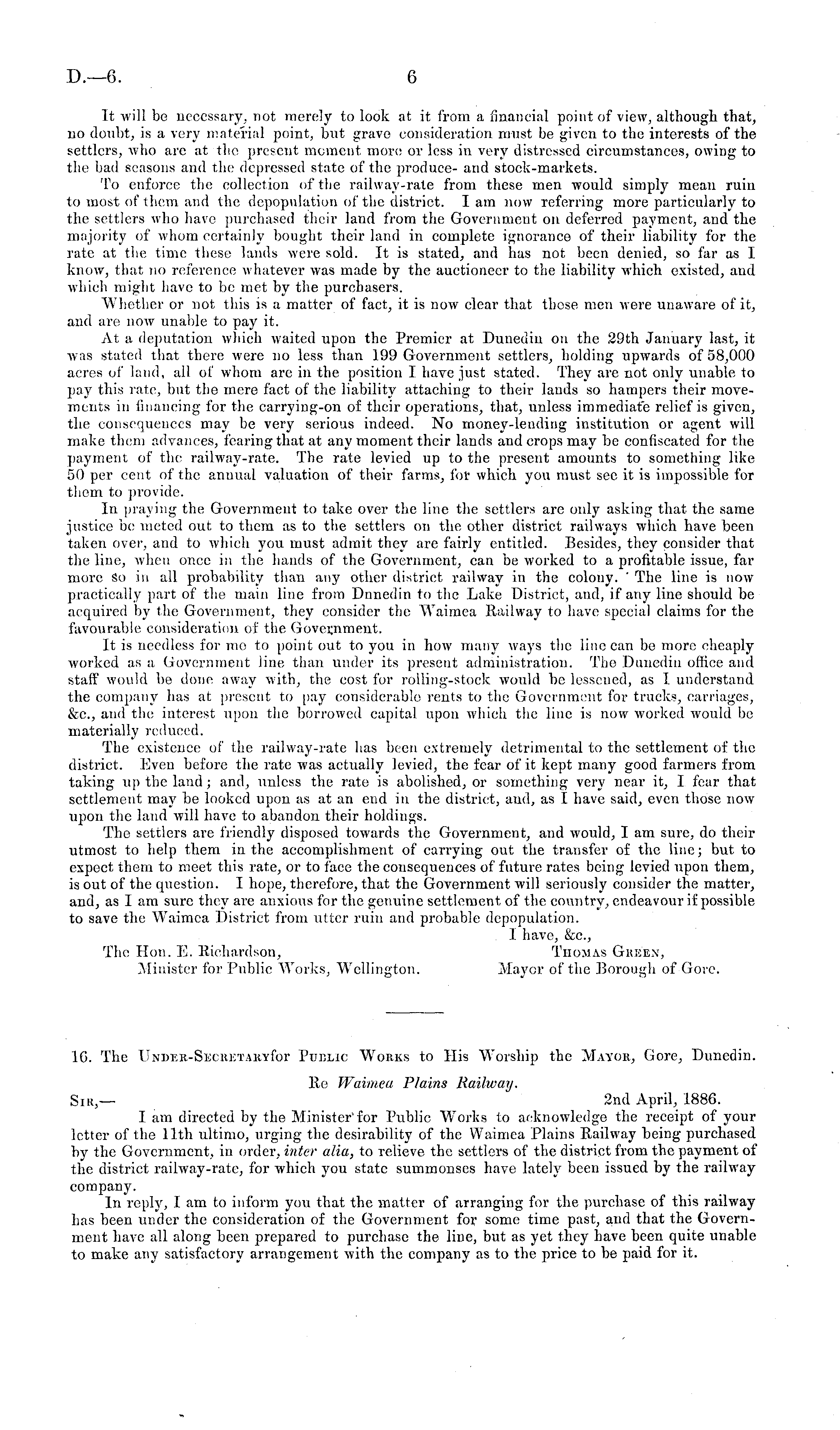 16. The UNDER-SECRETARyfor Public Works to His Worship the Mayor, Gore, Dunedin. Re Waimea Plains Railway. Sir,— 2nd April, 1886. I am directed by the Minister for Public Works to acknowledge the receipt of your letter of the 11th ultimo, urging the desirability of the Waimea Plains Railway being purchased by the Government, in order, inter alia, to relieve the settlers of the district from the payment of the district railway-rate, for which you state summonses have lately been issued by the railway company. In reply, I am to inform you that the matter of arranging for the purchase of this railway has been under the consideration of the Government for some time past, and that the Government have all along been prepared to purchase the line, but as yet they have been quite unable to make any satisfactory arrangement with the company as to the price to be paid for it.