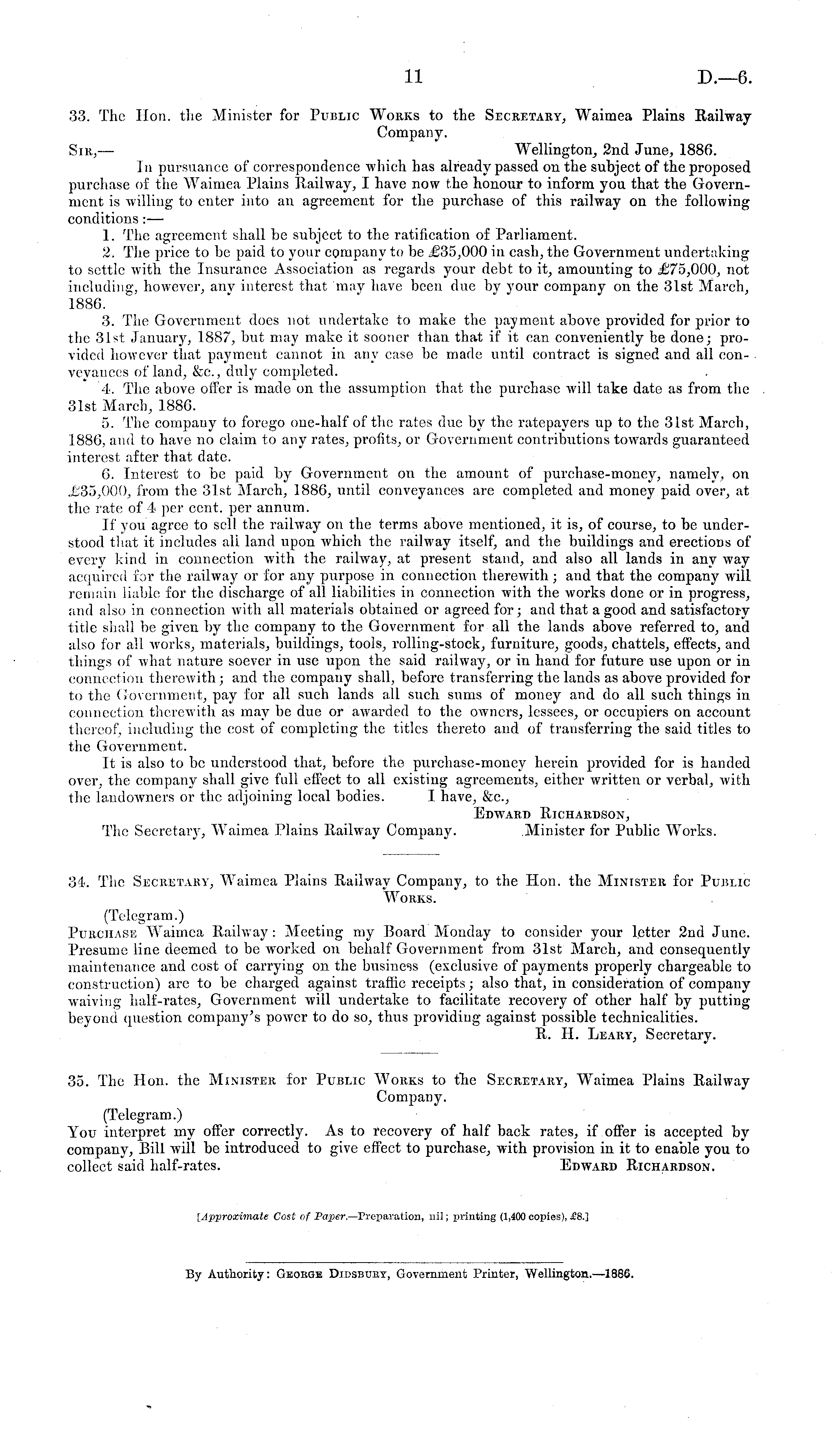 33. The Hon. the Minister for Public Works to the Secretary, Waimea Plains Railway Company. Sir,— Wellington, 2nd June, 1886. In pursuance of correspondence which has already passed on the subject of the proposed purchase of the Waimea Plains Railway, I have now the honour to inform you that the Government is willing to enter into an agreement for the purchase of this railway on the following conditions : — 1. The agreement shall be subject to the ratification of Parliament. 2. The price to be paid to your company to be £35,000 in cash, the Government undertaking to settle with the Insurance Association as regards your debt to it, amounting to £75,000, not including, however, any interest that may have been due by your company on the 31st March, 1886. 3. The Government does not undertake to make the payment above provided for prior to the 31st January, 1887, but may make it sooner than that if it can conveniently be done; provided however that payment cannot in any case be made until contract is signed and all conveyances of land, Sec, duly completed. 4. The above offer is made on the assumption that the purchase will take date as from the 31st March, 1886. 5. The company to forego one-half of the rates due by the ratepayers up to the 31st March, 1886, and to have no claim to any rates, profits, or Government contributions towards guaranteed interest after that date. 6. Interest to be paid by Government on the amount of purchase-money, namely, on £35,000, from the 31st March, 1886, until conveyances are completed and money paid over, at the rate of 4 per cent, per annum. If you agree to sell the railway on the terms above mentioned, it is, of course, to be understood that it includes all land upon which the railway itself, and the buildings and erections of every kind in connection with the railway, at present stand, and also all lands in any way acquired for the railway or for any purpose in connection therewith ; and that the company will remain liable for the discharge of all liabilities in connection with the works done or in progress, and also in connection with all materials obtained or agreed for; and that a good and satisfactory title shall be given by the company to the Government for all the lands above referred to, and also for all works, materials, buildings, tools, rolling-stock, furniture, goods, chattels, effects, and things of what nature soever in use upon the said railway, or in hand for future use upon or in connection therewith ; and the company shall, before transferring the lands as above provided for to the Government, pay for all such lands all such sums of money and do all such things in connection therewith as may be due or awarded to the owners, lessees, or occupiers on account thereof, including the cost of completing the titles thereto and of transferring the said titles to the Government. It is also to be understood that, before the purchase-money herein provided for is handed over, the company shall give full effect to all existing agreements, either written or verbal, with the landowners or the adjoining local bodies. I have, Sec, Edward Richardson, The Secretary, Waimea Plains Railway Company. Minister for Public Works.