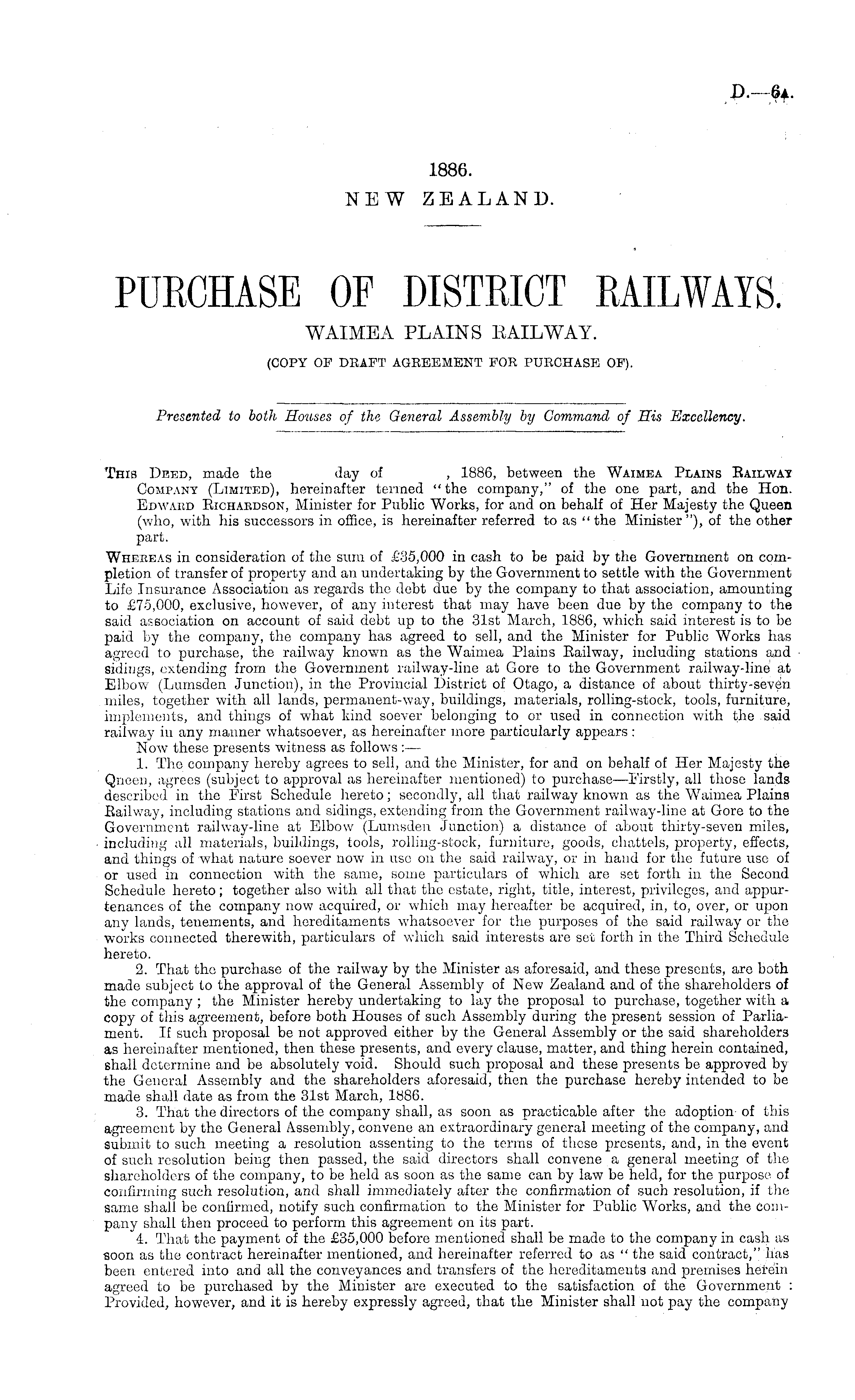 PURCHASE OF DISTRICT RAILWAYS. WAIMEA PLAINS RAILWAY. (COPY OF DRAFT AGREEMENT FOR PURCHASE OF).