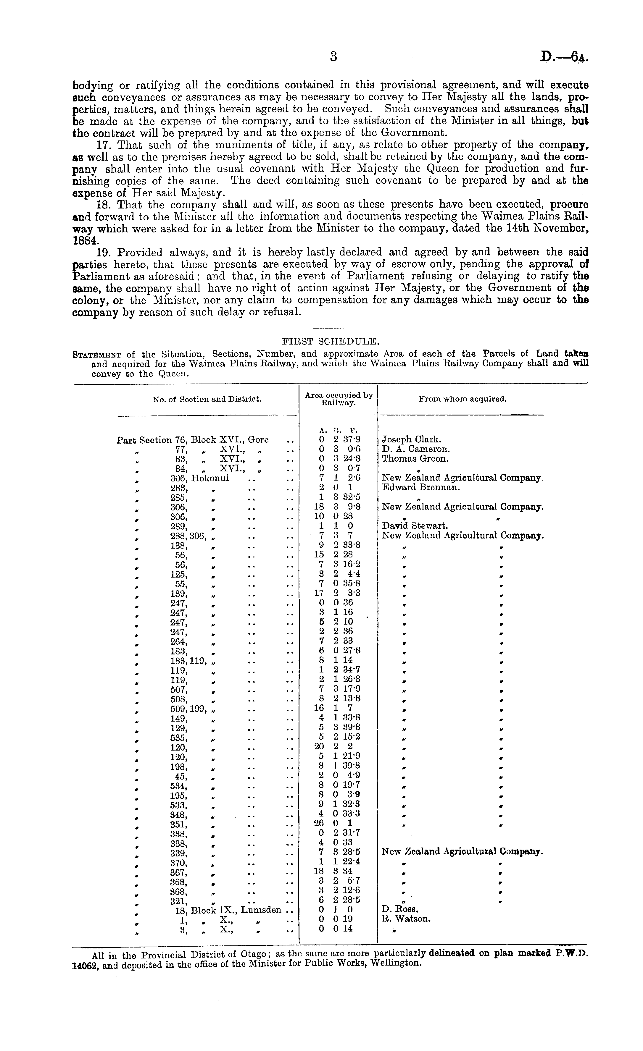 bodying or ratifying all the conditions contained in this provisional agreement, and will execute such conveyances or assurances as may be necessary to convey to Her Majesty all the lands, properties, matters, and things herein agreed to be conveyed. Such conveyances and assurances shall be made at the expense of the company, and to the satisfaction of the Minister in all things, but the contract will be prepared by and at the expense of the Government. 17. That such of the muniments of title, if any, as relate to other property of the company, as well as to the premises hereby agreed to be sold, shall be retained by the company, and the company shall enter into the usual covenant with Her Majesty the Queen for production and furnishing copies of the same. The deed containing such covenant to be prepared by and at the expense of Her said Majesty. 18. That the company shall and will, as soon as these presents have been executed, procure and forward to the Minister all the information and documents respecting the Waimea Plains Kailway which were asked for in a letter from the Minister to the company, dated the 14th November, 1884. 19. Provided always, and it is hereby lastly declared and agreed by and between the said parties hereto, that these presents are executed by way of escrow only, pending the approval of Parliament as aforesaid ; and that, in the event of Parliament refusing or delaying to ratify the same, the company shall have no right of action against Her Majesty, or the Government of the colony, or the Minister, nor any claim to compensation for any damages which may occur to the company by reason of such delay or refusal.