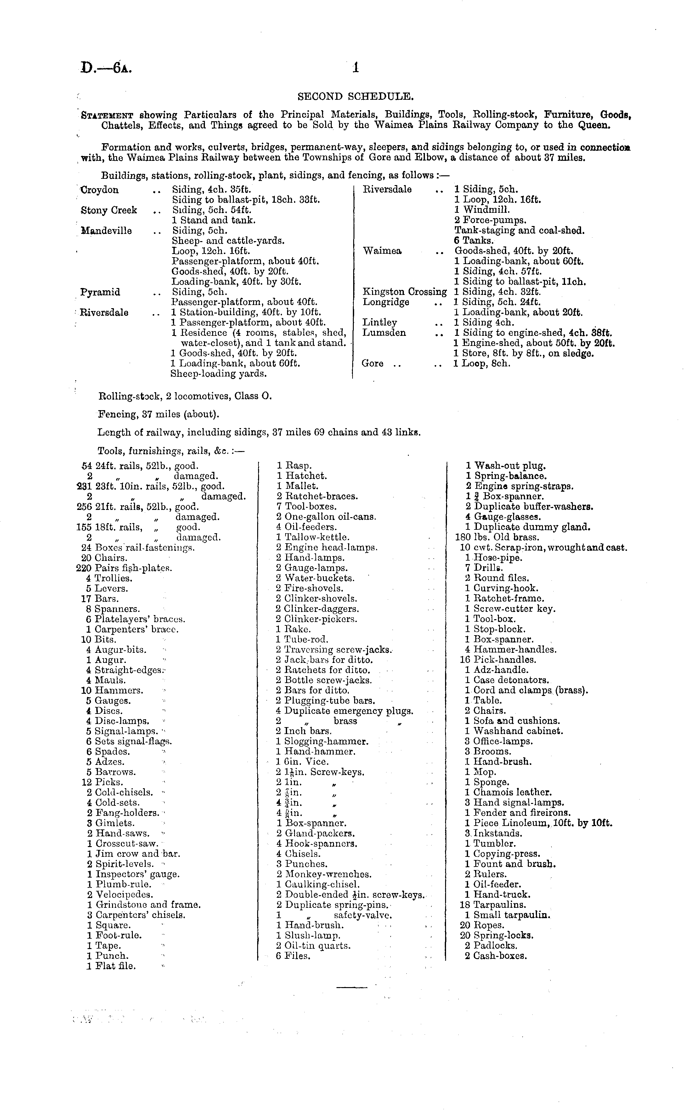 SECOND SCHEDULE. Statement showing Particulars of the Principal Materials, Buildings, Tools, Rolling-stock, Furniture, Goods, Chattels, Effects, and Things agreed to be Sold by the Waimea Plains Railway Company to the Queen. Formation and works, culverts, bridges, permanent-way, sleepers, and sidings belonging to, or used in connection with, the Waimea Plains Railway between the Townships of Gore and Elbow, a distance of about 37 miles. Buildings, stations, rolling-stock, plant, sidings, and fencing, as follows : — Croydon .. Siding, 4oh. 35ft. Riversdale .. 1 Siding, seh. Siding to ballast-pit, 18ch. 33ft. 1 Loop, 12ch. 16ft. Stony Creek .. Siding, sch. 54ft. 1 Windmill. 1 Stand and tank. 2 Force-pumps. Mandevilla .. Siding, seh. Tank-staging and coal-shed. Sheep- and cattle-yards. 6 Tanks. Loop, 12ch. 16ft. Waimea .. Goods-shed, 40ft. by 20ft. Passenger-platform, about 40ft. 1 Loading-bunk, about 60ft. Goods-shed, 40ft. by 20ft. 1 Siding, 4ch. 57ft. Loading-bank, 40ft. by 30ft. 1 Siding to ballast-pit, llch. Pyramid .. Siding, sch. Kingston Crossing 1 Siding, 4ch. 32ft. Passenger-platform, about 40ft. Longridge .. 1 Siding, sch. 24ft. Riversdala .. 1 Station-building, 40ft. by 10ft. 1 Loading-bank, about 20ft. 1 Passenger-platform, about 40ft. Lintley .. 1 Siding 4ch. 1 Residence (4 rooms, stables, shed, Lumsden .. 1 Siding to engine-shed, 4ch. 38ft. water-closet), and 1 tank and stand. 1 Engine-shed, about 50ft. by 20ft. 1 Goods-shed, 40ft. by 20ft. 1 Store, Bft. by Bft., on sledge. 1 Loading-bank, about 60ft. Gore .. .. 1 Loop, Bch. Sheep-loading yards. Rolling-stock, 2 locomotives, Class O. Fencing, 37 miles (about). Length of railway, including sidings, 37 miles 69 chains and 43 links. Tools, furnishings, rails, &o.: — 54 24ft. rails, 521b., good. 1 Rasp. 1 Wash-out plug. 2 „ » damaged. 1 Hatchet. 1 Spring-balance. 231 23ft. 10in. rails, 521b., good. 1 Mallet. 2 Engine spring-straps. 2 „ „ damaged. 2 Ratchet-braces. 1 % Box-spanner. 256 21ft. rails, 521b., good. 7 Tool-boxes. 2 Duplicate buffer-washers. 2 „ „ damaged. 2 One-gallon oil-cans. 4 Gauge-glasses. 155 18ft. rails, „ good. 4 Oil-feeders. 1 Duplicate dummy gland. 2 „ „ damaged. 1 Tallow-kettle. 180 lbs. Old brass. 24 Boxes rail-fastenings. 2 Engine head-lamps. 10 cwt. Scrap-iron, wrought and cast. 20 Chairs. 2 Hand-lamps. 1 Hose-pipe. 220 Pairs fish-plates. 2 Gauge-lamps. 7 Drills. 4 Trollies. 2 Water-buckets. 2 Round files. 5 Levers. 2 Fire-shovels. 1 Curving-hook. 17 Bars. 2 Clinker-shovels. 1 Ratchot-framo. 8 Spanners. 2 Clinker-daggers. 1 Screw-cutter key. 6 Platelayers' braces. 2 Clinker-pickers. 1 Tool-box. 1 Carpenters' brace. 1 Rake. 1 Stop-block. 10 Bits. 1 Tube-rod. 1 Box-spanner. 4 Augur-bits. » 2 Traversing screw-jacks. 4 Hammer-handles. 1 Augur. » 2 Jack-bars for ditto. 16 Pick-handles. 4 Straight-edges:' 2 Ratchets for ditto. 1 Adz-handle. 4 Mauls. 2 Bottle screw-jacks. 1 Case detonators. 10 Hammers. ■ 2 Bars for ditto. 1 Cord and clamps (brass). 5 Gauges. ' 2 Plugging-tube bars. 1 Table. 1 Discs. * 4 Duplicate emergency plugs. 2 Chairs. 4 Disc-lamps. ■ 2 „ brass , 1 Sofa and cushions. 5 Signal-lamps. ' 2 Inch bars. 1 Washhand cabinet. 6 Sots signal-flags. 1 Slogging-hammer. 3 Oflice-lamps. 6 Spades. 1 Hand-hammer. 3 Brooms. 5 Adzes. > 1 Gin. Vice. 1 Hand-brush. 5 Barrows. 2 ljiri. Screw-keys. 1 Mop. 12 Picks. - 2 lin. „ ■ • 1 Sponge. 2 Cold-chisels. « 2 -Jin. „ 1 Chamois leather. 1 Cold-sets. < i fit. , 3 Hand signal-lamps. 2 Fang-holders. ■ 4 gin. „ 1 Fender and fireirons. 3 Gimlets. 1 Box-spanner. 1 Piece Linoleum, 10ft. by 10ft. 2 Hand-saws. • 2 Gland-packers. ■ 3 Inkstands. 1 Crosscut-saw. 4 Hook-spanners. 1 Tumbler. 1 Jim crow and bar. 4 Chisels. 1 Copying-press. 2 Spirit-levels. • 3 Punches. 1 Fount and brush, 1 Inspectors' gauge. 2 Monkey-wrenches. 2 Rulers. 1 Plumb-rule. 1 Caulking-chiscl. 1 Oil-feeder. 2 Velocipedes. 2 Double-ended Jin. screw-keys. 1 Hand-truck. 1 Grindstone and frame. 2 Duplicate spring-pins. 18 Tarpaulins. 3 Carpenters' chisels. 1 „ safety-valve. 1 Small tarpaulin. 1 Square. ' 1 Hand-brush. i • ■ > 20 Ropes. 1 Foot-rule. ' 1 Slush-lamp. • 20 Spring-lockg. 1 Tape. • 2 Oil-tin quarts. 2 Padlocks. 1 Punch. - 6 Files. . . 2 Cash-boxes. 1 Flat file.