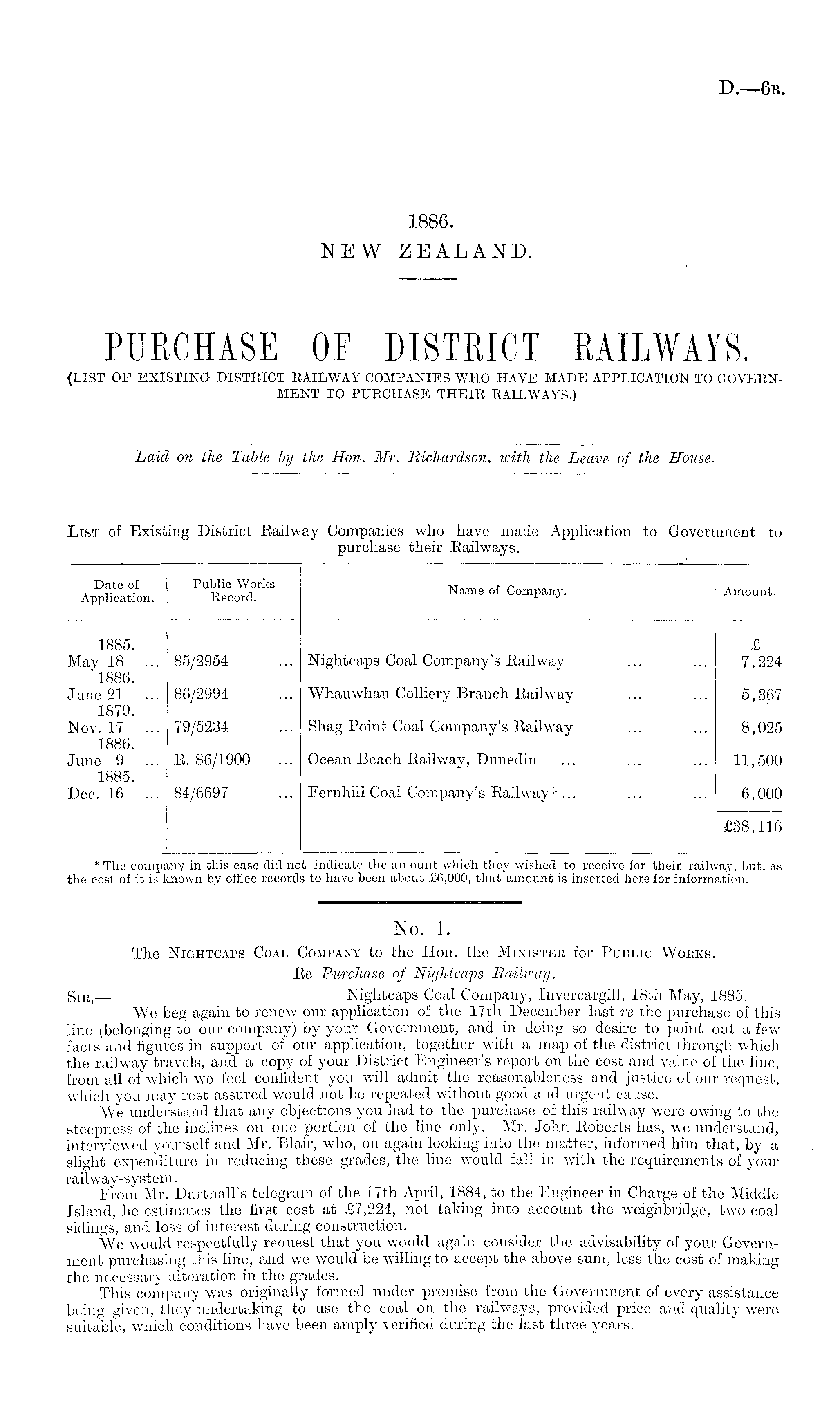 No. 1. The Nightcaps Coal Company to the Hon. the Minister for Public Wokks. Ee Purchase of Nightcaps Railway. Sib, — Nightcaps Coal Company, Invercargill, 18th May, 1885. We beg again to renew our application of the 17th December last re the purchase of this line (belonging to our company) by your Government, and in doing so desire to point out a fewfacts and figures in support of our application, together with a map of the district through which the railway travels, and a copy of your District Engineer's report on the cost and value of the line, from all of which we feel confident you will admit the reasonableness and justice of our request, which you may rest assured would not be repeated without good and urgent cause. We understand that any objections you had to the purchase of this railway were owing to the steepness of the inclines on one portion of the line only. Mr. John Eoberts lias, we understand, interviewed yourself and Mr. Blair, who, on again looking into the matter, informed him that, by a slight expenditure in reducing these grades, the line would fall in with the requirements of your railway-system. From Mr. Dartnall's telegram of the 17th April, 1884, to the Engineer in Charge of the Middle Island, he estimates the first cost at £7,224, not taking into account the weighbridge, two coal sidings, and loss of interest during construction. We would respectfully request that you would again consider the advisability of your Government purchasing this line, and we would be willing to accept the above sum, less the cost of making the necessary alteration in the grades. This company was originally formed under promise from the Government of every assistance being given, they undertaking to use the coal on the railways, provided price and quality were suitable, which conditions have been amply verified during the last three years.