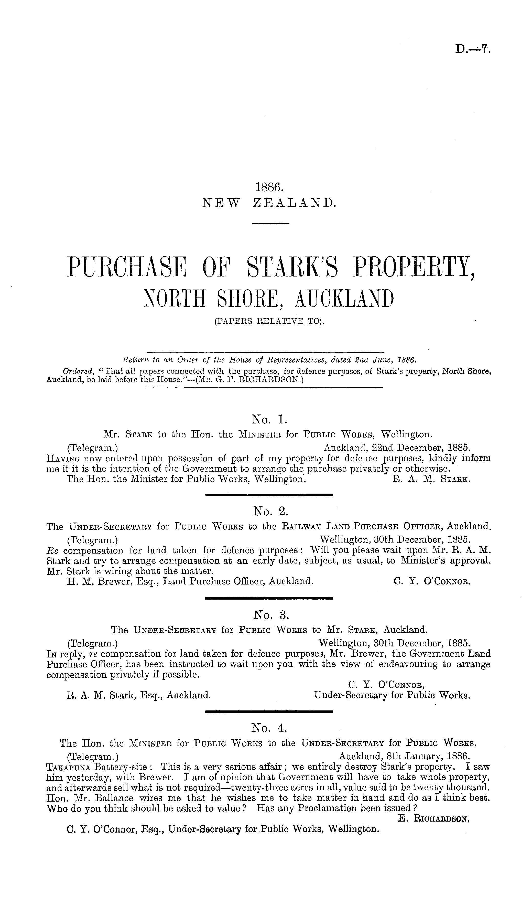 No. 1. Mr. Stark to the Hon. the Minister for Public Works, Wellington. (Telegram.) Auckland, 22nd December, 1885. Having now entered upon possession of part of my property for defence purposes, kindly inform me if it is the intention of the Government to arrange the purchase privately or otherwise. The Hon. the Minister for Public Works, Wellington. R. A. M. Stark.