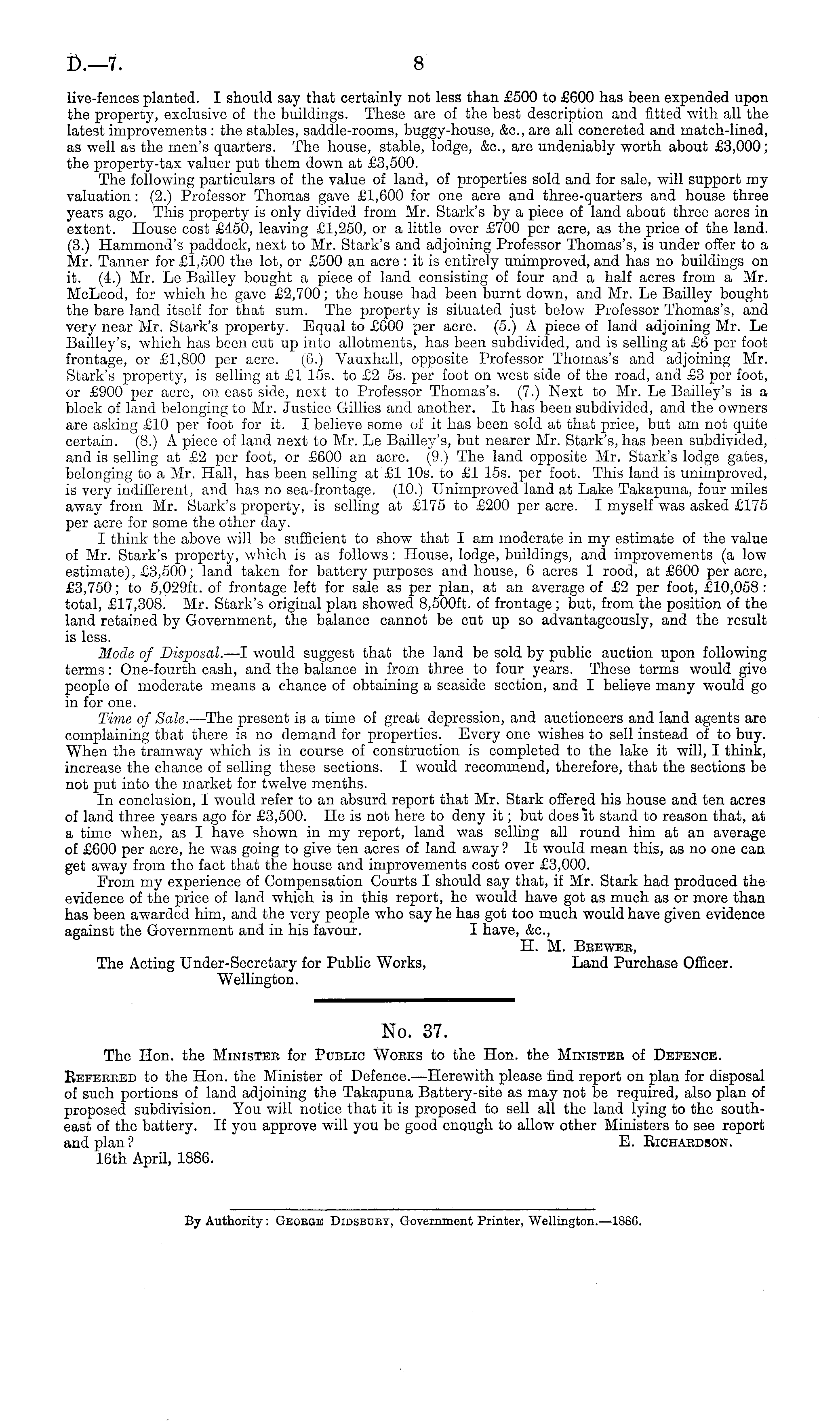 live-fences planted. I should say that certainly not less than £500 to £600 has been expended upon the property, exclusive of the buildings. These are of the best description and fitted with all the latest improvements : the stables, saddle-rooms, buggy-house, &c, are all concreted and match-lined, as well as the men's quarters. The house, stable, lodge, &c, are undeniably worth about £3,000; the property-tax valuer put them down at £3,500. The following particulars of the value of land, of properties sold and for sale, will support my valuation: (2.) Professor Thomas gave £1,600 for one acre and three-quarters and house three years ago. This property is only divided from Mr. Stark's by a piece of land about three acres in extent. House cost £450, leaving £1,250, or a little over £700 per acre, as the price of the land. (3.) Hammond's paddock, next to Mr. Stark's and adjoining Professor Thomas's, is under offer to a Mr. Tanner for £1,500 the lot, or £500 an acre : it is entirely unimproved, and has no buildings on it. (4.) Mr. Le Bailley bought a piece of land consisting of four and a half acres from a Mr. McLeod, for which he gave £2,700; the house had been burnt down, and Mr. Le Bailley bought the bare land itself for that sum. The property is situated just below Professor Thomas's, and very near Mr. Stark's property. Equal to £600 per acre. (5.) A piece of land adjoining Mr. Le Bailley's, which has been cut up into allotments, has been subdivided, and is selling at £6 por foot frontage, or £1,800 per acre. (6.) Vauxhall, opposite Professor Thomas's and adjoining Mr. Stark's property, is selling at £1 15s. to £2 ss. per foot on west side of the road, and £3 per foot, or £900 per acre, on east side, next to Professor Thomas's. (7.) Next to Mr. Le Bailley's is a block of land belonging to Mr. Justice Gillies and another. It has been subdivided, and the owners are asking £10 per foot for it. I believe some of it has been sold at that price, but am not quite certain. (8.) A piece of land next to Mr. Le Bailley's, but nearer Mr. Stark's, has been subdivided, and is selling at £2 per foot, or £600 an acre. (9.) The land opposite Mr. Stark's lodge gates, belonging to a Mr. Hall, has been selling at £1 10s. to £1 15s. per foot. This land is unimproved, is very indifferent, and has no sea-frontage. (10.) Unimproved land at Lake Takapuna, four miles away from Mr. Stark's property, is selling at £175 to £200 per acre. I myself was asked £175 per acre for some the other day. I think the above will be sufficient to show that I am moderate in my estimate of the value of Mr. Stark's property, which is as follows: House, lodge, buildings, and improvements (a low estimate), £3,500; land taken for battery purposes and house, 6 acres 1 rood, at £600 per acre, £3,750; to 5,029 ft. of frontage left for sale as per plan, at an average of £2 per foot, £10,058 : total, £17,308. Mr. Stark's original plan showed 8,500 ft. of frontage ; but, from the position of the land retained by Government, the balance cannot be cut up so advantageously, and the result is less. Mode of Disposal. —l would suggest that the land be sold by public auction upon following terms: One-fourth cash, and the balance in from three to four years. These terms would give people of moderate means a chance of obtaining a seaside section, and I believe many would go in for one. Time of Sale. —The present is a time of great depression, and auctioneers and land agents are complaining that there is no demand for properties. Every one wishes to sell instead of to buy. When the tramway which is in course of construction is completed to the lake it will, I think, increase the chance of selling these sections. I would recommend, therefore, that the sections be not put into the market for twelve menths. In conclusion, I would refer to an absurd report that Mr. Stark offered his house and ten acres of land three years ago for £3,500. He is not here to deny it; but does it stand to reason that, at a time when, as I have shown in my report, land was selling all round him at an average of £600 per acre, he was going to give ten acres of land away ? It would mean this, as no one can get away from the fact that the house and improvements cost over £3,000. From my experience of Compensation Courts I should say that, if Mr. Stark had produced the evidence of the price of land which is in this report, he would have got as much as or more than has been awarded him, and the very people who say he has got too much would have given evidence against the Government and in his favour. I have, &c, H. M. Brewer, The Acting Under-Secretary for Public Works, Land Purchase Officer. Wellington.