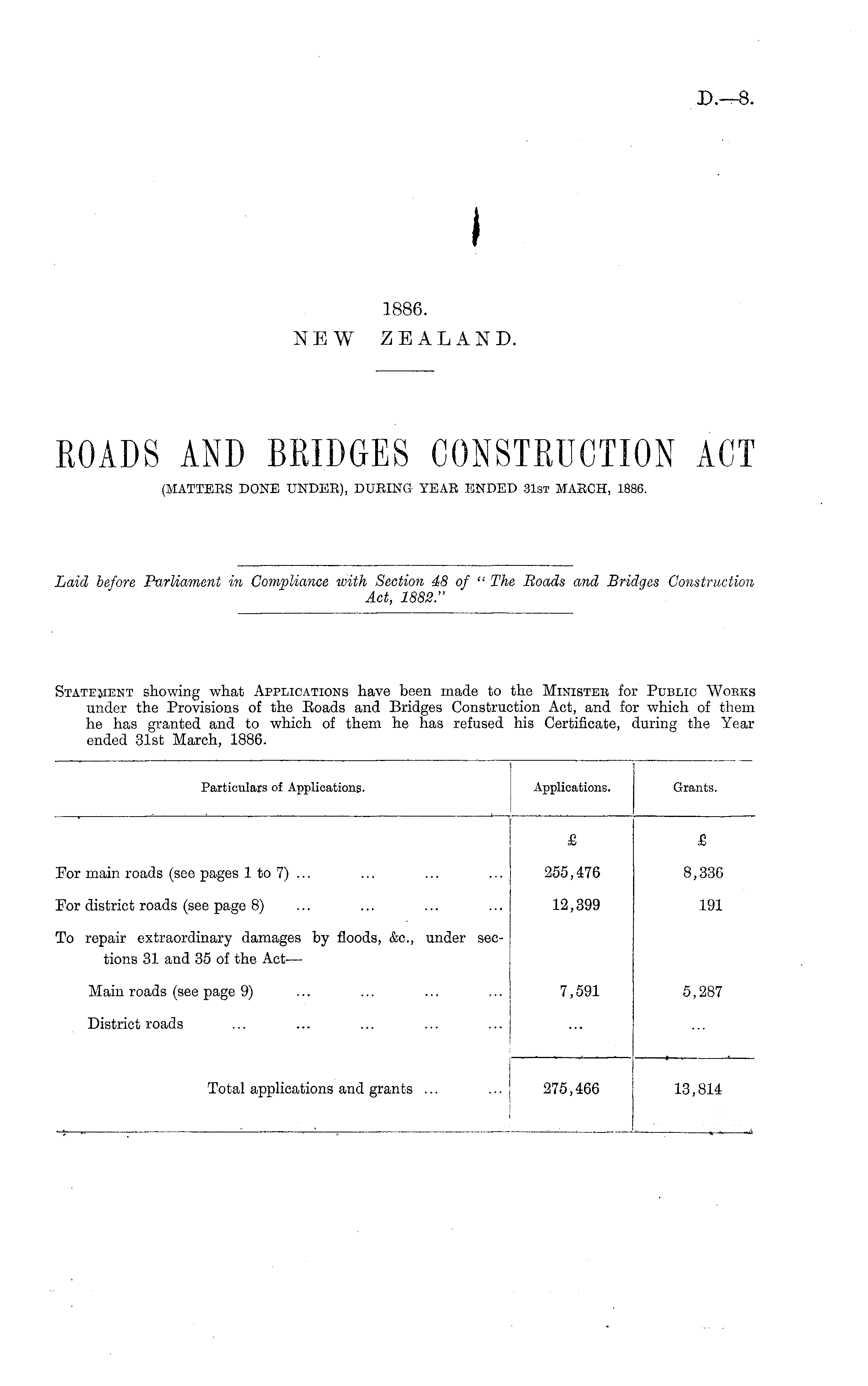 Particulars of Applications. Applications. Grants. £ £ For main roads (see pages 1 to 7) ... 255,476 8,336 For district roads (see page 8) 12,399 191 To repair extraordinary damages by floods, &c, under sections 31 and 35 of the Act— 7,591 5,287 Main roads (see page 9) District roads Total applications and grants ... 275,466 13,814