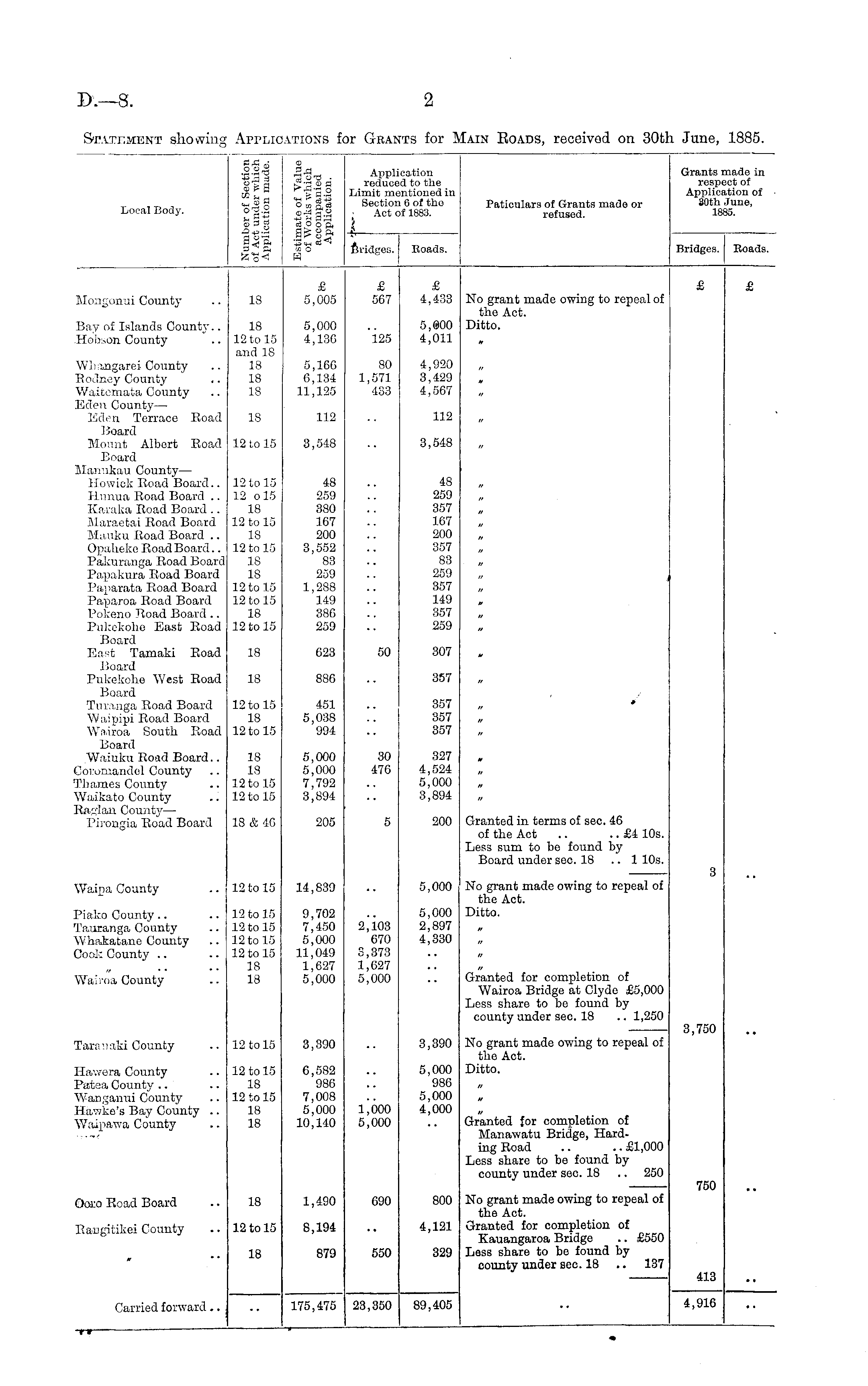 Local Bod} 7. in 111 o Of) ■2 r,aM d O Oft Application reduced to the Limit mentioned in Section 6 of the Act of 1883. 1 Paticulars of Grants made or refused. Grants made in respect of Application of ■ 30th June, 1885. 1° Bridges. Roads. Bridges. Roads. Mongonui County 18 £ 5,005 £ 567 £ 4,433 No grant made owing to repeal of the Act. Ditto. Bay of Islands County.. Hobson County 18 12 to 15 and IS 18 18 18 5,000 4,136 'l25 5,000 4,011 tf Wi>;mgarei County Rodney County Waitemata County Eden County— Eden Terrace Road Hoard Mount Albert Eoad Board llanukau County— Howick Road Board.. Hiinua Road Board .. Karaka Road Board .. Maraetai Road Board Mauku Road Board .. Opaheke Road Board.. Pakuranga Road Board Pa.pakura Road Board Paparata Road Board Paparoa Road Board Pokeno Road Board .. Pukekohe East Road Board East TamaM Road Board Pukekohe West Road Board Tuvanga Road Board Waipipi Road Board Wairoa South Road Board Waiuku Road Board.. Coromandol County Thames County Waikato County Rfl^'lan County— Pirongia Road Board 5,166 6,134 11,125 80 1,571 433 4,920 3,429 4,567 18 112 112 12 to IS 3,548 3,548 12 to 15 12 ol5 18 12 to 15 18 12 to 15 18 18 12 to 15 12 to 15 18 12 to 15 48 259 380 167 200 3,552 83 259 1,288 149 386 259 48 259 357 167 200 357 83 259 357 149 357 259 u 18 023 50 307 tf 18 880 357 12 to 15 18 12 to 15 451 5,038 994 357 357 357 / 18 18 12 to 15 12 to 15 5,000 5,000 7,792 3,894 30 476 327 4,524 5,000 3,894 * 18 & 40 205 5 200 Granted in terms of sec. 46 of the Act .. .. £4 10s. Less sum to be found by Board under sec. 18 .. 1 10s. Waipa County No grant made owing to repeal of the Act. Ditto. 12 to 15 14,839 5,000 Piako County Tauranga County Whakatano County Cook County 12 to 15 12 to 15 12 to 15 12 to 15 18 18 9,702 7,450 5,000 11,049 1,627 5,000 2,103 670 3,373 1,627 5,000 5,000 2,897 4,330 Waii-tia County Tanniaki County 3,390 Granted for completion of Wairoa Bridge at Clyde £5,000 Less share to be found by county under sec. 18 .. 1,250 No grant made owing to repeal of the Act. Ditto. 3,750 12 to 15 3,390 Hawera County Patea County .. Wanganui County Hawke's Bay County .. Waipawa County 12 to 15 18 12 to 15 18 18 6,582 986 7,008 5,000 10,140 1^000 5,000 5,000 986 5,000 4,000 Granted for completion of Manawatu Bridge, Harding Road .. ..£1,000 Less share to be found by county under sec. 18 .. 250 Ooro Road Board No grant made owing to repeal of the Act. Granted for completion of Kauangaroa Bridge .. £550 Less share to be found by county under sec. 18 .. 137 750 18 1,490 690 800 Rangitikei County 12 to 15 8,194 4,121 H '' 18 879 550 329 413 Carried forward.. 175,475 23,350 89,405 4,916