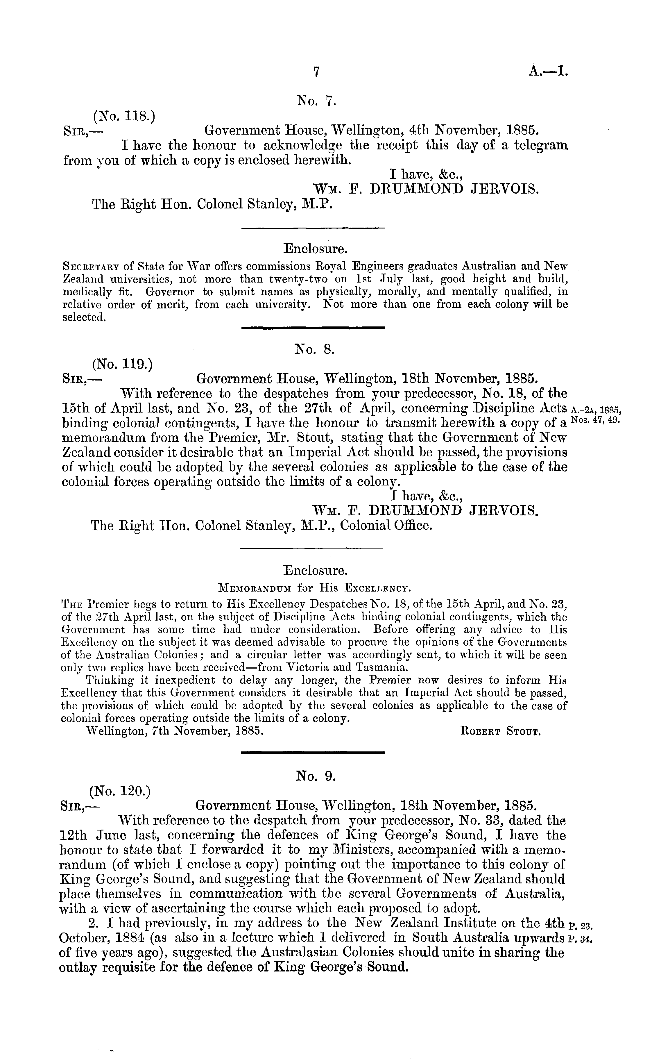 No. 7. (No. 118.) Sir, — Government House, Wellington, 4th November, 1885. I have the honour to acknowledge the receipt this day of a telegram from you of which a copy is enclosed herewith. I have, &c., Wm. E. DRUMMOND JERVOIS. The Right Hon. Colonel Stanley, M.P.