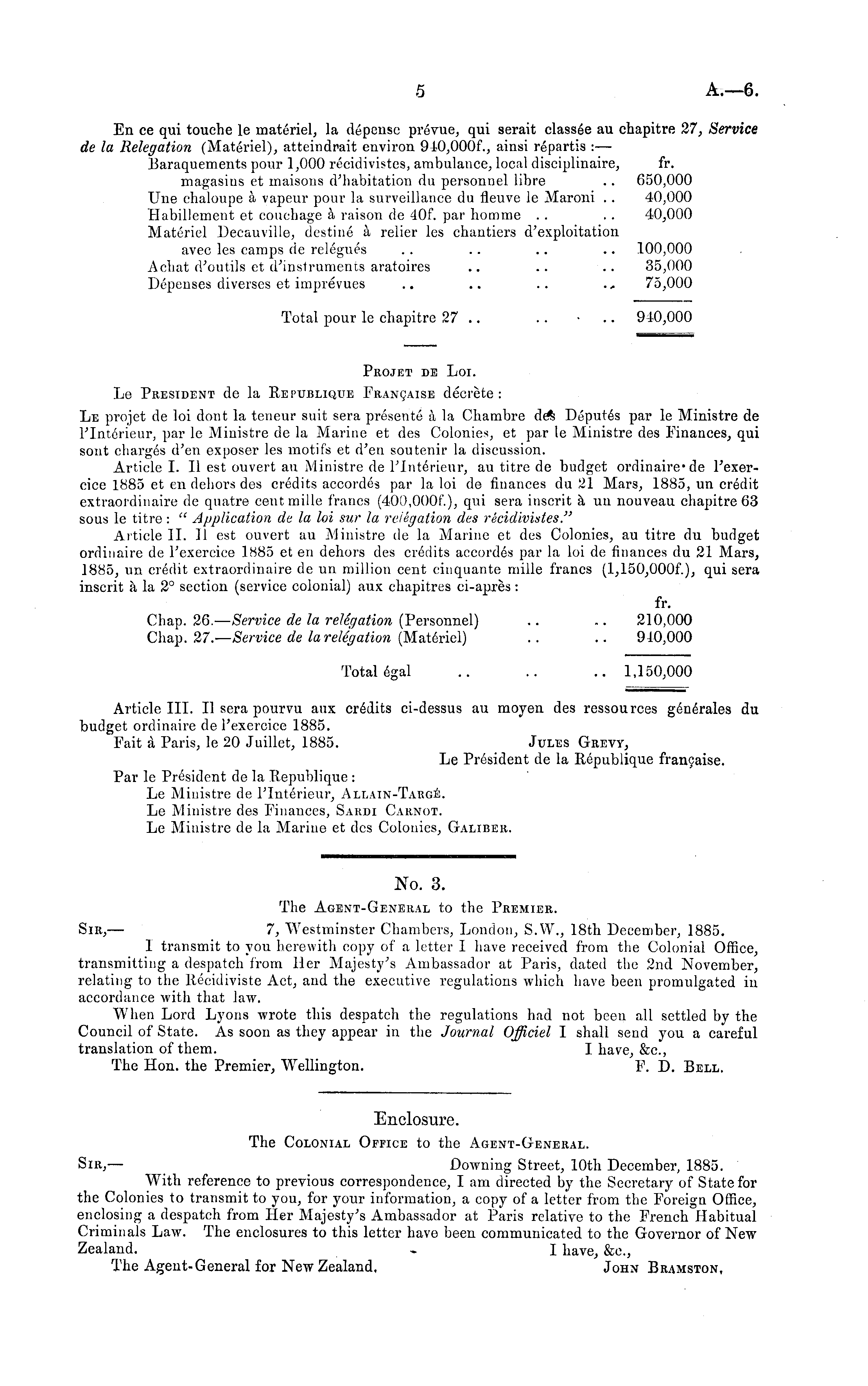 No. 3. The Agent-General to the Premier. Sir, — 7, Westminster Chambers, London, S.W., 18th December, 1885. 1 transmit to you herewith copy of a letter I have received from the Colonial Office, transmitting a despatch from Her Majesty's Ambassador at Paris, dated the 2nd November, relating to the Recidiviste Act, and the executive regulations which have been promulgated in accordance with that law. When Lord Lyons wrote this despatch the regulations had not been all settled by the Council of State. As soon as they appear in the Journal Officiel I shall send you a careful translation of them. I have, &c, The Hon. the Premier, Wellington. F. D. Bell.