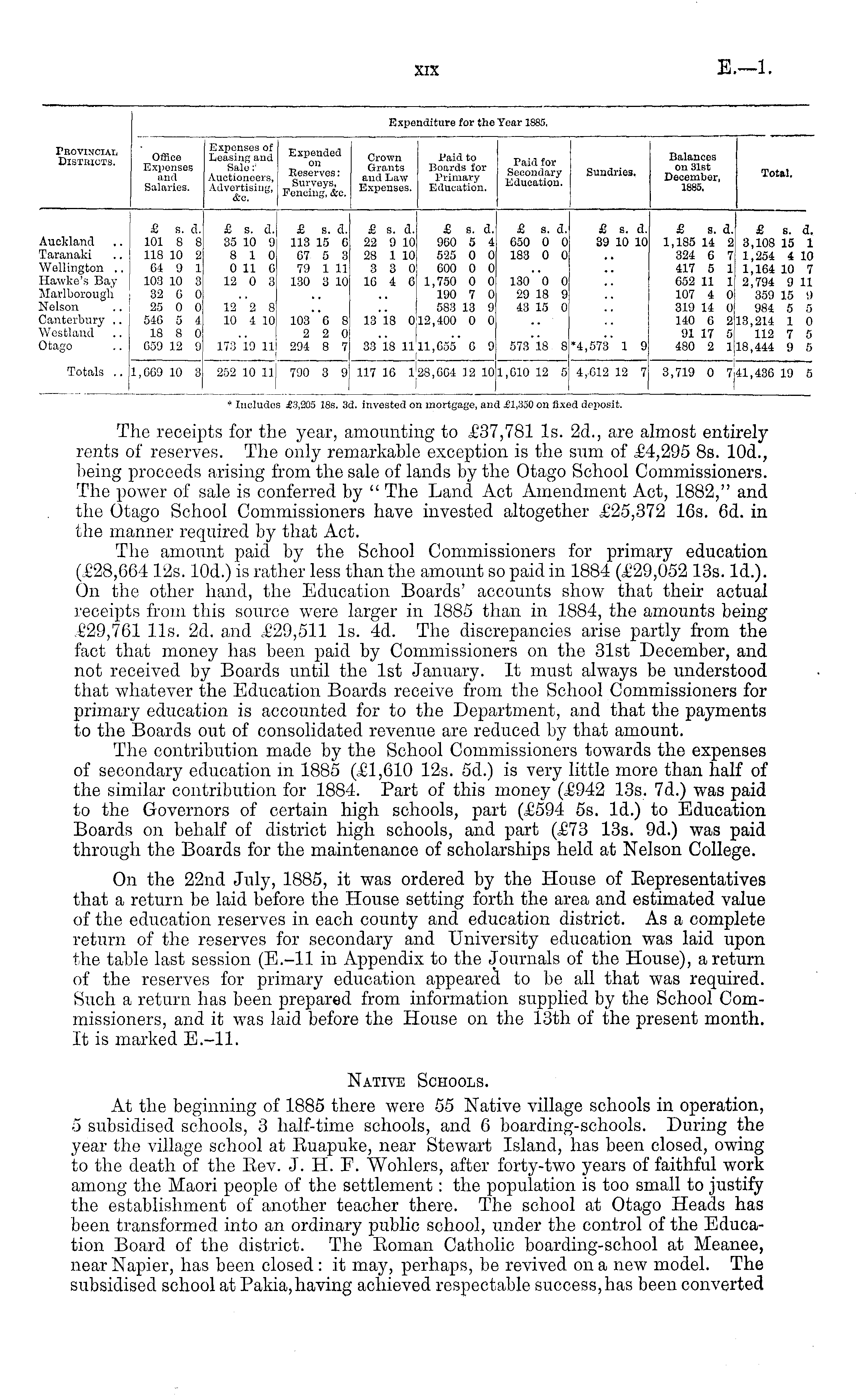Provincial Districts. Office Expenses and Salaries. S'LSf upended Auctioneers, r o v v e & s: Advertising, Fe^™%. Crown Grants and Law Expenses. Paid to Boards for Primary Education. Paid for Secondary Education. Sundries. Balances on 31st December, 1885. Total. Auckland Taranaki Wellington .. Hawke's Bay Marlboi'ougU Nelson Canterbury ,. Wcsfclancl Otago £ s. a. 101 8 8 118 10 2 64 9 1 103 10 3 32 G 0 25 0 0 546 5 4 18 8 0 659 12 9 £ s. a. 35 10 9 8 10 0 11 6 12 0 3 £ s. a. 113 15 6 G7 5 3 79 1 11 130 3 10 £ s. a. 22 9 10 28 1 10 3 3 O 1 1G 4 6 £ s. a. 960 5 4 525 0 0 600 0 0 1,750 0 0 190 7 0 583 13 9 12,400 0 0 £ s. a. G50 0 0 183 0 0 £ s. d. 39 10 10 £ s. d. 1,185 14 2 324 6 7 417 5 1 C52 11 1 107 4 o! 319 14 0: 140 G 2' 91 17 5 480 2 T £ s. a. 3,108 15 1 1,254 4 10 1,164 10 7 2,794 9 11 359 15 9 984 5 5 il3,214 1 0 112 7 6 18,444 9 6 130 0 0 29 18 9 43 15 0 12"2 8 10 4 10 103 6 8 2 2 0 294 8 7 13 18 0 173 19 11 8318 11 11,055' G 9 573 18 8 *4,573 1 0 Totals .. ! 117 1G l' i '28,GG4 12 10 1,669 10 3 252 10 11 790 3 9 1,010 12 5 4,612 12 7 3,719 0 7 41,430 19 5 ♦ Includes £3,205 18s. 3d. invested oi mortgage, and £1,350 on fixed deposit.