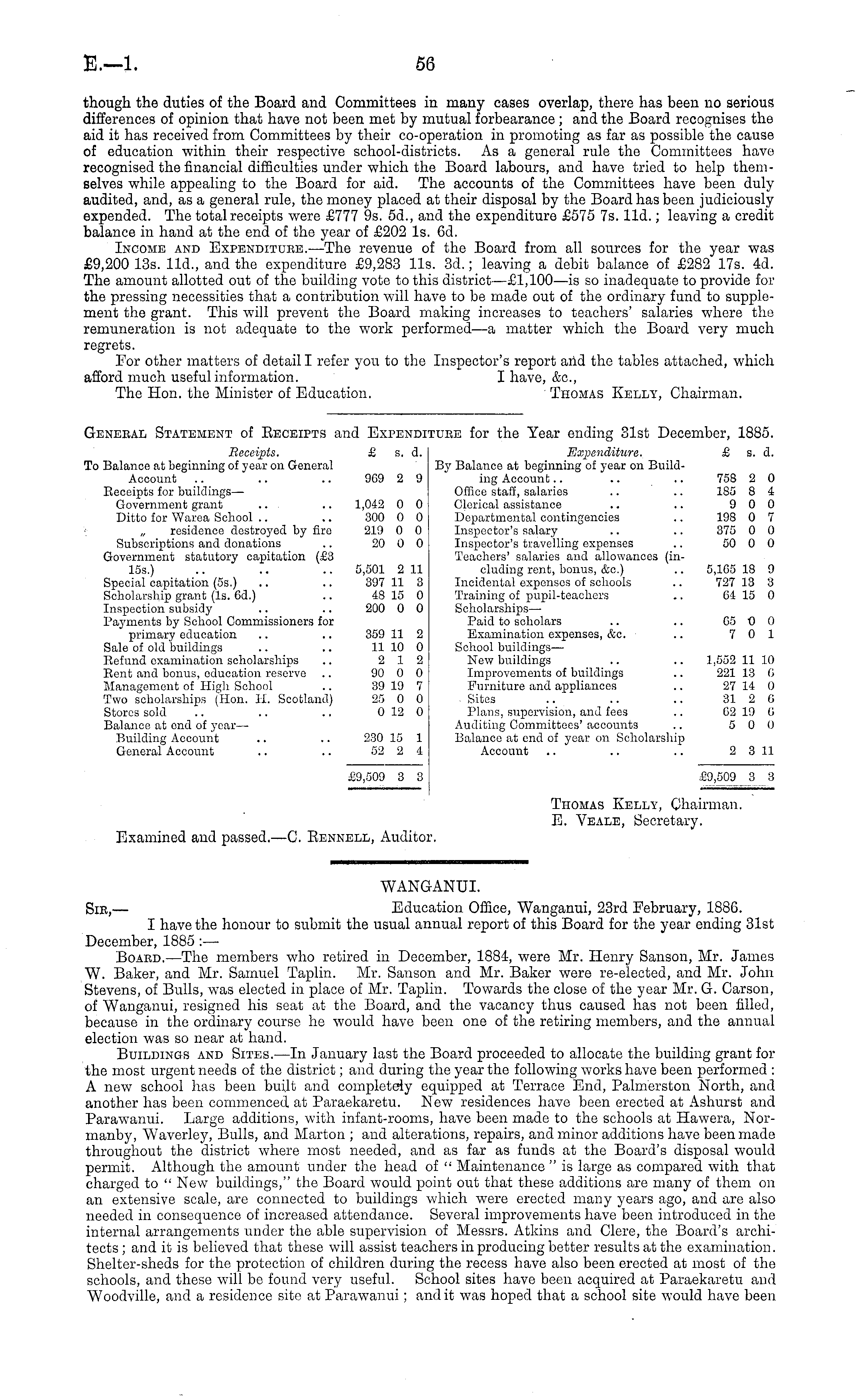 WANGANUI. Sic, — Education Office, Wanganui, 23rd February, 188 G. I have the honour to submit the usual annual report of this Board for the year ending 31st December, 1885 :— Boaed.—The members who retired in December, 1884, were Mr. Henry Sanson, Mr. James W. Baker, and Mr. Samuel Taplin. Mr. Sanson and Mr. Baker were re-elected, and Mr. John Stevens, of Bulls, was elected in place of Mr. Taplin. Towards the close of the year Mr. G. Carson, of Wanganui, resigned his seat at the Board, and the vacancy thus caused has not been filled, because in the ordinary course he would have been one of the retiring members, and the annual election was so near at hand. Buildings and Sites.—ln January last the Board proceeded to allocate the building grant for the most urgent needs of the district; and during the year the following works have been performed : A new school has been built and completely equipped at Terrace End, Palmerston North, and another has been commenced at Paraekaretu. New residences have been erected at Ashurst and Parawanui. Large additions, with infant-rooms, have been made to the schools at Hawera, Normanby, Waverley, Bulls, and Marton ; and alterations, repairs, and minor additions have been made throughout the district where most needed, and as far as funds at the Board's disposal would permit. Although the amount under the head of " Maintenance "is large as compared with that charged to " New buildings," the Board would point out that these additions are many of them on an extensive scale, are connected to buildings which were erected many years ago, and are also needed in consequence of increased attendance. Several improvements have been introduced in the internal arrangements under the able supervision of Messrs. Atkins and Clere, the Board's architects ; and it is believed that these will assist teachers in producing better results at the examination. Shelter-sheds for the protection of children during the recess have also been erected at most of the schools, and these will bo found very useful. School sites have been acquired at Paraekaretu and Woodville, and a residence site at Parawanui; and it was hoped that a school site would have been