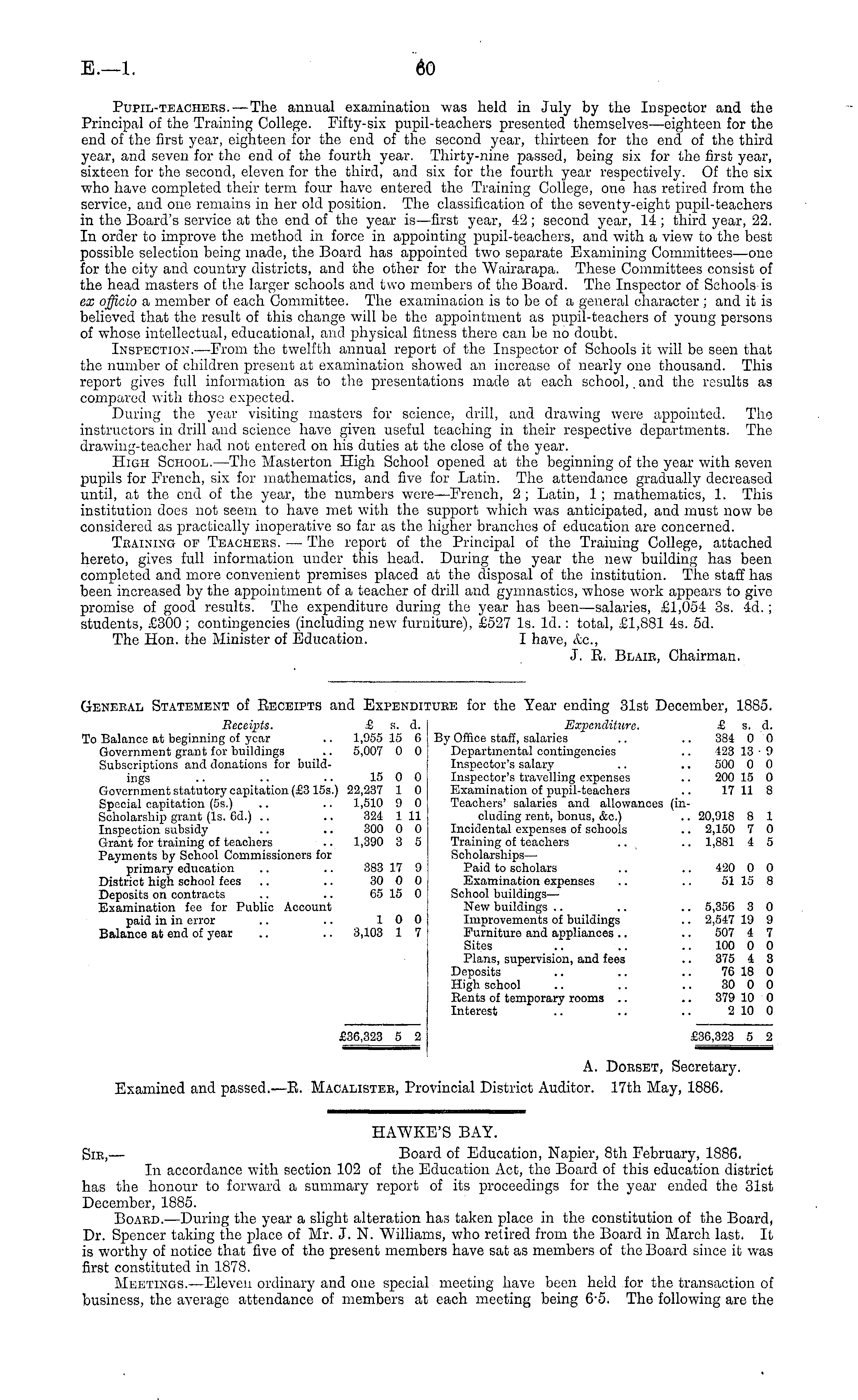 HAWKE'S BAY. Sir, — Board of Education, Napier, Bth February, 1886. In accordance with section 102 of the Education Act, the Board of this education district has the honour to forward a summary report of its proceedings for the year ended the 31st December, 1885. Board.—During the year a slight alteration has taken place in the constitution of the Board, Dr. Spencer taking the place of Mr. J. N. Williams, who retired from the Board in March last. It is worthy of notice that five of the present members have sat as members of the Board since it was first constituted in 1878. Meetings.—Eleven ordinary and one special meeting have been held for the transaction of business, the average attendance of members at each meeting being 6-5. The following are the