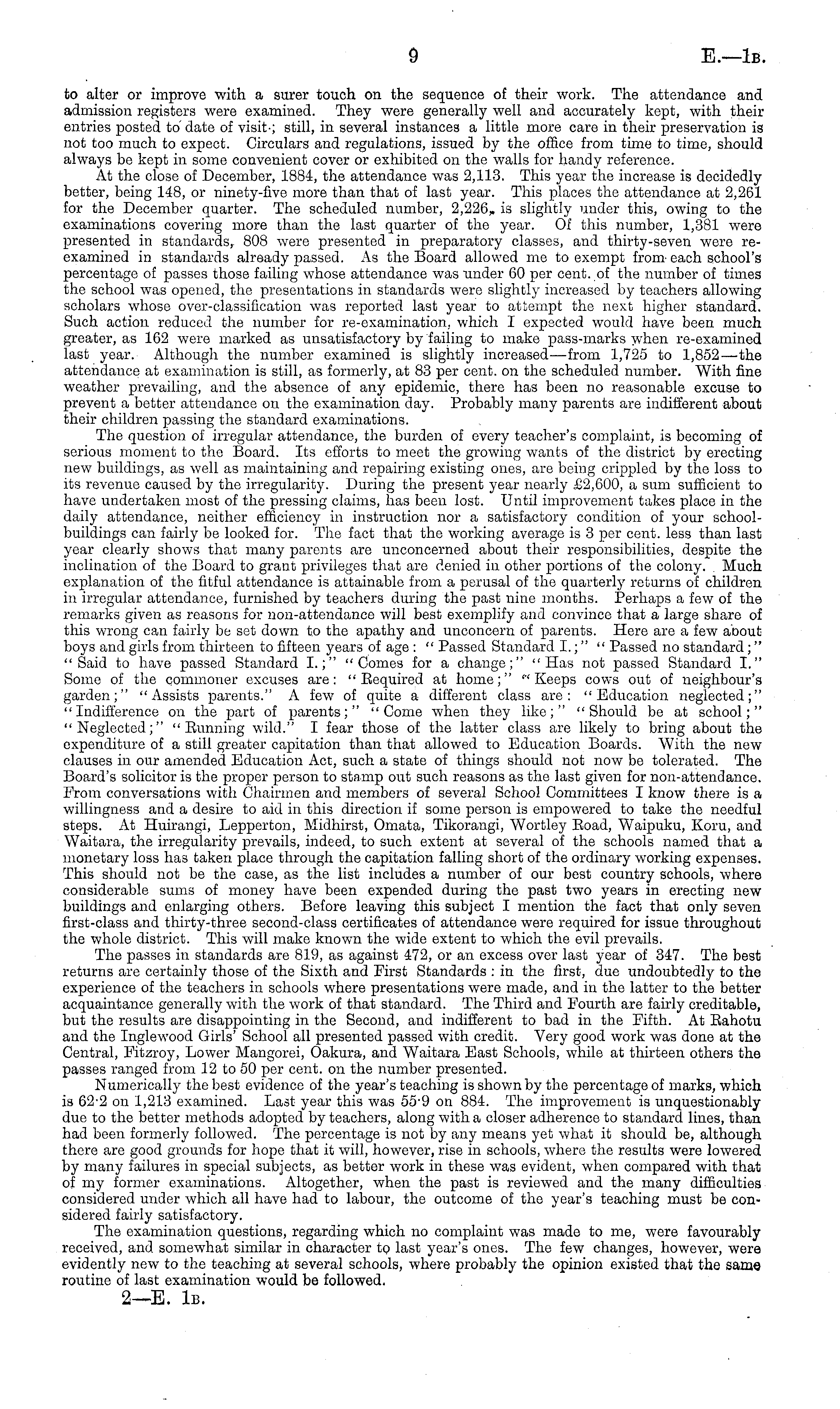 to alter or improve with a surer touch on the sequence of their work. The- attendance and admission registers were examined. They were generally well and accurately kept, with their entries posted to date of visit-; still, in several instances a little more care in their preservation is not too much to expect. Circulars and regulations, issued by the office from time to time, should always be kept in some convenient cover or exhibited on the walls for handy reference. At the close of December, 1884, the attendance was 2,113. This year the increase is decidedly better, being 148, or ninety-five more than that of last year. This places the attendance at 2,261 for the December quarter. The scheduled number, 2,226, is slightly under this, owing to the examinations covering more than the last quarter of the year. Of this number, 1,381 were presented in standards,. 808 were presented in preparatory classes, and thirty-seven were reexamined in standards already passed. As the Board allowed me to exempt from each school's percentage of passes those failing whoso attendance was nnder 60 per cent, of the number of times the school was opened, the presentations in standards were slightly increased by teachers allowing scholars whose over-classification was reported last year to attempt the next higher standard. Such action reduced the number for re-examination, which I expected would have been much greater, as 162 were marked as unsatisfactory by failing to make pass-marks when re-examined last year. Although the number examined is slightly increased—from 1,725 to 1,852 —the attendance at examination is still, as formerly, at 83 per cent, on the scheduled number. With fine weather prevailing, and the absence of any epidemic, there has been no reasonable excuse to prevent a better attendance on the examination day. Probably many parents are indifferent about their children passing the standard examinations. The question of irregular attendance, the burden of every teacher's complaint, is becoming of serious moment to the Board. Its efforts to meet the growing wants of the district by erecting new buildings, as well as maintaining and repairing existing ones, are being crippled by the loss to its revenue caused by the irregularity. During the present year nearly £2,600, a sum sufficient to have undertaken most of the pressing claims, has been lost. Until improvement takes place in the daily attendance, neither efficiency in instruction nor a satisfactory condition of your schoolbuildings can fairly bo looked for. The fact that the working average is 3 per cent, less than last year clearly shows that many parents are unconcerned about their responsibilities, despite the inclination of the Board to grant privileges that are denied in other portions of the colony. Much explanation of the fitful attendance is attainable from a perusal of the quarterly returns of children in irregular attendance, furnished by teachers during the past nine mouths. Perhaps a few of the remarks given as reasons for non-attendance will best exemplify and convince that a largo share of this wrong can fairly be set down to the apathy and unconcern of parents. Here are a few about boys and girls from thirteen to fifteen years of age : " Passed Standard I.; " " Passed no standard ; " "Said to have passed Standard I.;" "Comes for a change;" "Has not passed Standard I." Some of the commoner excuses are: " Eequired at home;" " Keeps cows out of neighbour's garden;" "Assists parents." A few of quite a different class are: "Education neglected;" "Indifference on the part of parents;" "Come when they like;" "Should be at school;" "Neglected;" "Running wild." I fear those of the latter class are likely to bring about the expenditure of a still greater capitation than that allowed to Education Boards. With the new clauses in our amended Education Act, such a state of things should not now be tolerated. The Board's solicitor is the proper person to stamp out such reasons as the last given for non-attendance. From conversations with Chairmen and members of several School Committees I know there is a willingness and a desire to aid ill this direction if some person is empowered to take the needful steps. At Huirangi, Lepperton, Midhirst, Omata, Tikorangi, Wortley Eoad, Waipuku, Koru, and Waitara, the irregularity prevails, indeed, to such extent at several of the schools named that a monetary loss has taken place through the capitation falling short of the ordinary working expenses. This should not be the case, as the list includes a number of our best country schools, where considerable sums of money have been expended during the past two years in erecting new buildings and enlarging others. Before leaving this subject I mention the fact that only seven first-class and thirty-three second-class certificates of attendance were required for issue throughout the whole district. This will make known the wide extent to which the evil prevails. The passes in standards are 819, as against 472, or an excess over last year of 347. The best returns are certainly those of the Sixth and First Standards :in the first, due undoubtedly to the experience of the teachers in schools where presentations were made, and in the latter to the better acquaintance generally with the work of that standard. The Third and Fourth are fairly creditable, but the results are disappointing in the Second, and indifferent to bad in the Fifth. At Eahotu and the Inglewood Girls' School all presented passed with credit. Very good work was done at the Central, Fitzroy, Lower Mangorei, Oakura, and Waitara East Schools, while at thirteen others the passes ranged from 12 to 50 per cent, on the number presented. Numerically the best evidence of the year's teaching is shown by the percentage of marks, which is 622 on 1,213 examined. Last year this was 559 on 884. The improvement is unquestionably due to the better methods adopted by teachers, along with a closer adherence to st