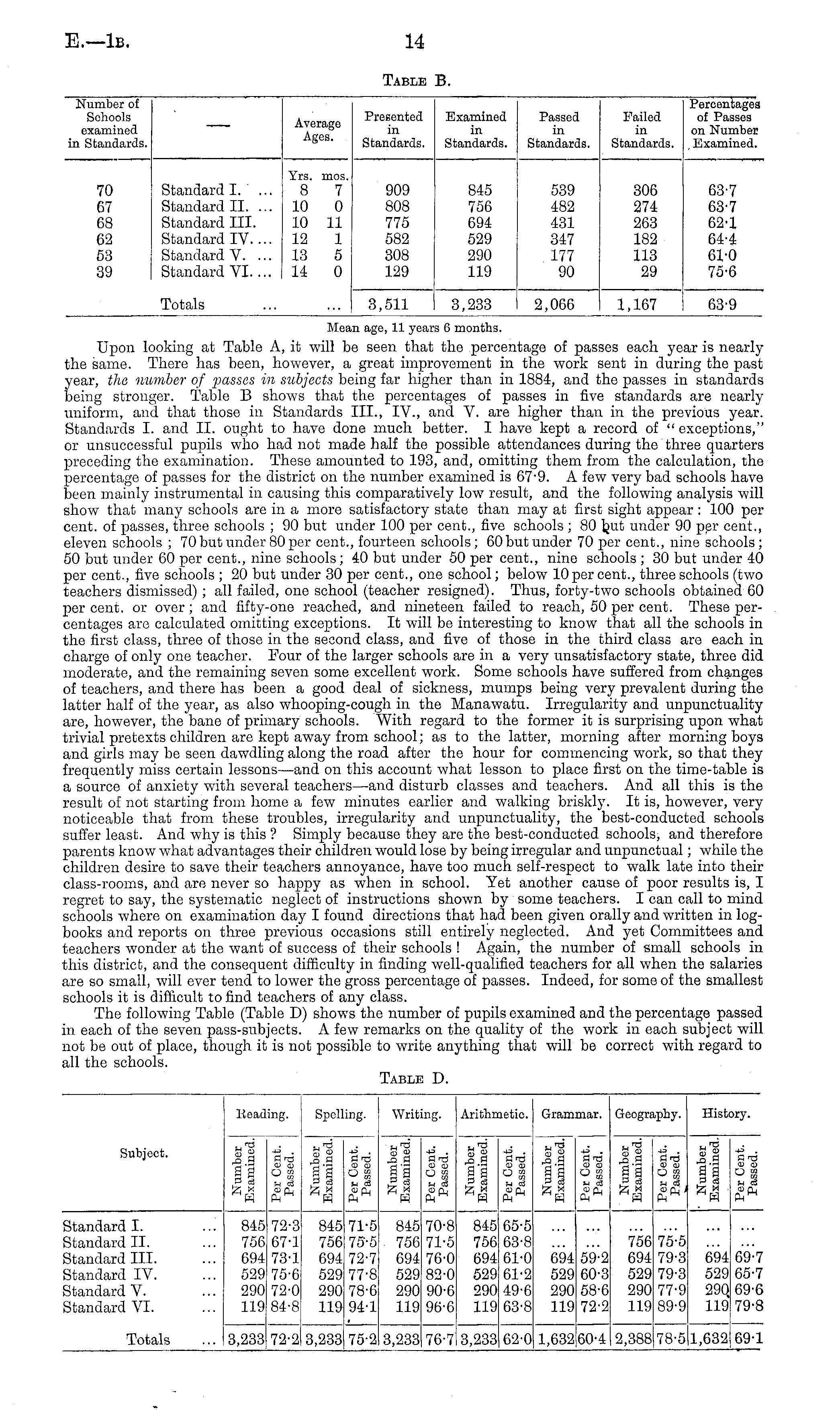 Mean ago, 11 years G months. "Upon looking at Table A, it will be seen that the percentage of passes each year is nearly the same. There has been, however, a great improvement in the work sent in during the past year, the number of passes in subjects being far higher than in 1884, and the passes in standards being stronger. Table B shows that the percentages of passes in five standards are nearly uniform, and that those in Standards 111., IV., and V. are higher than in the previous year. Standards I. and 11. ought to have done much better. I have kept a record of " exceptions," or unsuccessful pupils who had not made half the possible attendances during the three quarters preceding the examination. These amounted to 193, and, omitting them from the calculation, the percentage of passes for the district on the number examined is 679. A few very bad schools have been mainly instrumental in causing this comparatively low result, and the following analysis will show that many schools are in a more satisfactory state than may at first sight appear : 100 per cent, of passes, three schools ; 90 but under 100 per cent., five schools ; 80 but under 90 per cent., eleven schools ; 70 but under 80 per cent., fourteen schools; 60 but under 70 per cent., nine schools; 50 but under 60 per cent., nine schools; 40 but under 50 per cent., nine schools ; 30 but under 40 per cent., five schools ; 20 but under 30 per cent., one school; below 10 per cent., three schools (two teachers dismissed) ; all failed, one school (teacher resigned). Thus, forty-two schools obtained 60 per cent, or over ; and fifty-one reached, and nineteen failed to reach, 50 per cent. These percentages are calculated omitting exceptions. It will be interesting to know that all the schools in the first class, three of those in the second class, and five of those in the third class are each in charge of only one teacher. Four of tho larger schools are in a very unsatisfactory state, three did moderate, and the remaining seven some excellent work. Some schools have suffered from changes of teachers, and there has been a good deal of sickness, mumps being very prevalent during the latter half of the year, as also whooping-cough in the Manawatu. Irregularity and unpunctuality are, however, the bane of primary schools. With regard to the former it is surprising upon what trivial pretexts children are kept away from school; as to the latter, morning after morning boys and girls may be seen dawdling along the road after the hour for commencing work, so that they frequently miss certain lessons—and on this account what lesson to place first on the time-table is a source of anxiety with several teachers—and disturb classes and teachers. And all this is the result of not starting from home a few minutes earlier and walking briskly. It is, however, very noticeable that from those troubles, irregularity and unpunctuality, the best-conducted schools suffer least. And why is this ? Simply because they are tho best-conducted schools, and therefore parents know what advantages their children would lose by being irregular and unpunctual; while the children desire to save their teachers annoyance, have too much self-respect to walk late into their class-rooms, and are never so happy as when in school. Yet another cause of poor results is, I regret to say, the systematic neglect of instructions shown by some teachers. I can call to mind schools where on examination day I found directions that had been given orally and written in logbooks and reports on three previous occasions still entirely neglected. And yet Committees and teachers wonder at the want of success of their schools ! Again, the number of small schools in this district, and the consequent difficulty in finding well-qualified teachers for all when the salaries are so small, will ever tend to lower the gross percentage of passes. Indeed, for some of the smallest schools it is difficult to find teachers of any class. The following Table (Table D) shows the number of pupils examined and the percentage passed in each of the seven pass-subjects. A few remarks on the quality of the work in each subject will not be out of place, though it is not possible to write anything that will be correct with regard to all the schools.