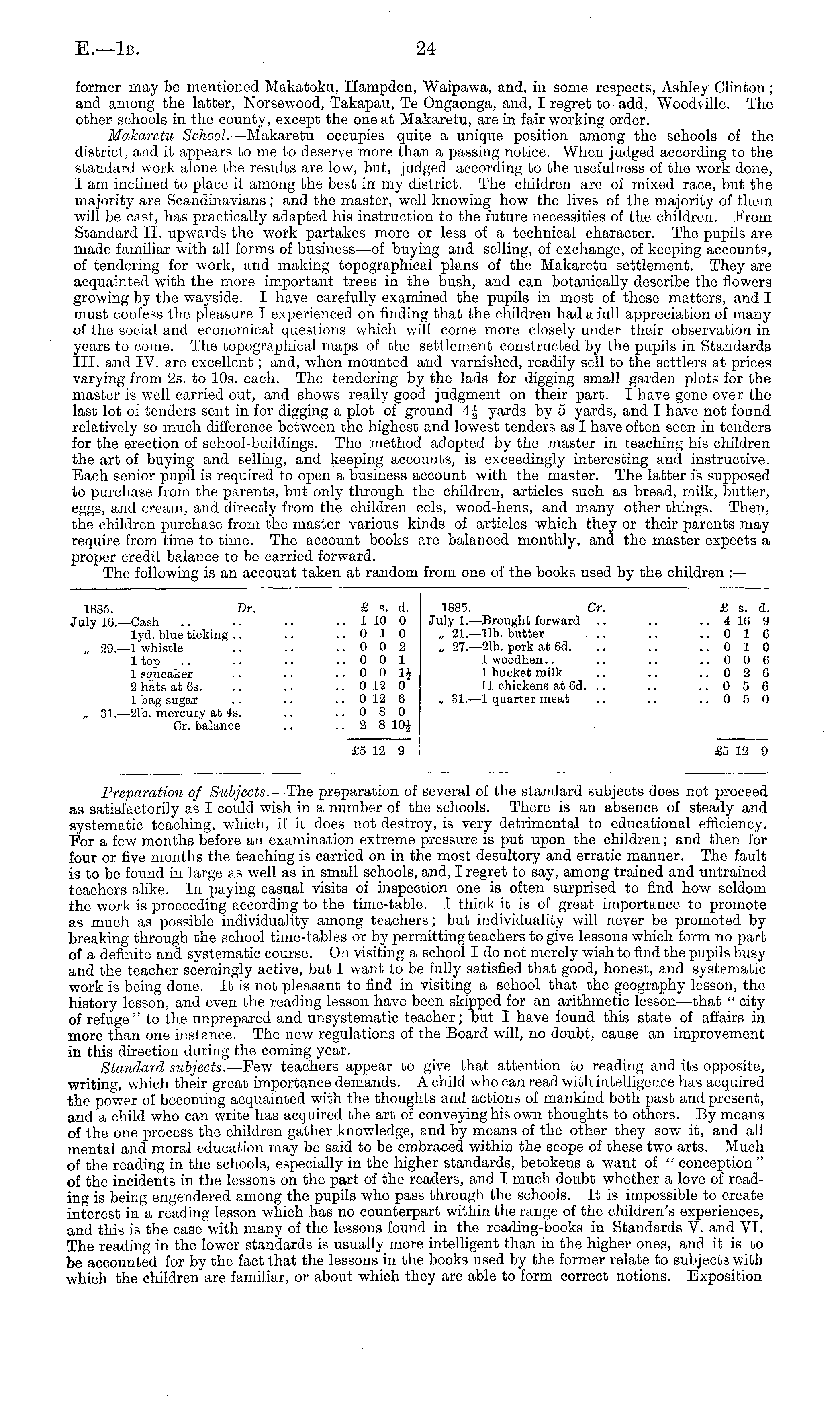 former may be mentioned Makatoku, Hampden, Waipawa, and, in some respects, Ashley Clinton; and among the latter, Norsewood, Takapau, Te Ongaonga, and, I regret to add, Woodville. The other schools in the county, except the one at Makaretu, are in fair working order. Makaretu School. —Makaretu occupies quite a unique position among the schools of the district, and it appears to me to deserve more than a passing notice. When judged according to the standard work alone the results are low, but, judged according to the usefulness of the work done, lam inclined to place it among the best in my district. The children are of mixed race, but the majority are Scandinavians; and the master, well knowing how the lives of the majority of them will be cast, has practically adapted his instruction to the future necessities of the children. From Standard 11. upwards the work partakes more or less of a technical character. The pupils are made familiar with all forms of business—of buying and selling, of exchange, of keeping accounts, of tendering for work, and making topographical plans of the Makaretu settlement. They are acquainted with the more important trees in the bush, and can botanically describe the flowers growing by the wayside. I have carefully examined the pupils in most of these matters, and I must confess the pleasure I experienced on finding that the children had a full appreciation of many of the social and economical questions which will come more closely under their observation in years to come. The topographical maps of the settlement constructed by the pupils in Standards 111. and IV. are excellent; and, when mounted and varnished, readily sell to the settlers at prices varying from 2s. to 10s. each. The tendering by the lads for digging small garden plots for the master is well carried out, and shows really good judgment on their part. I have gone over the last lot of tenders sent in for digging a plot of ground 4-J- yards by 5 yards, and I have not found relatively so much difference between the highest and lowest tenders as I have often seen in tenders for the erection of school-buildings. The method adopted by the master in teaching his children the art of buying and selling, and keeping accounts, is exceedingly interesting and instructive. Each senior pupil is required to open a business account with the master. The latter is supposed to purchase from the parents, but only through the children, articles such as bread, milk, butter, eggs, and cream, and directly from the children eels, wood-hens, and many other things. Then, the children purchase from the master various kinds of articles which they or their parents may require from time to time. The account books are balanced monthly, and the master expects a proper credit balance to be carried forward. The following is an account taken at random from one of the books used by the children : —