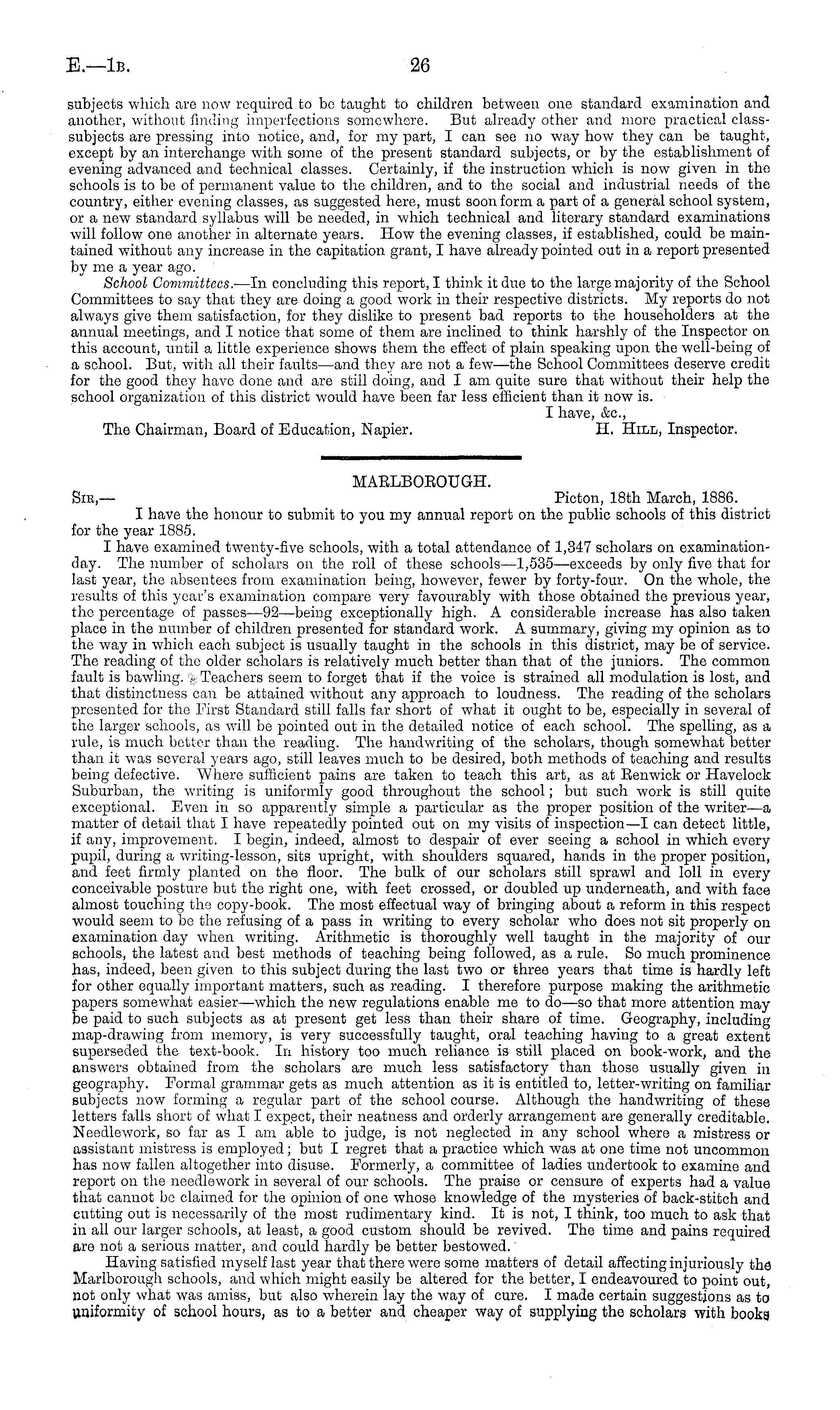 MARLBOBOUGH. Sib, — Picton, 18th March, 1886. I have the honour to submit to you my annual report on the public schools of this district for the year 1885. I have examined twenty-five schools, with a total attendance of 1,347 scholars on examinationday. The number of scholars on the roll of these schools—l,s3s —exceeds by only five that for last year, the absentees from examination being, however, fewer by forty-four. On the whole, the results of this year's examination compare very favourably with those obtained the previous year, the percentage of passes —92—being exceptionally high. A considerable increase has also taken place in the number of children presented for standard work. A summary, giving my opinion as to the way in which each subject is usually taught in the schools in this district, may be of service. The reading of the older scholars is relatively much better than that of the juniors. The common fault is bawling. > Teachers seem to forget that if the voice is strained all modulation is lost, and that distinctness can bo attained without any approach to loudness. The reading of the scholars presented for the First Standard still falls far short of what it ought to be, especially in several of the larger schools, as will be pointed out in the detailed notice of each school. The spelling, as a rule, is much better than the reading. The handwriting of the scholars, though somewhat better than it was several years ago, still leaves much to bo desired, both methods of teaching and results being defective. Where sufficient pains are taken to teach this art, as at Eenwick or Havelock Suburban, the writing is uniformly good throughout the school; but such work is still quite exceptional. Even in so apparently simple a particular as the proper position of the writer—a matter of detail that I have repeatedly pointed out on my visits of inspection—l can detect little, if any, improvement. I begin, indeed, almost to despair of ever seeing a school in which every pupil, during a writing-lesson, sits upright, with shoulders squared, hands in the proper position, and feet firmly planted on the floor. The bulk of our scholars still sprawl and 101 lin every conceivable posture but the right one, with feet crossed, or doubled up underneath, and with face almost touching the copy-book. The most effectual way of bringing about a reform in this respect would seem to be the refusing of a pass in writing to every scholar who does not sit properly on examination day when writing. Arithmetic is thoroughly well taught in the majority of our schools, the latest and best methods of teaching being followed, as a rule. So much prominence has, indeed, been given to this subject during the last two or three years that time is hardly left for other equally important matters, such as reading. I therefore purpose making the arithmetic papers somewhat easier—which the new regulations enable me to do —so that more attention may be paid to such subjects as at present get less than their share of time. Geography, including map-drawing from memory, is very successfully taught, oral teaching having to a great extent superseded the text-book. In history too much reliance is still placed on book-work, and the answers obtained from the scholars are much less satisfactory than those usually given in geography. Formal grammar gets as much attention as it is entitled to, letter-writing on familiar subjects now forming a regular part of the school course. Although the handwriting of these letters falls short of what I expect, their neatness and orderly arrangement are generally creditable. Needlework, so far as I am able to judge, is not neglected in any school where a mistress or assistant mistress is employed; but I regret that a practice which was at one time not uncommon has now fallen altogether into disuse. Formerly, a committee of ladies undertook to examine and report on the needlework in several of our schools. The praise or censure of experts had a value that cannot bo claimed for the opinion of one whose knowledge of the mysteries of back-stitch and cutting out is necessarily of the most rudimentary kind. It is not, I think, too much to ask that in all our larger schools, at least, a good custom should be revived. The time and pains required are not a serious matter, and could hardly be better bestowed. Having satisfied myself last year that there were some matters of detail affecting injuriously the Marlborough schools, and which might easily be altered for the better, I endeavoured to point out, not only what was amiss, but also wherein lay the way of cure. I made certain suggestions as to uniformity of school hours, as to a better and cheaper way of supplying the scholars with bookg
